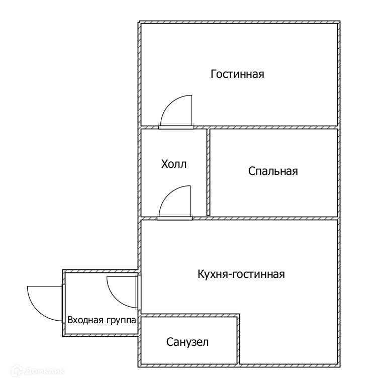 Входная группа, кухня-гостинная, зал, спальная комната, санузел.