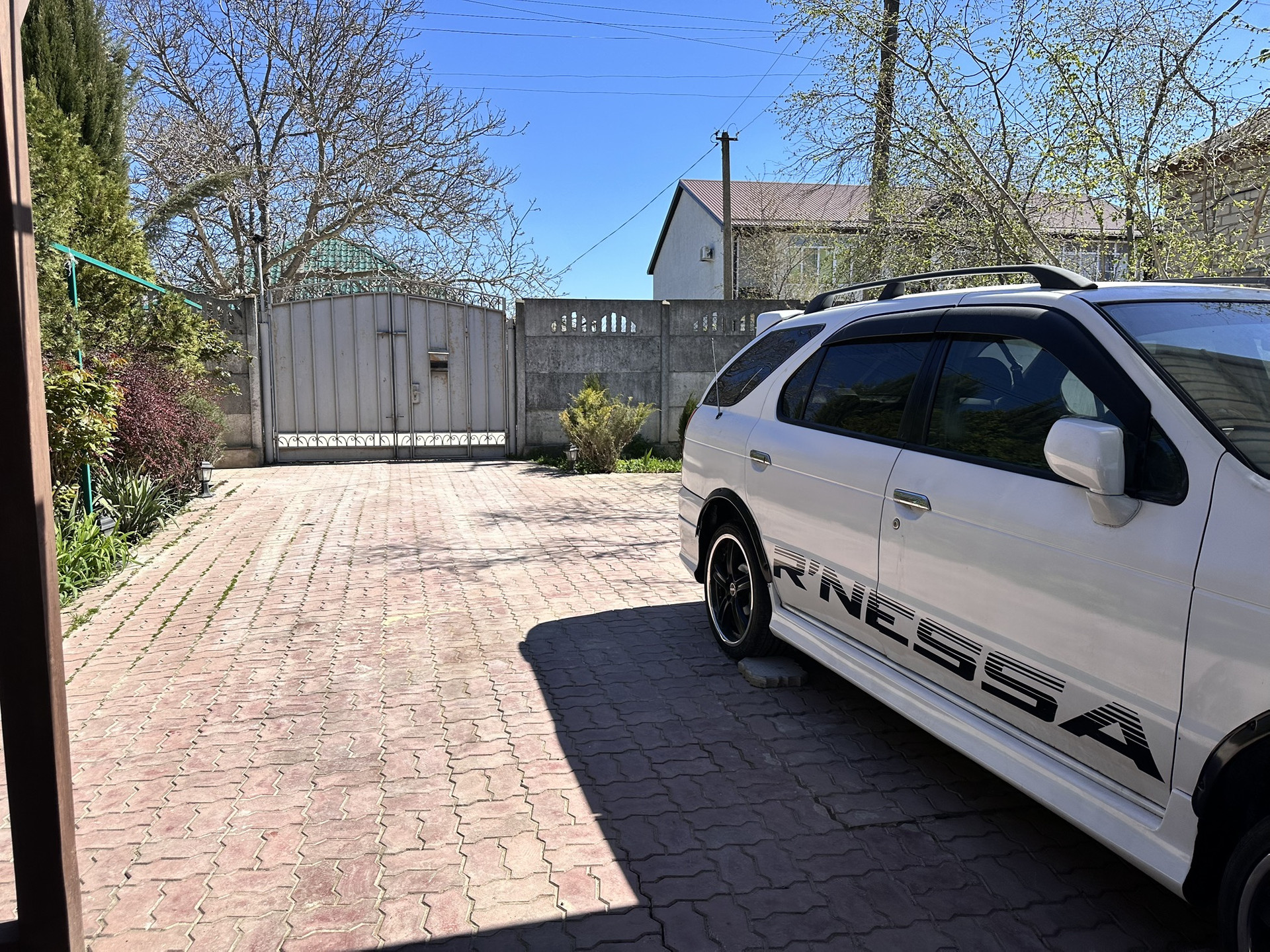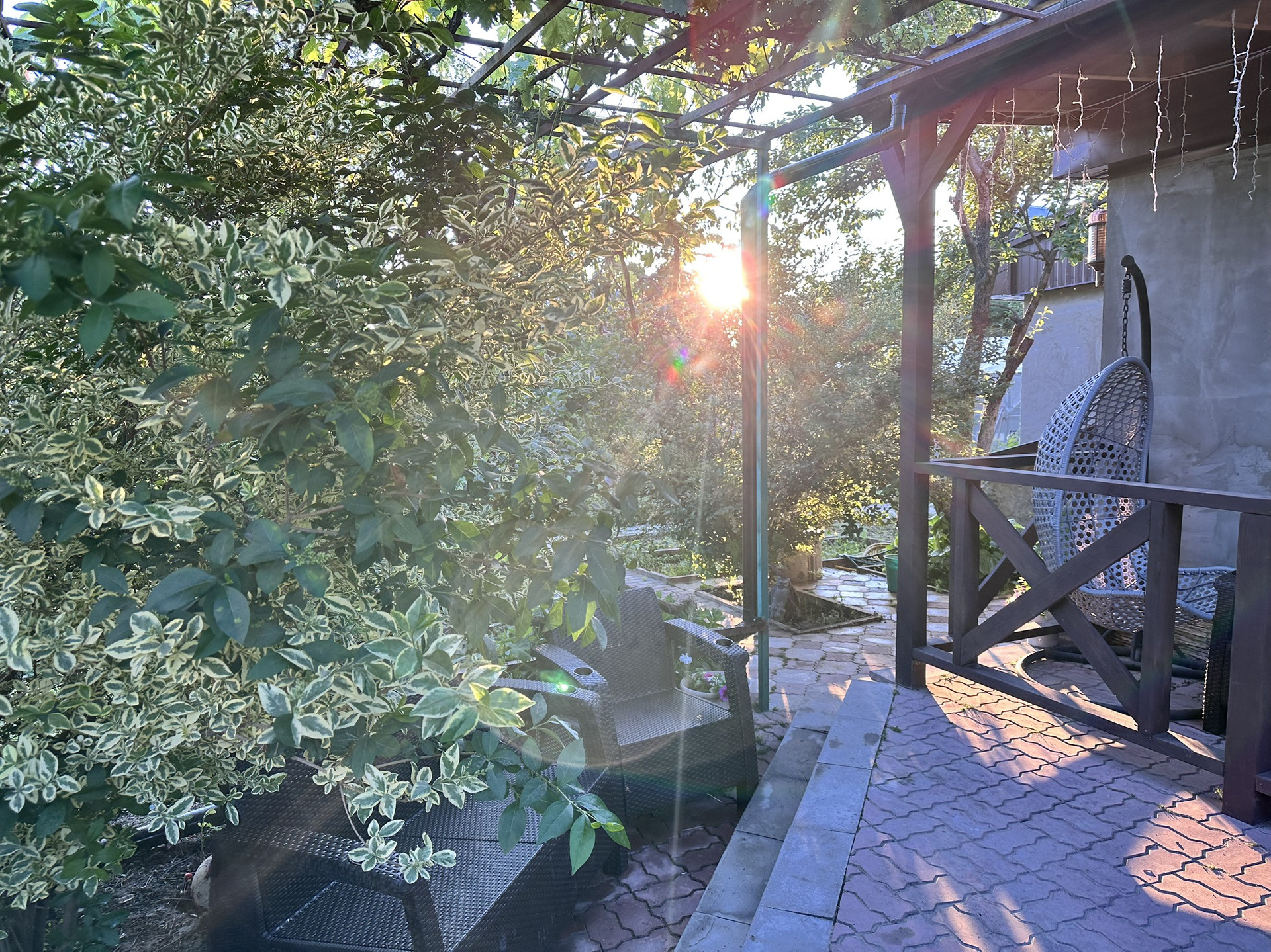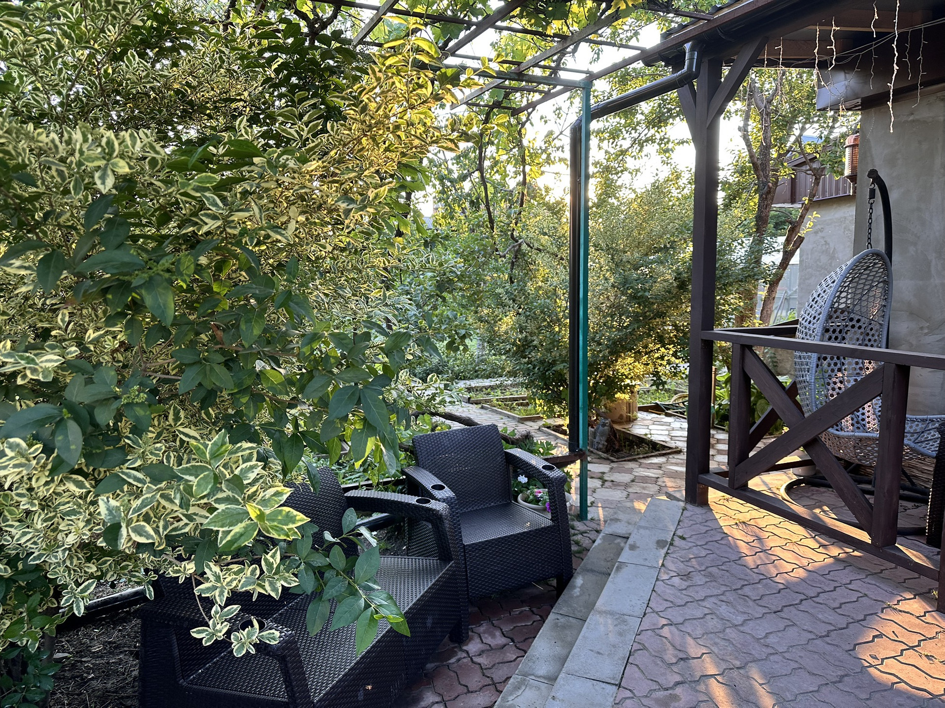 Передний двор - уютная терраса, батут, 5 парковочных мест, виноград, хвойные деревья, барбарис, розы, гортензия и многие другие растения.