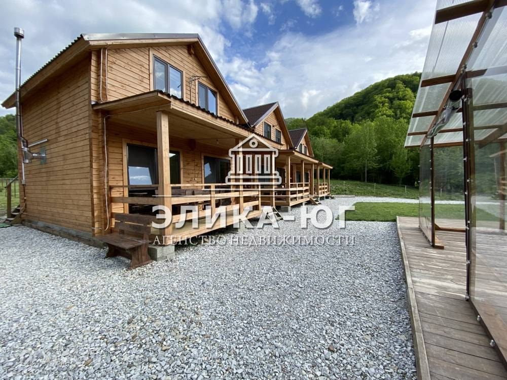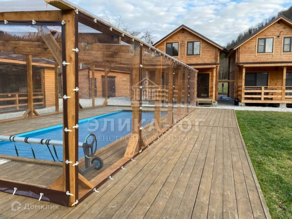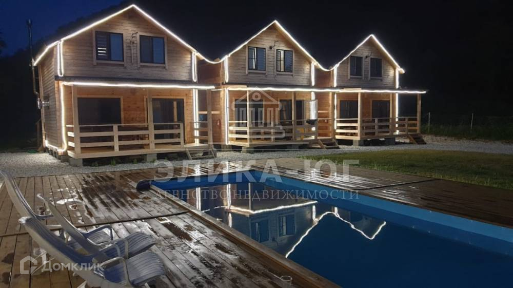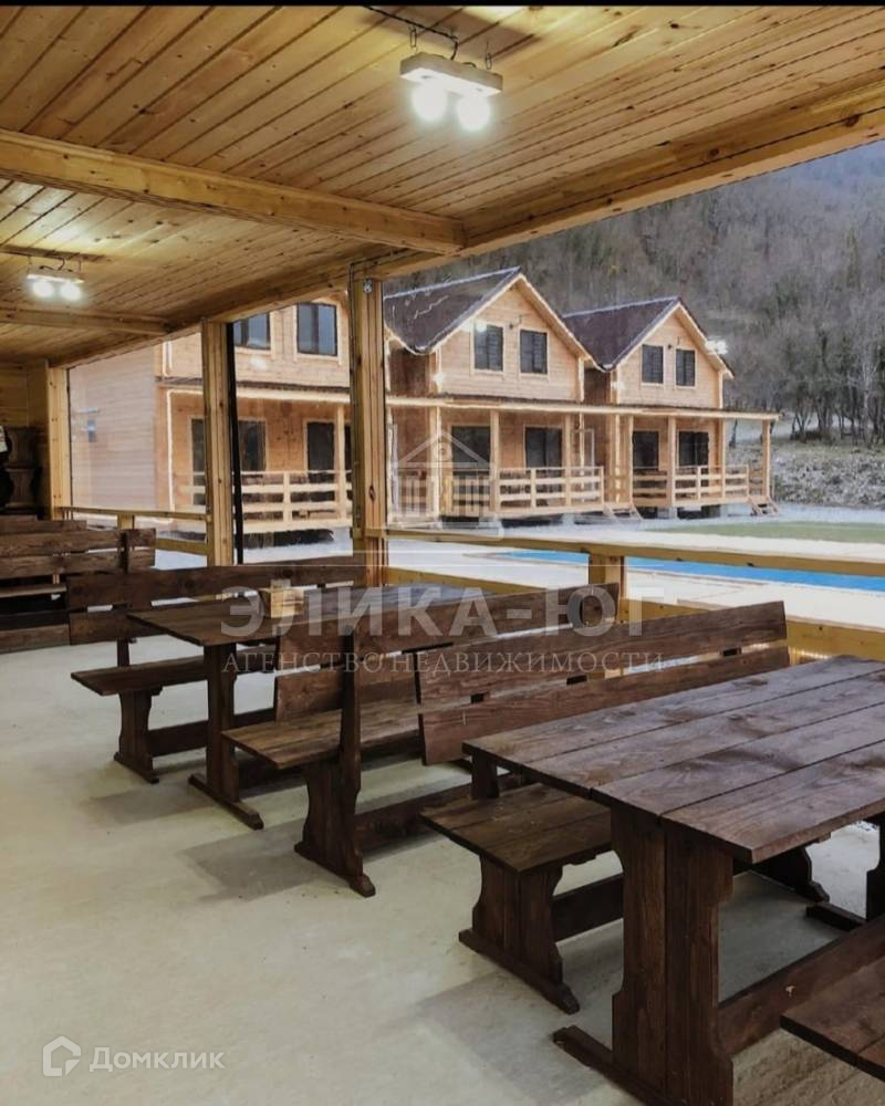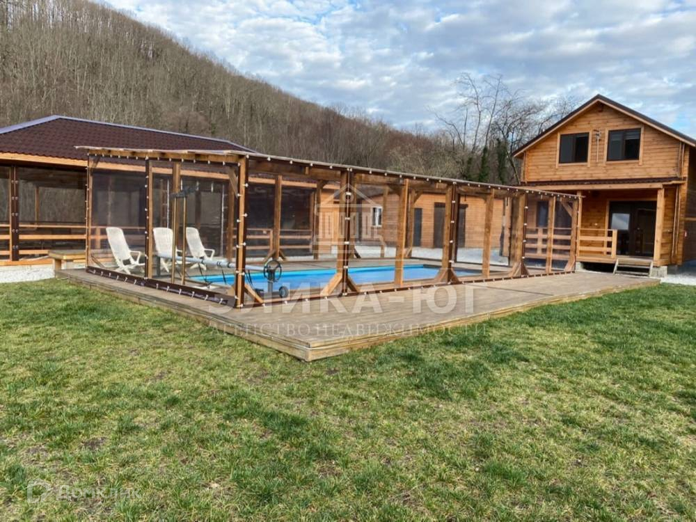 На участке три двухэтажных домика,построенные из качественного бруса.Большой крытый бассейн с подогревом ,