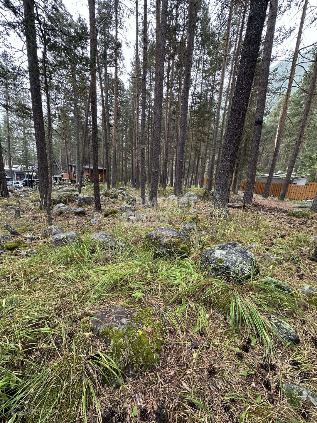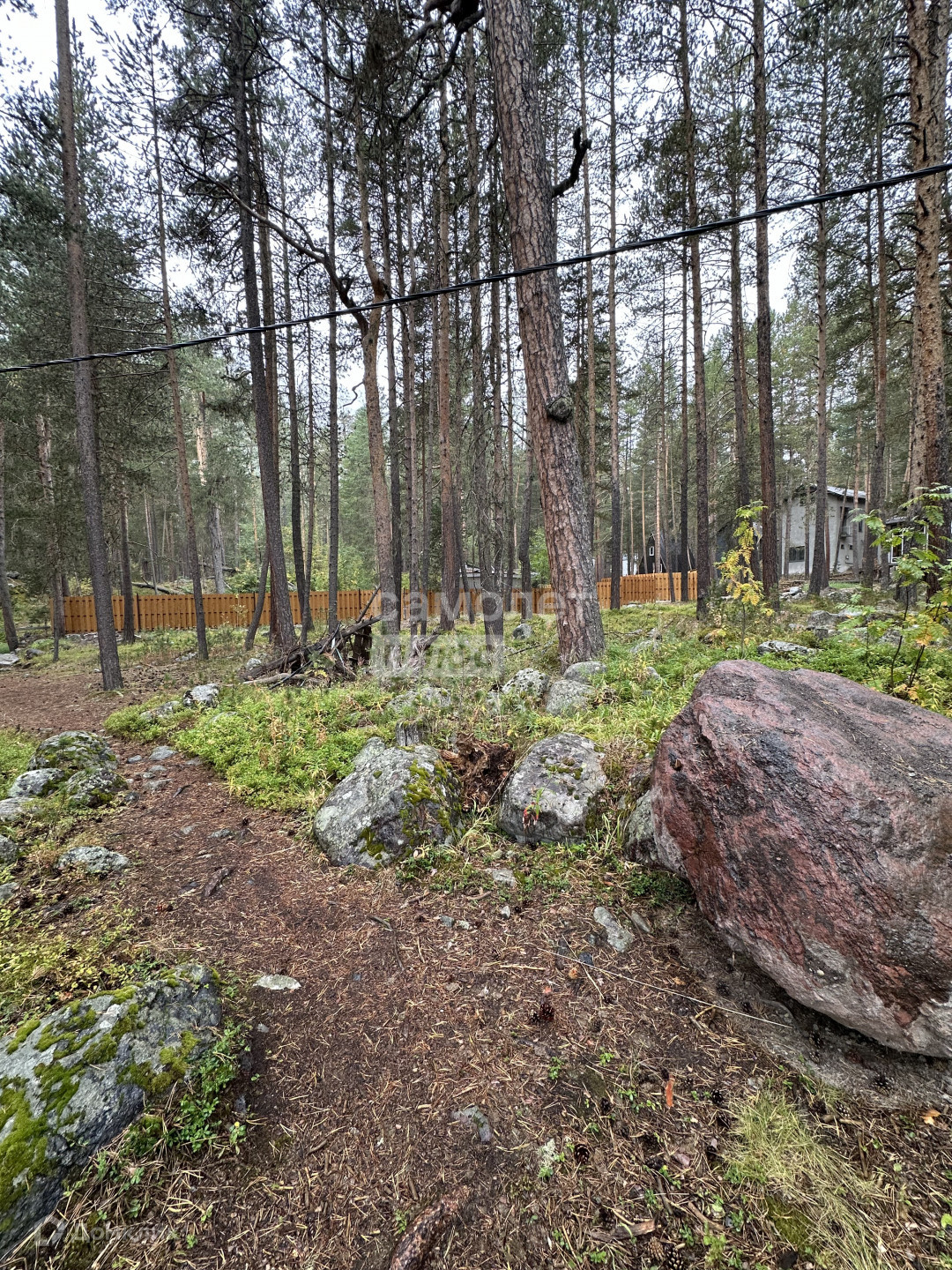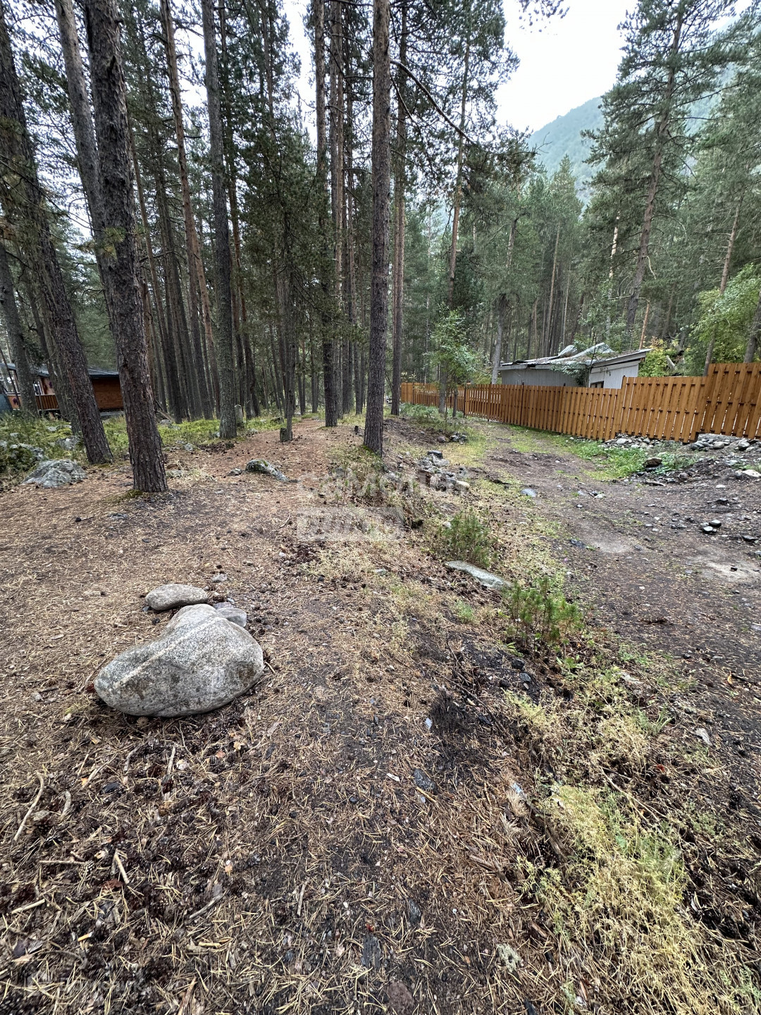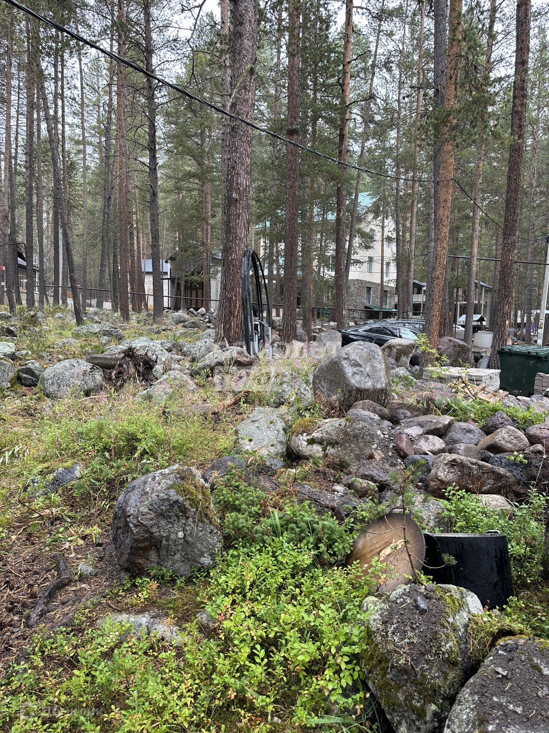 На участке красивые камни, растут деревья