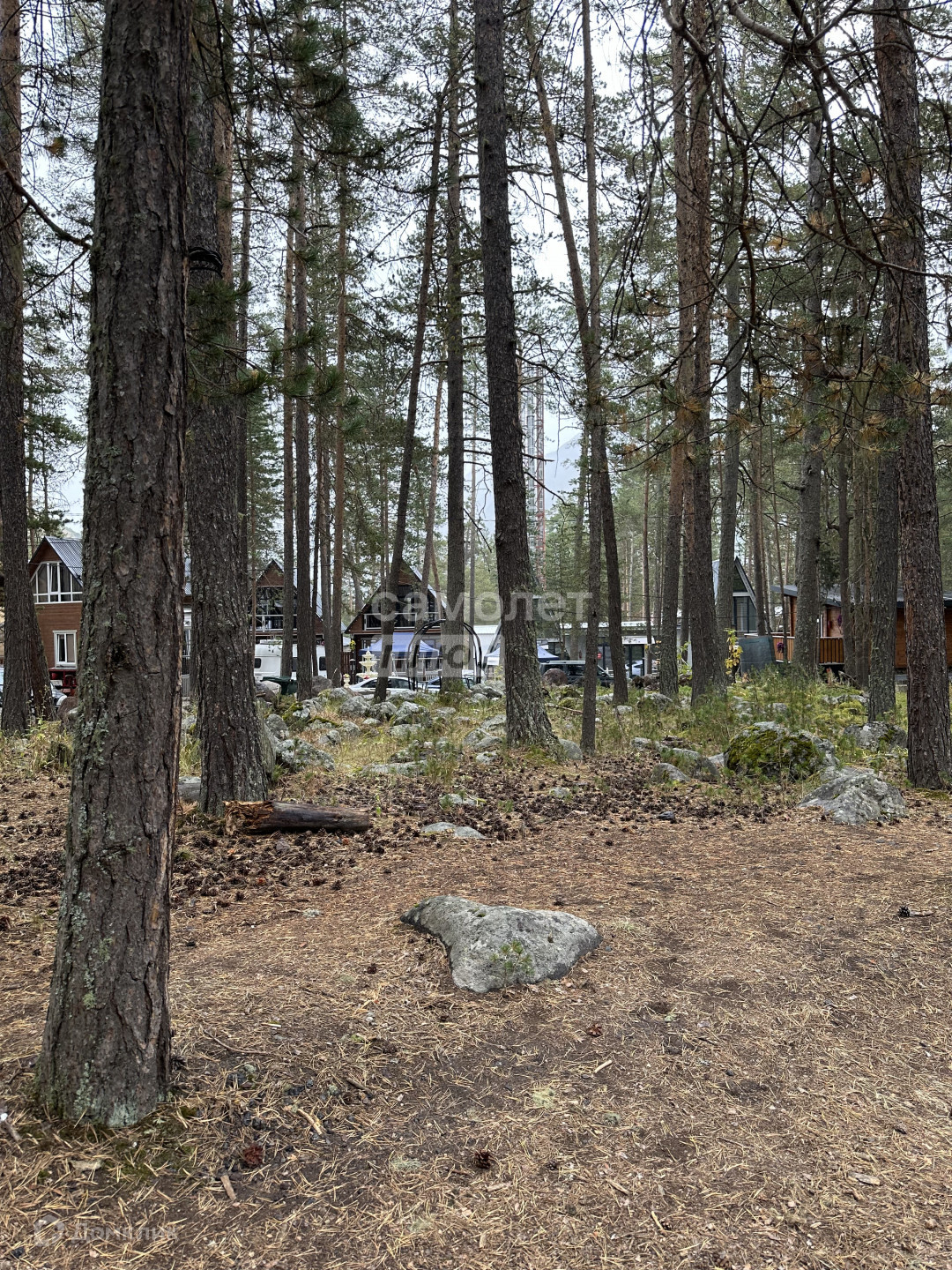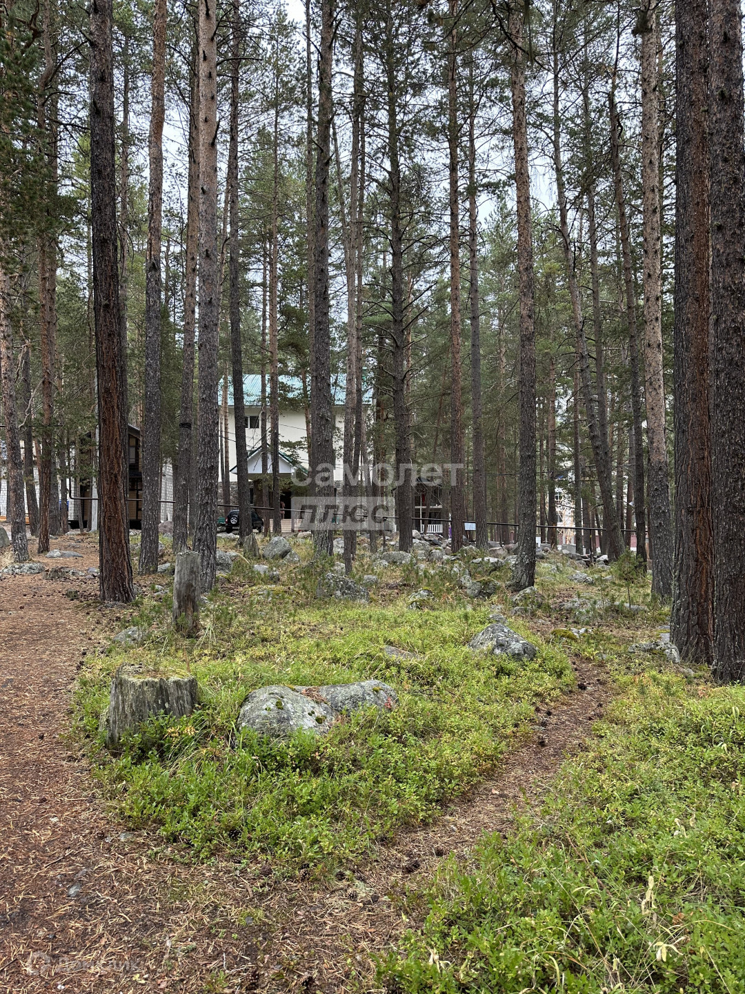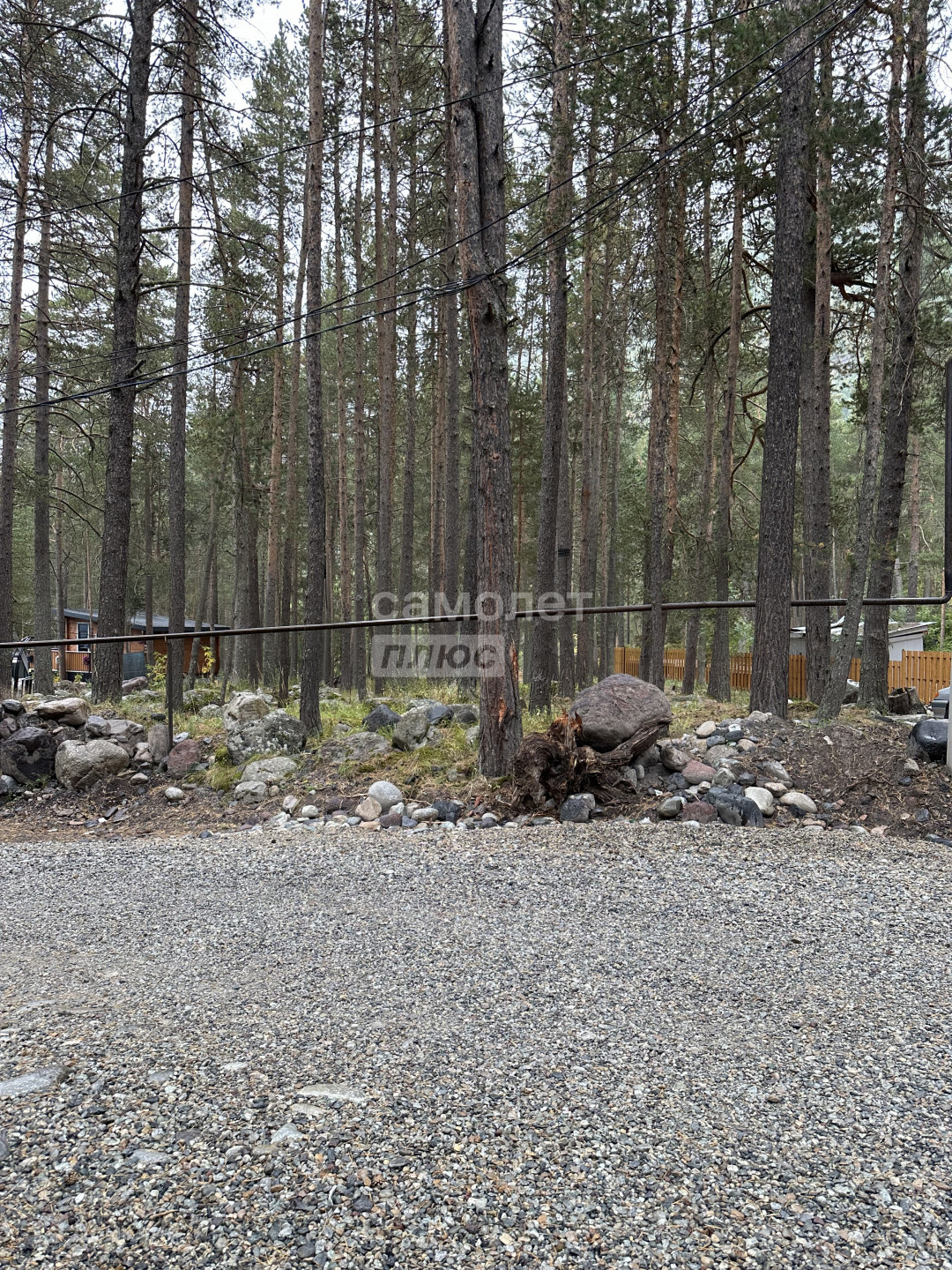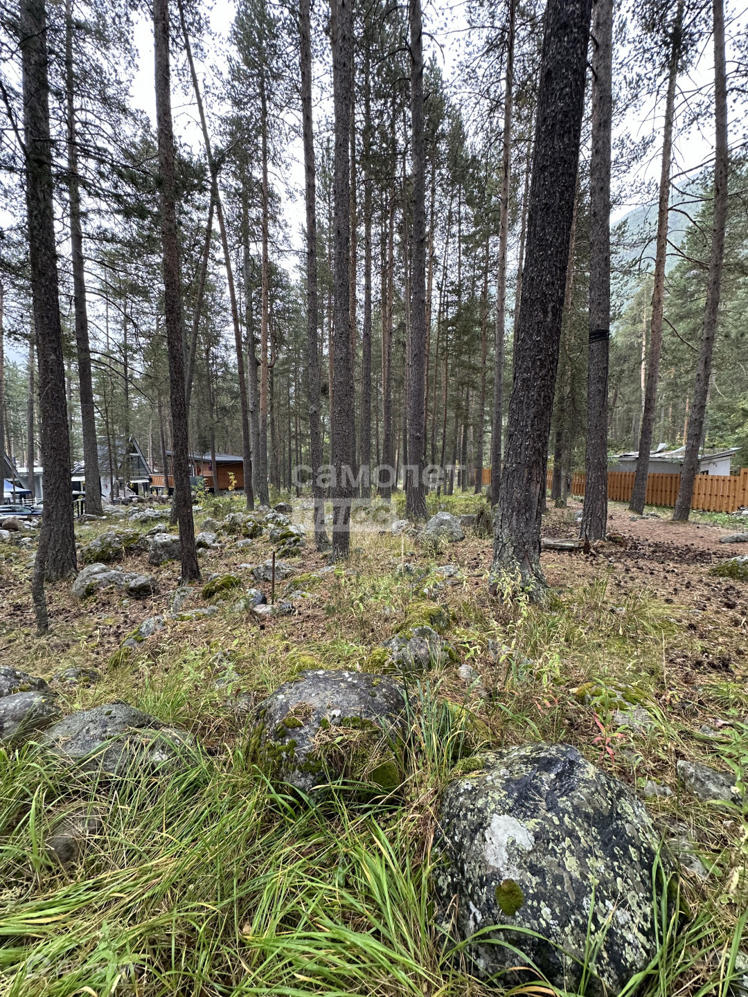 На участке красивые камни, растут деревья