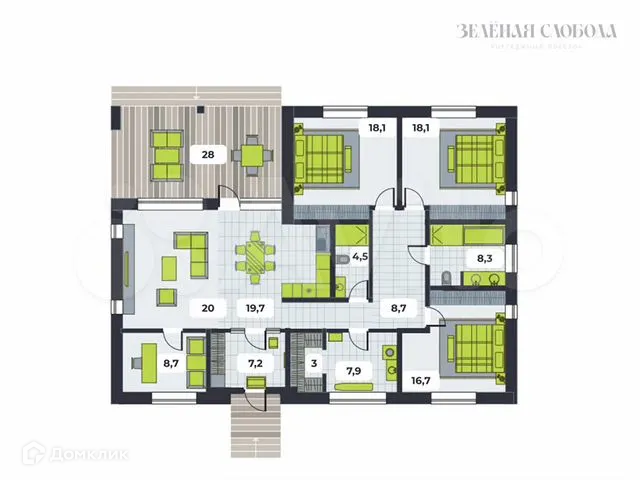 Одноэтажный дом по проекту В площадью 171,3 м² для большой семьи:
