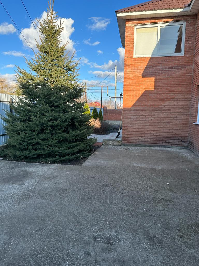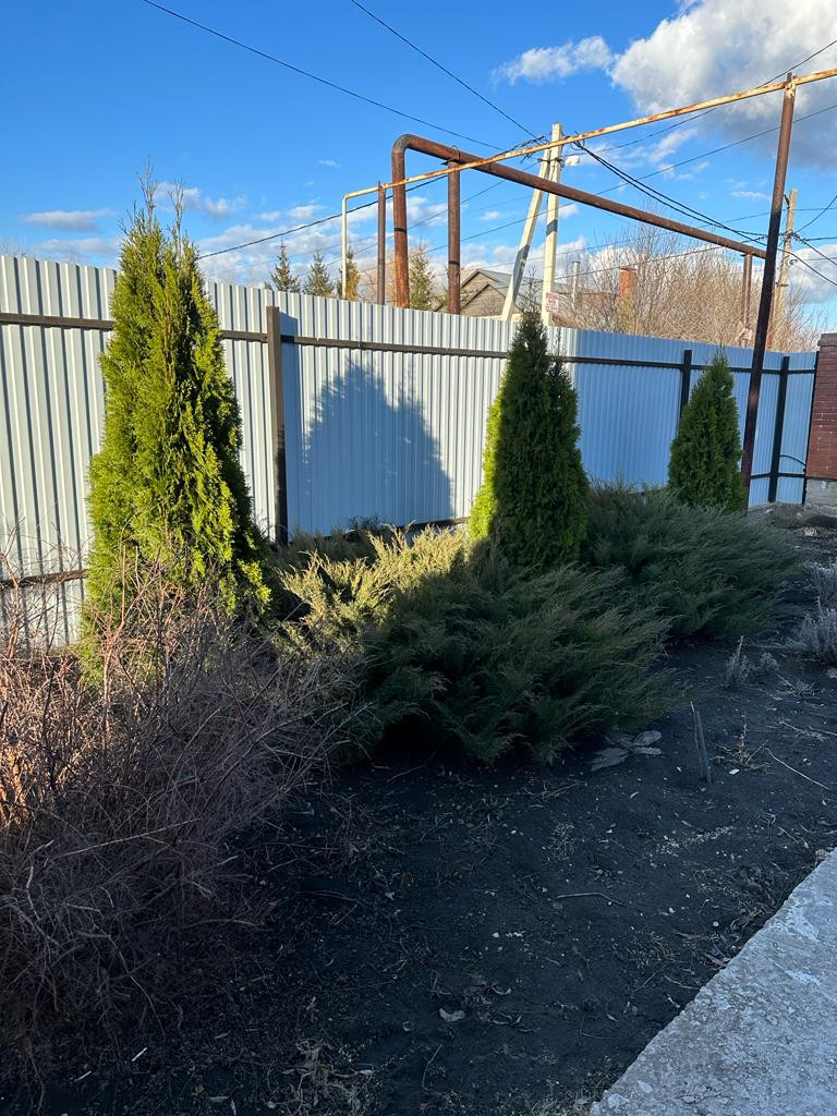 Во дворе газон, плодовые деревья(груша, абрикос, черешня, вишня, яблоко, клубника, малина и тд.) туи, голубая ель.