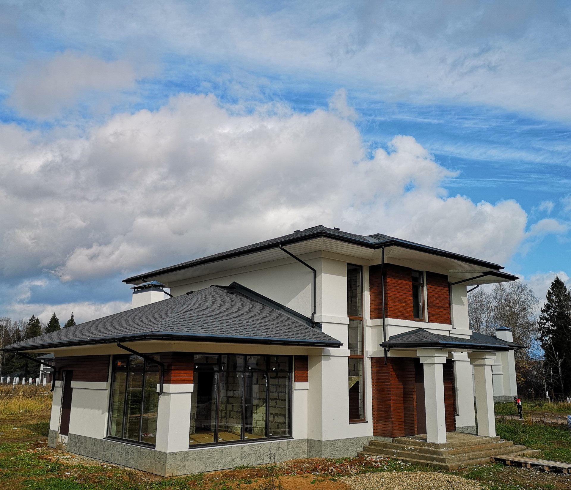 На солнечном участке с видом на лес, земли населенных пунктов ИЖС наивысшая категория, с центральными поселковыми коммуникациями: высокоскоростной интернет, электричество 15кВт, водопровод и канализация. Магистральный газ по границе участка. Дом с очень удобной планировкой. Построен из высококачественных и экологичных материалов. Первый этаж: холл, кухня, столовая, гостиная с камином, кабинет, топочная, санузел и панорамная хобби комната с красивым видом и своим с.у., окна алюминий в пол, веранда ;
