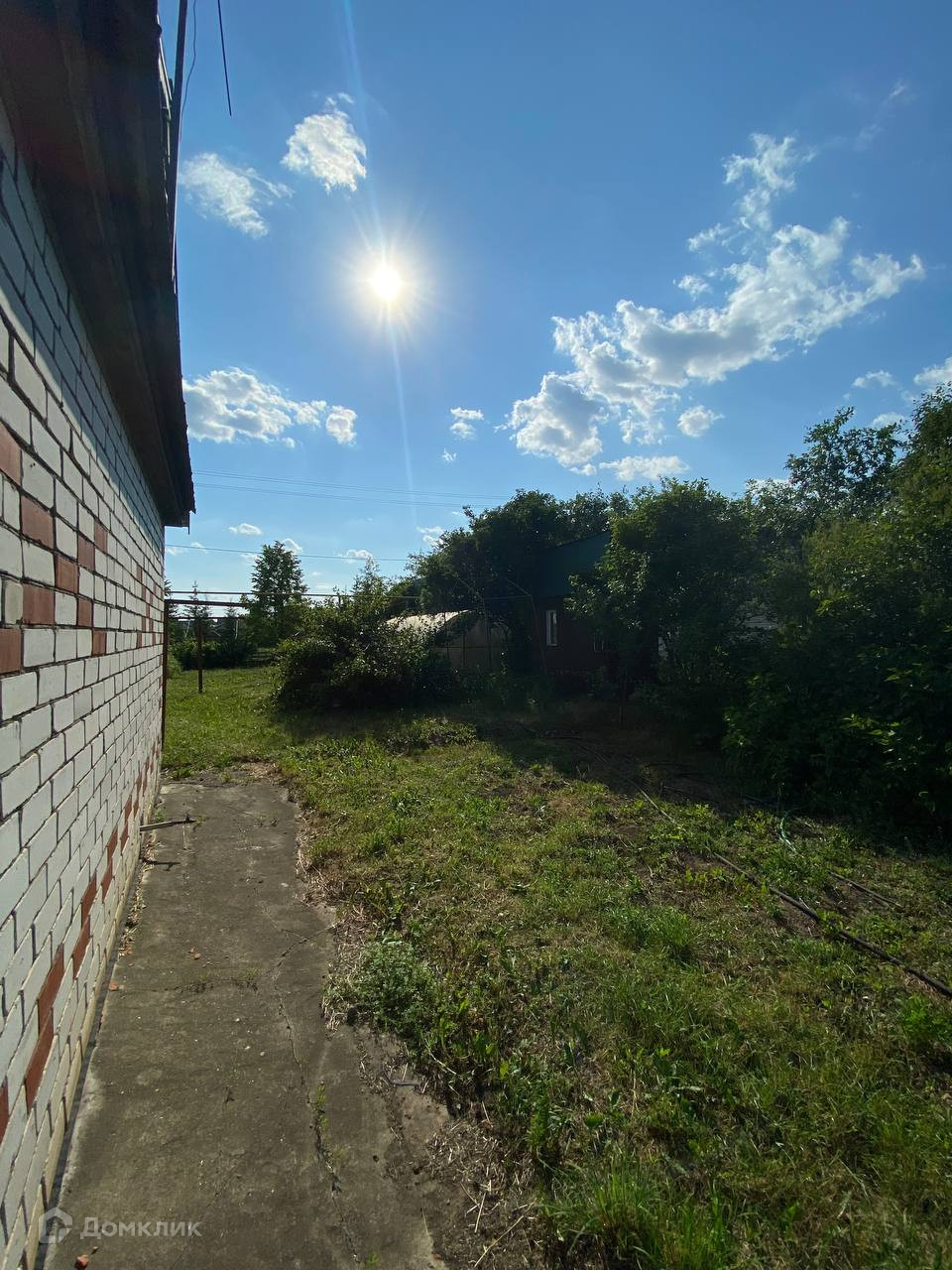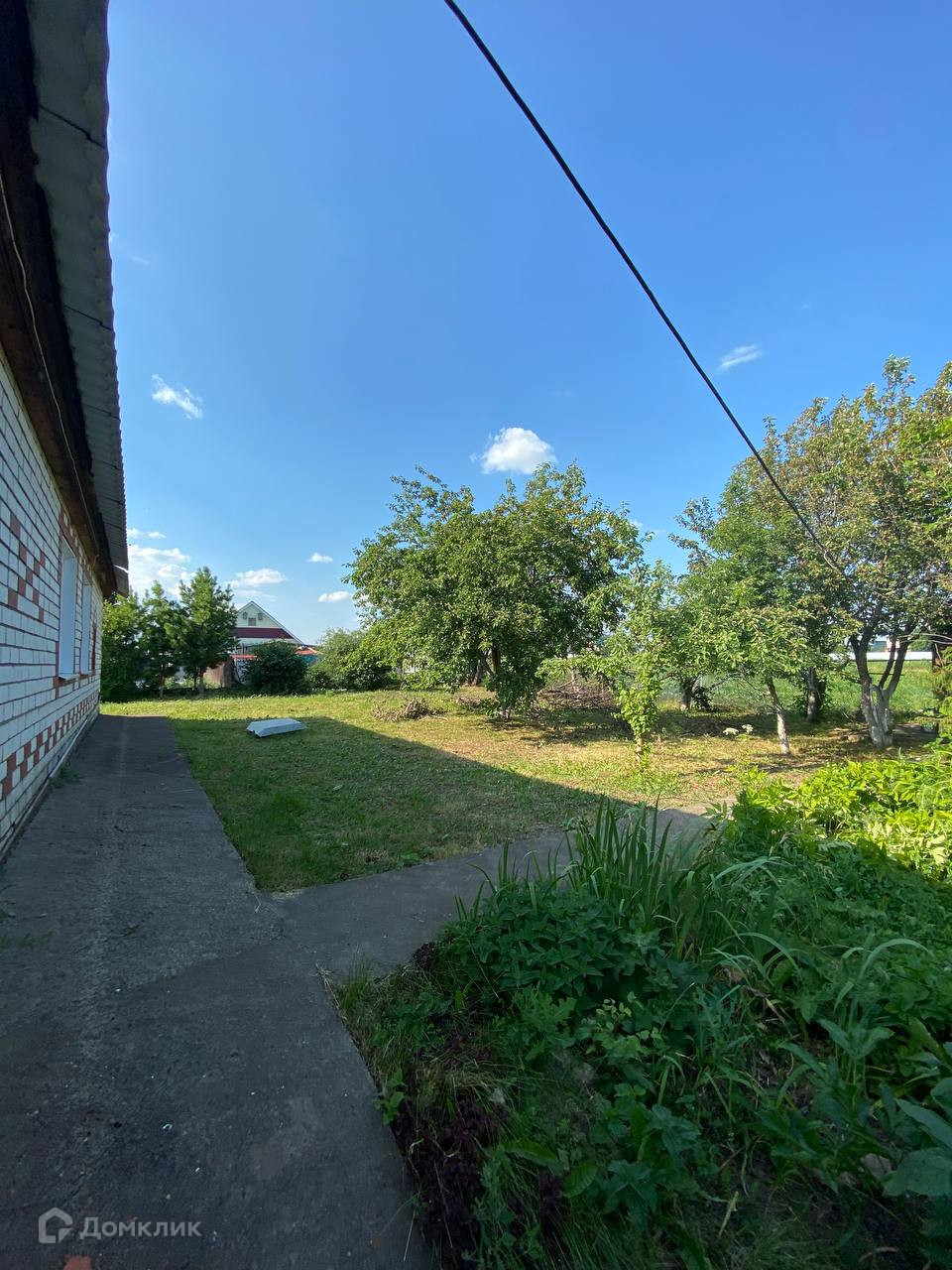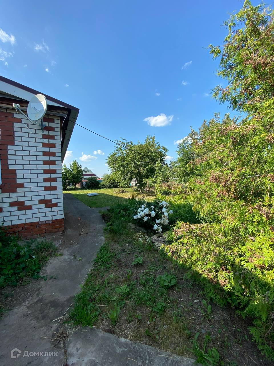 Ровный ухоженный участок, деревья, кустарники, цветы, грядки, теплица, летний душ, проходы выложены брусчаткой.