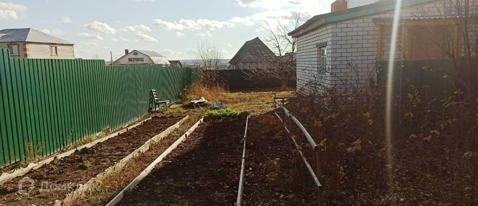 Широкий ухоженный двор с насаждениями. Всё огорожено забором из профнастила.