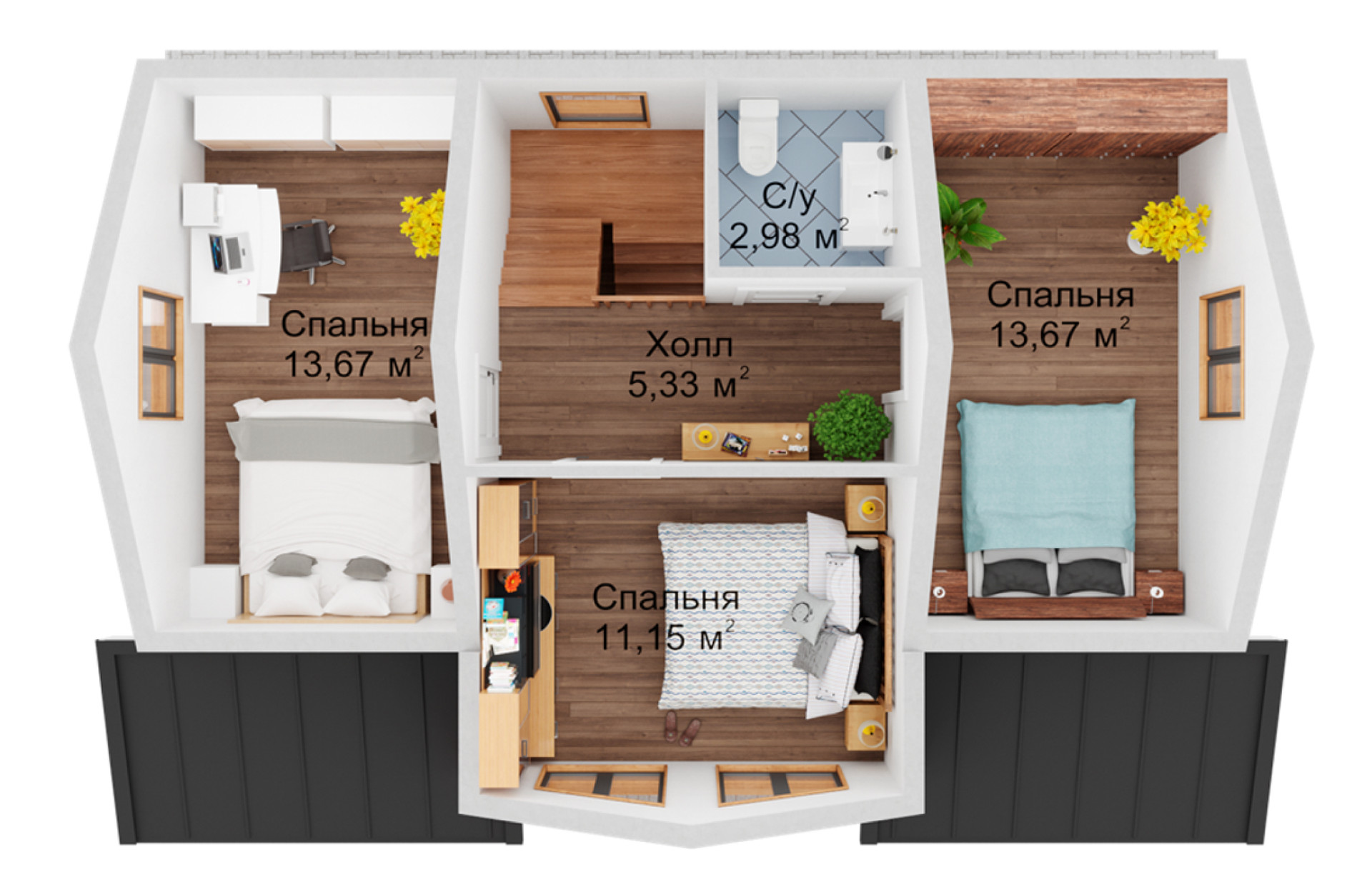 Продуманная планировка, 3 функциональные спальни на втором этаже и спальня или кабинет на первом.