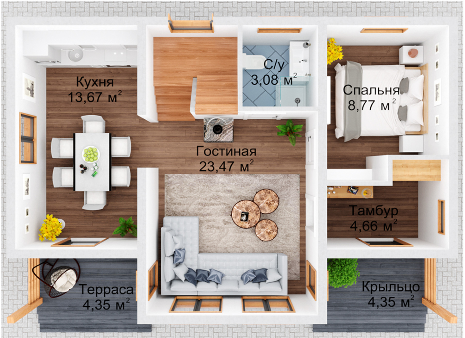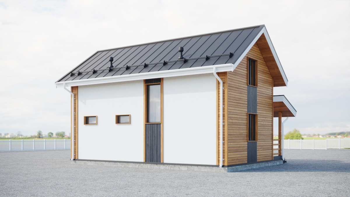 Особенностью дома по проекту «Нарва» является возможность оборудовать на первом этаже сауну вместо одной из спален, а пространство под лестницей использовать в качестве кладовой.