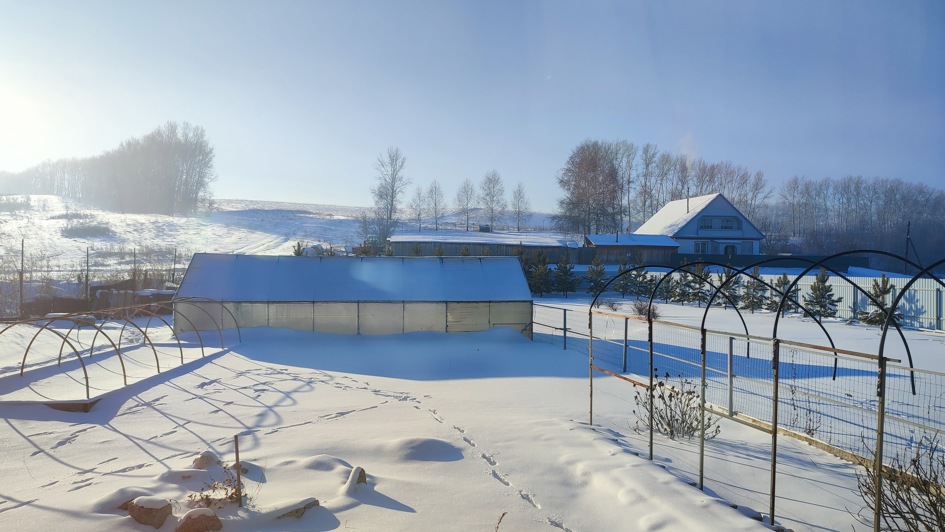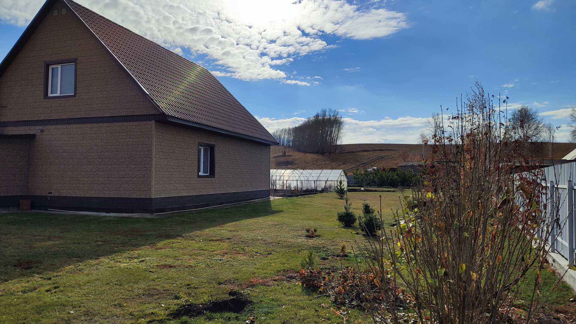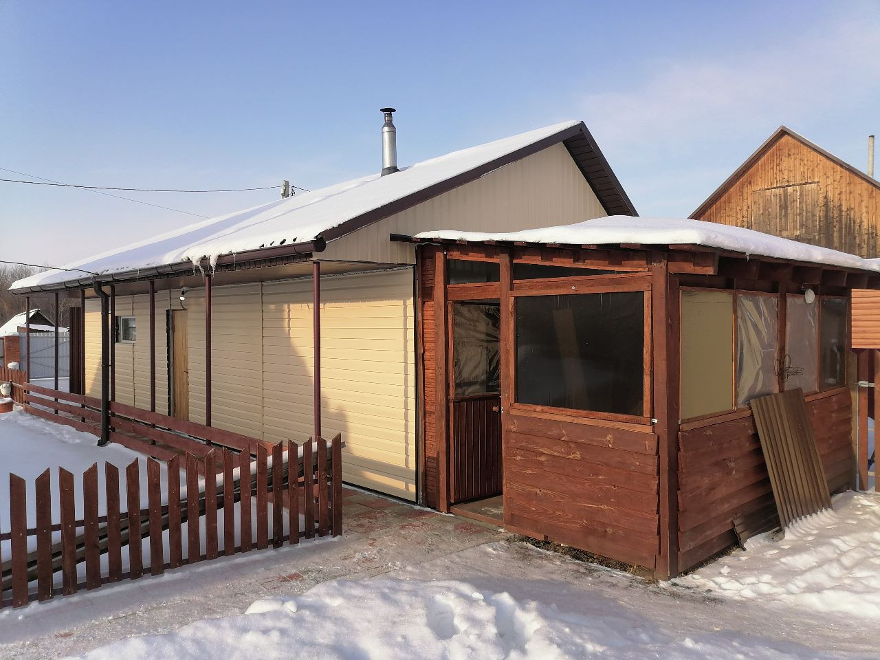 Гараж (яма), баня (теплые полы, отдельная парилка), веранда, углярка-дровяник, теплица (3х8), тротуарная плитка, забор (профлист), плодовый сад.