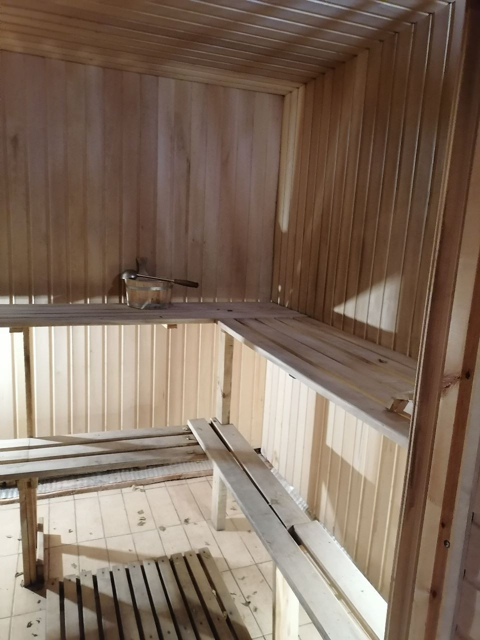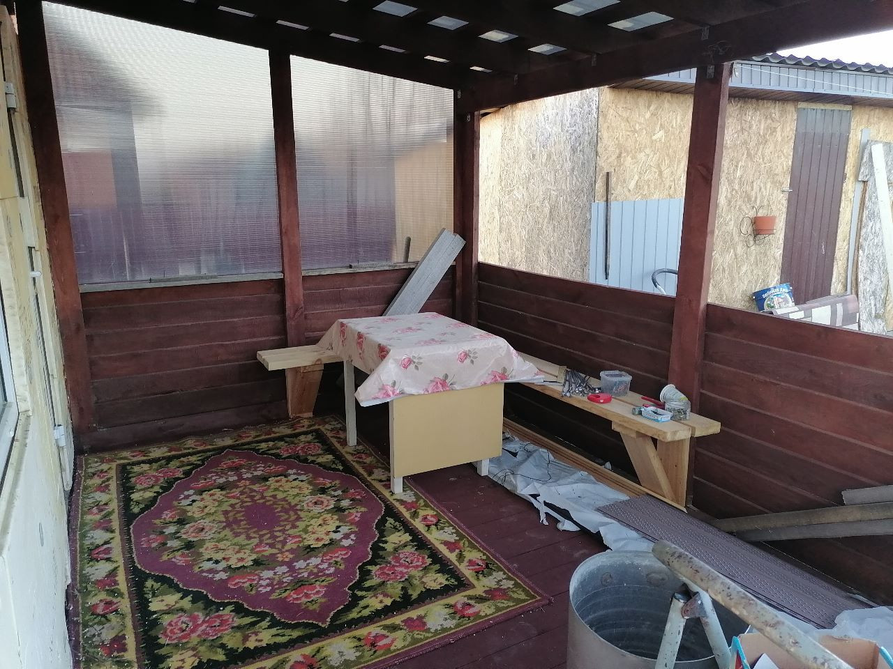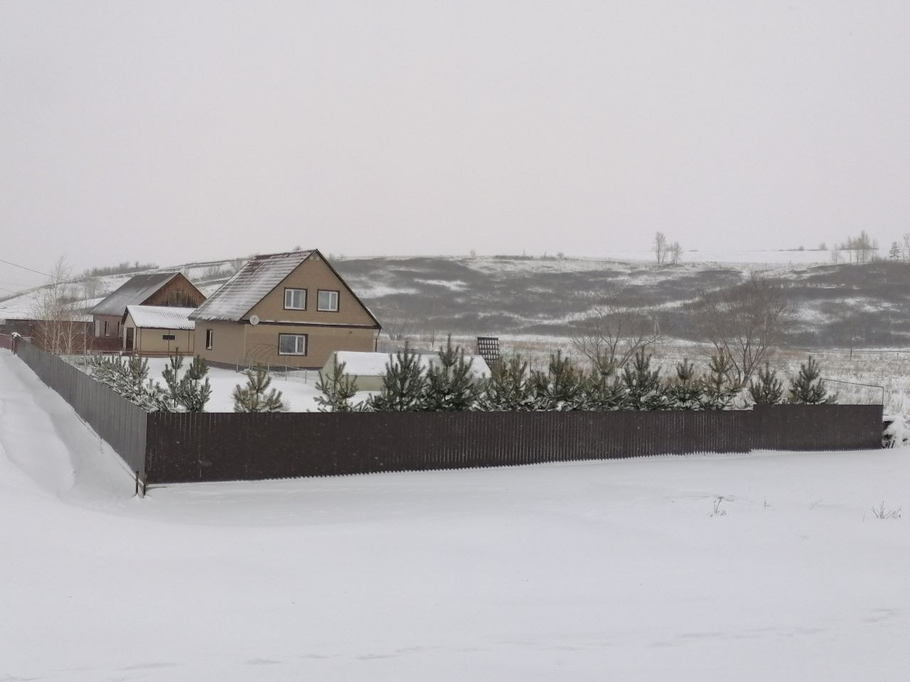 Гараж (яма), баня (теплые полы, отдельная парилка), веранда, углярка-дровяник, теплица (3х8), тротуарная плитка, забор (профлист), плодовый сад.