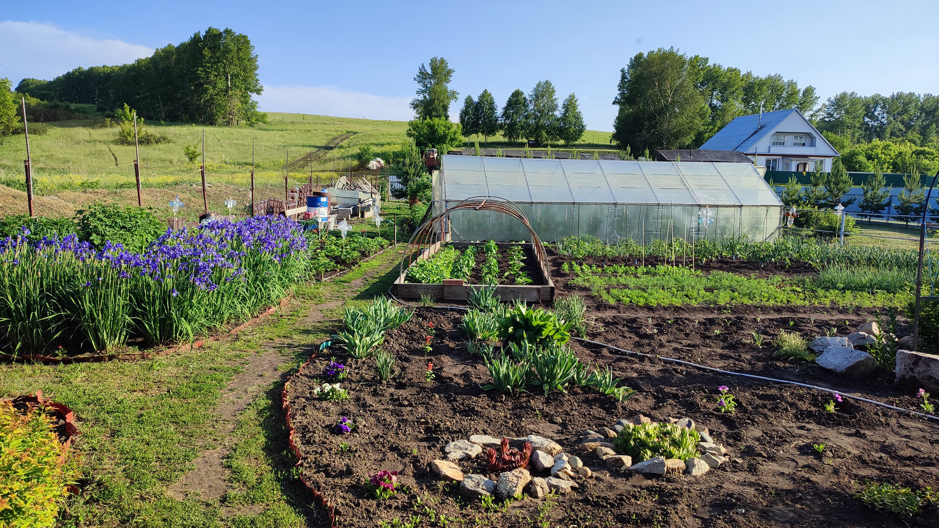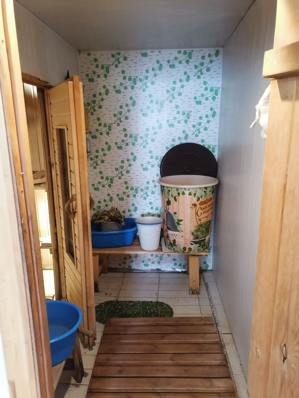 Гараж (яма), баня (теплые полы, отдельная парилка), веранда, углярка-дровяник, теплица (3х8), тротуарная плитка, забор (профлист), плодовый сад.