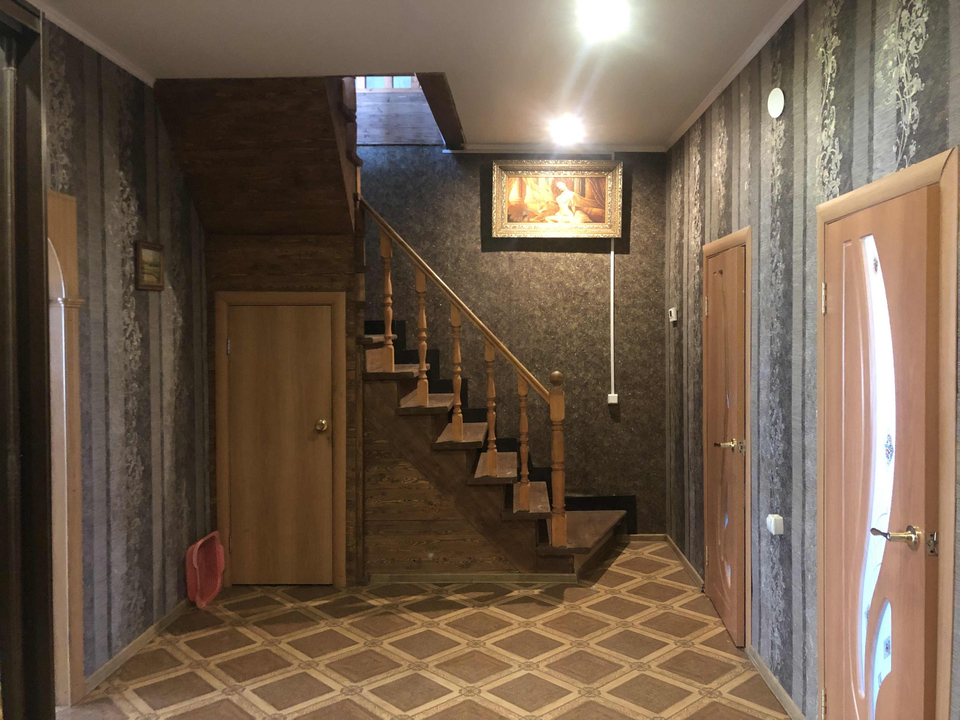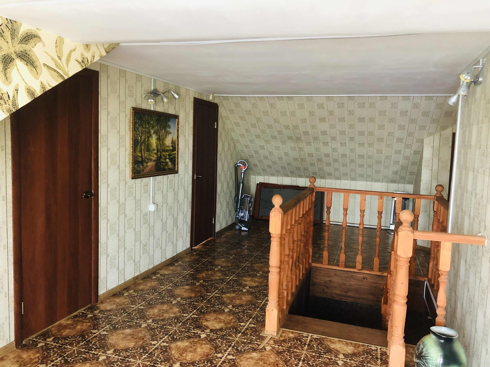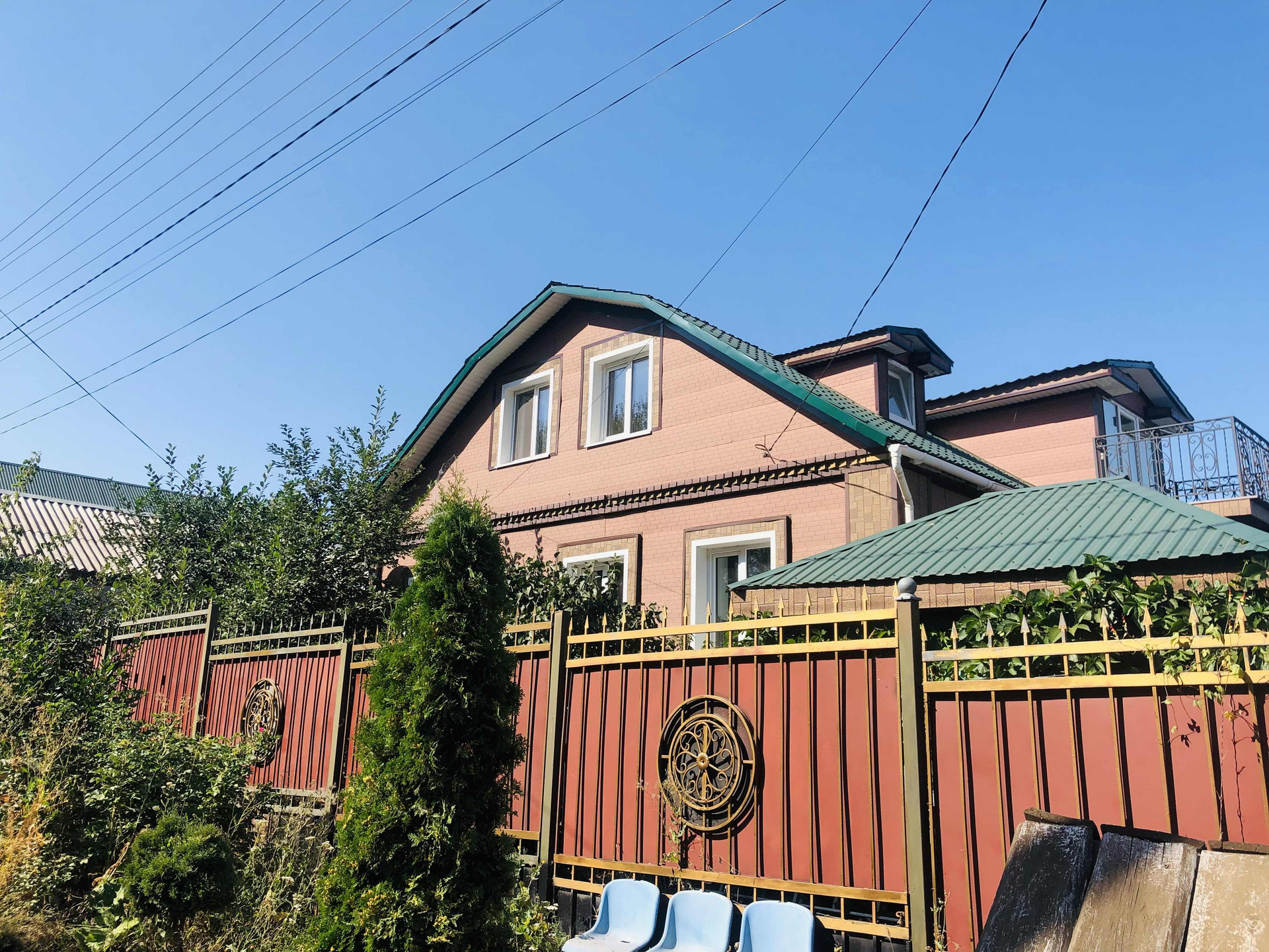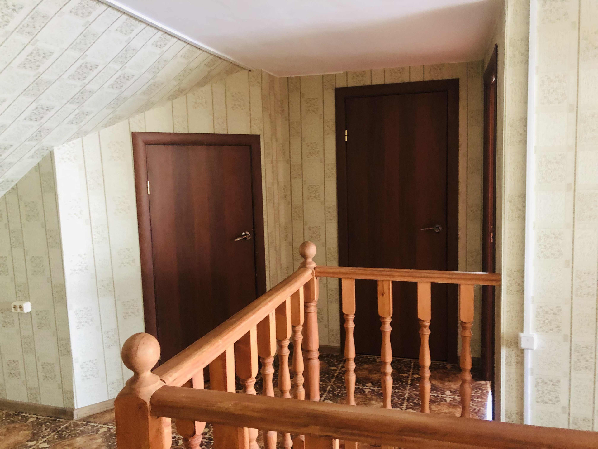 На первом этаже просторная прихожая, зал, небольшая комната, большая кухня (27 кв.м), туалет и ванная комната. На втором этаже три спальные комнаты, гардеробная, туалет, балкон с красивым видом.