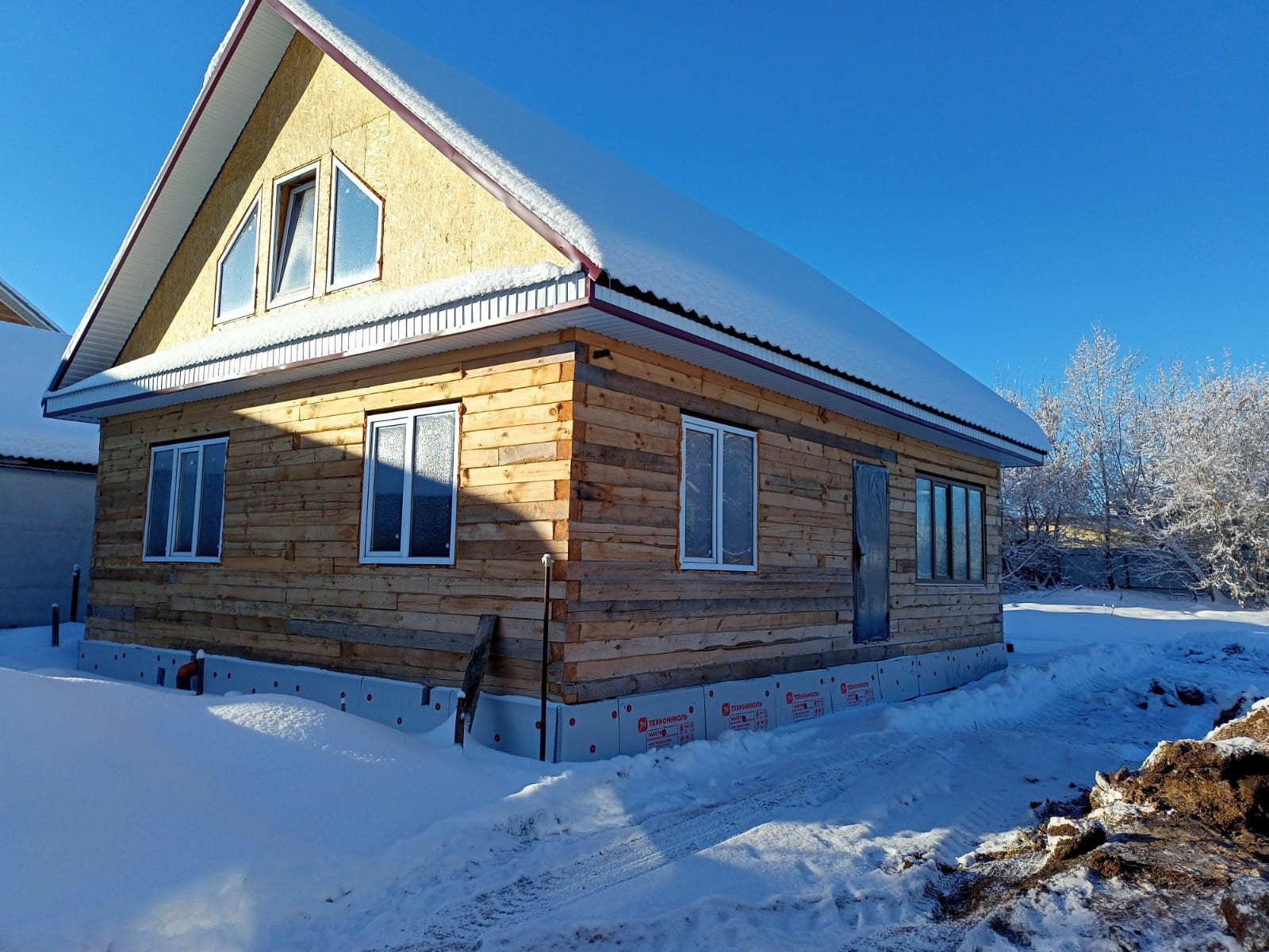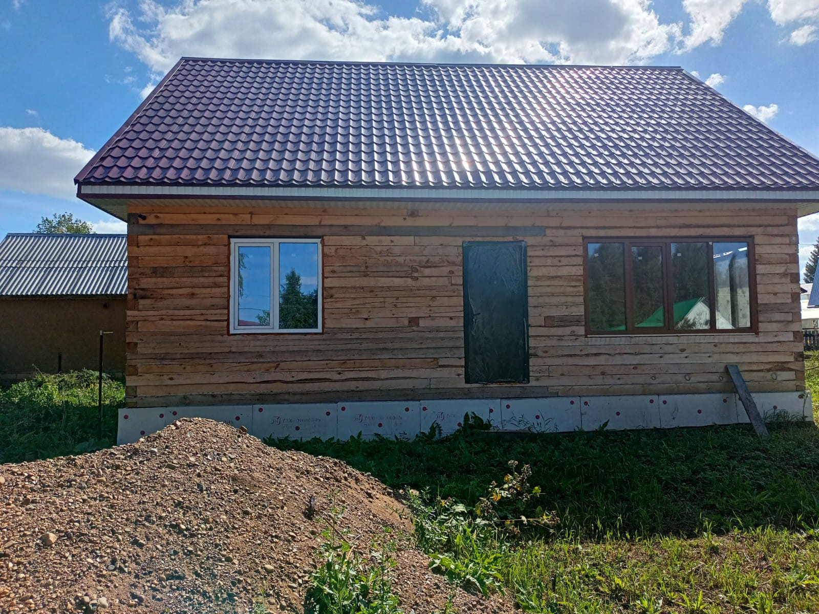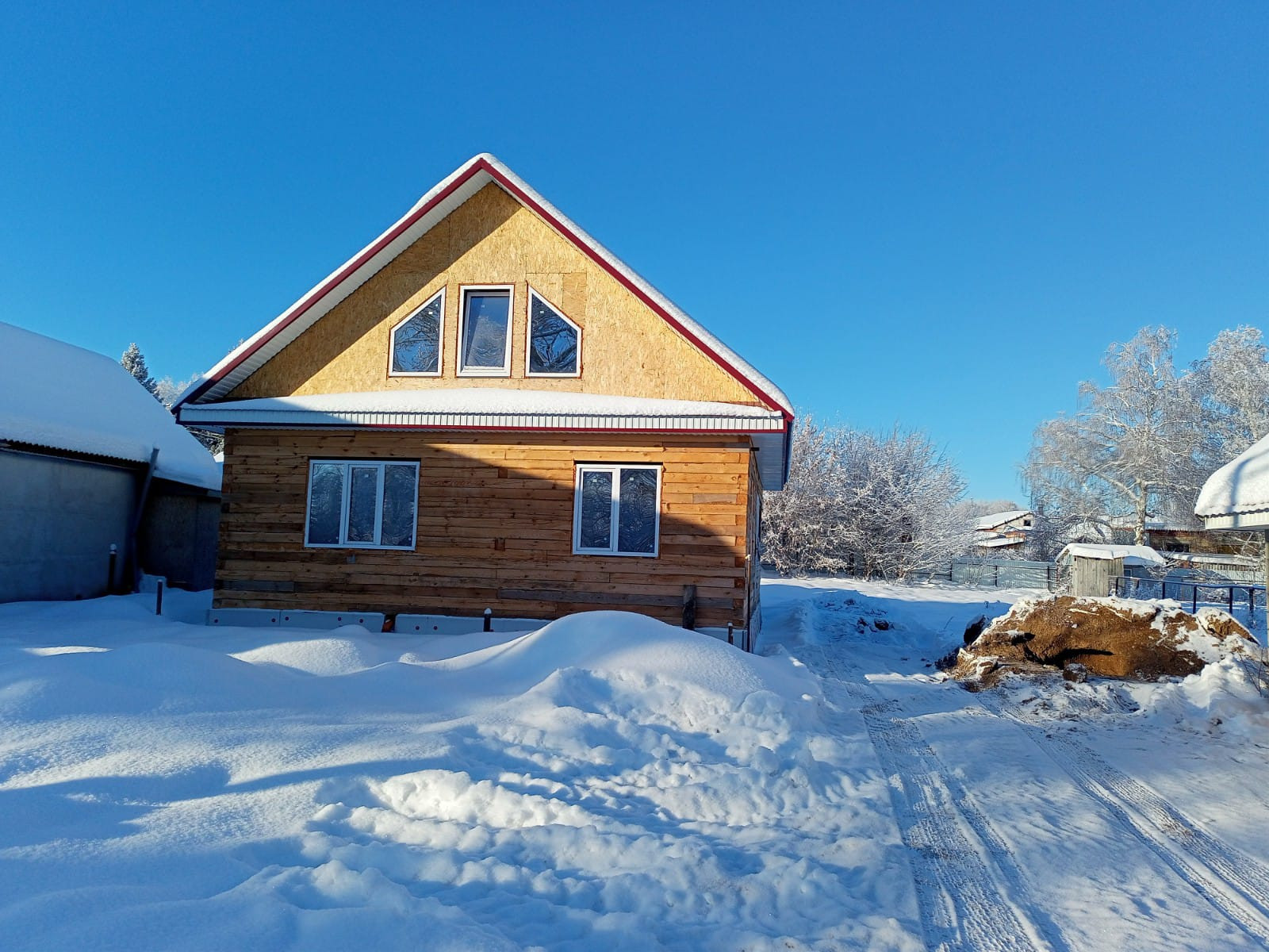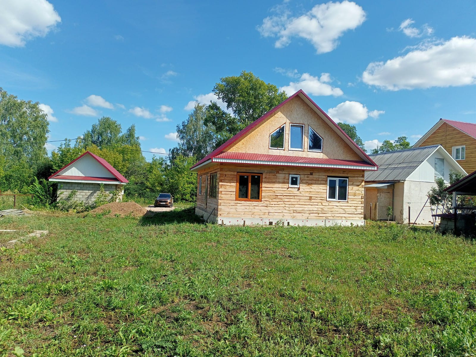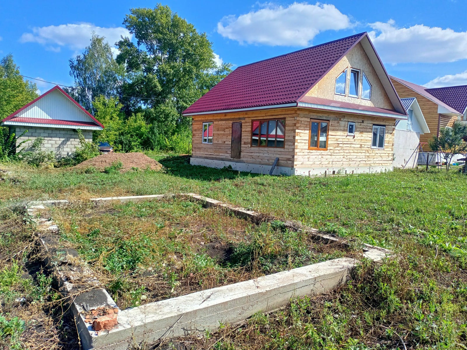 Дом построен из бруса. На участке есть гараж, фундамент под баню. Дом расположен недалеко от въезда в село.