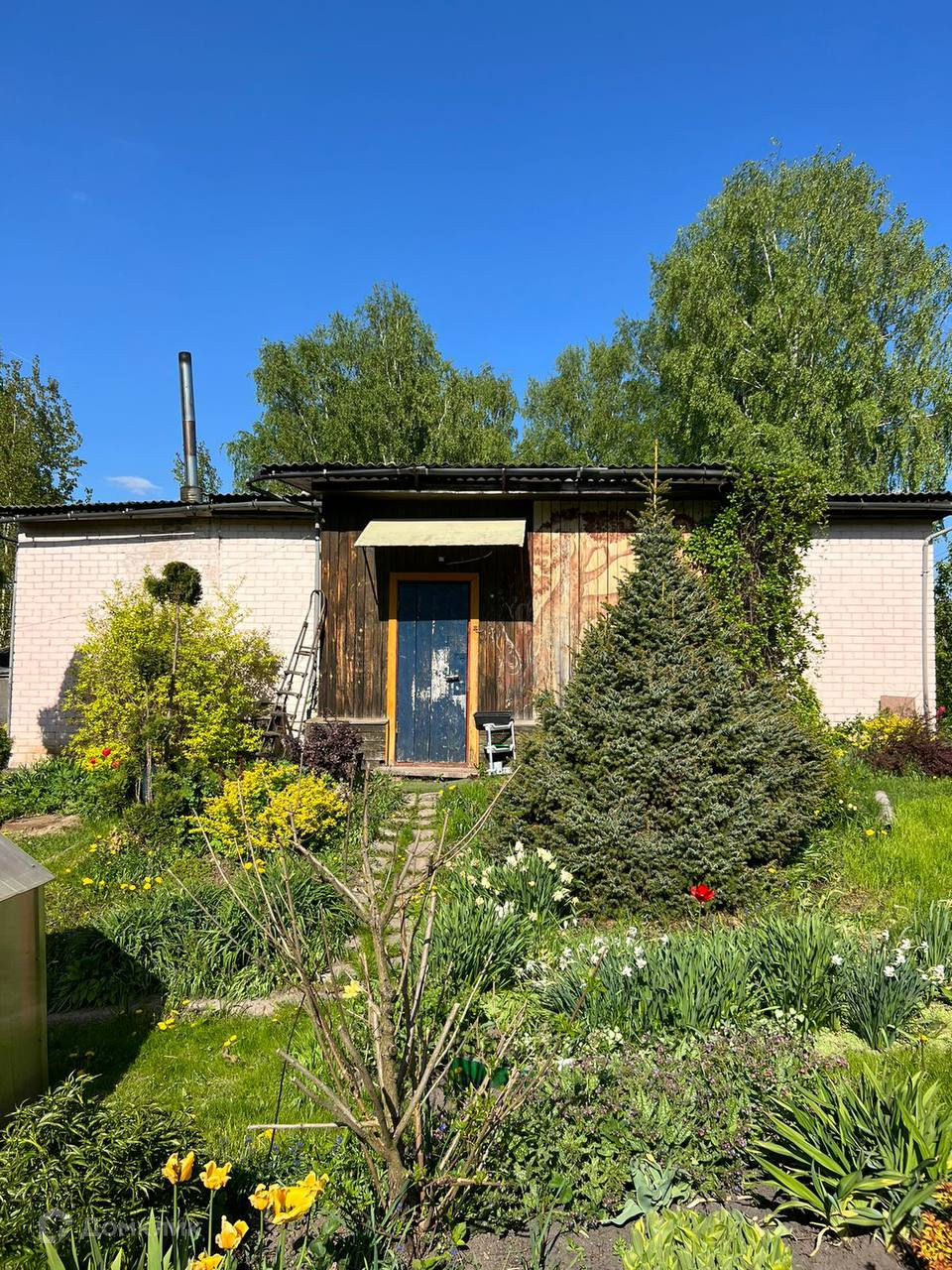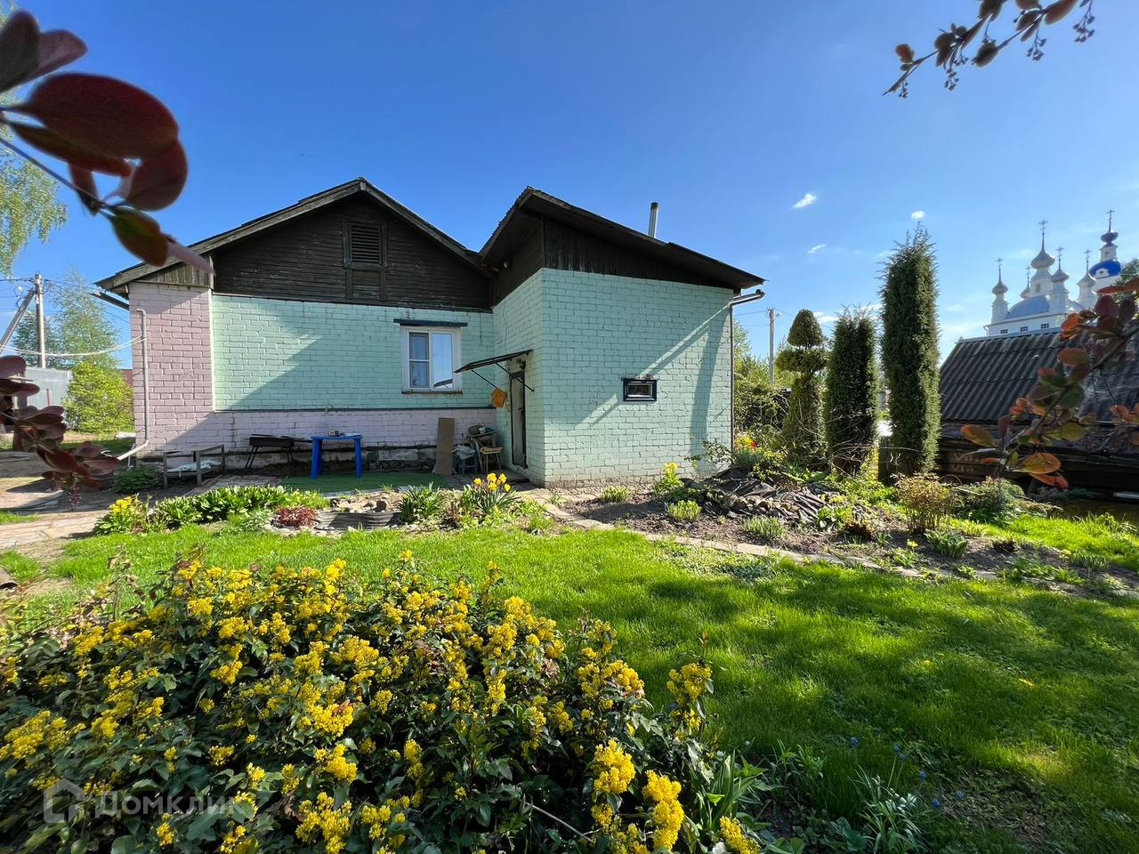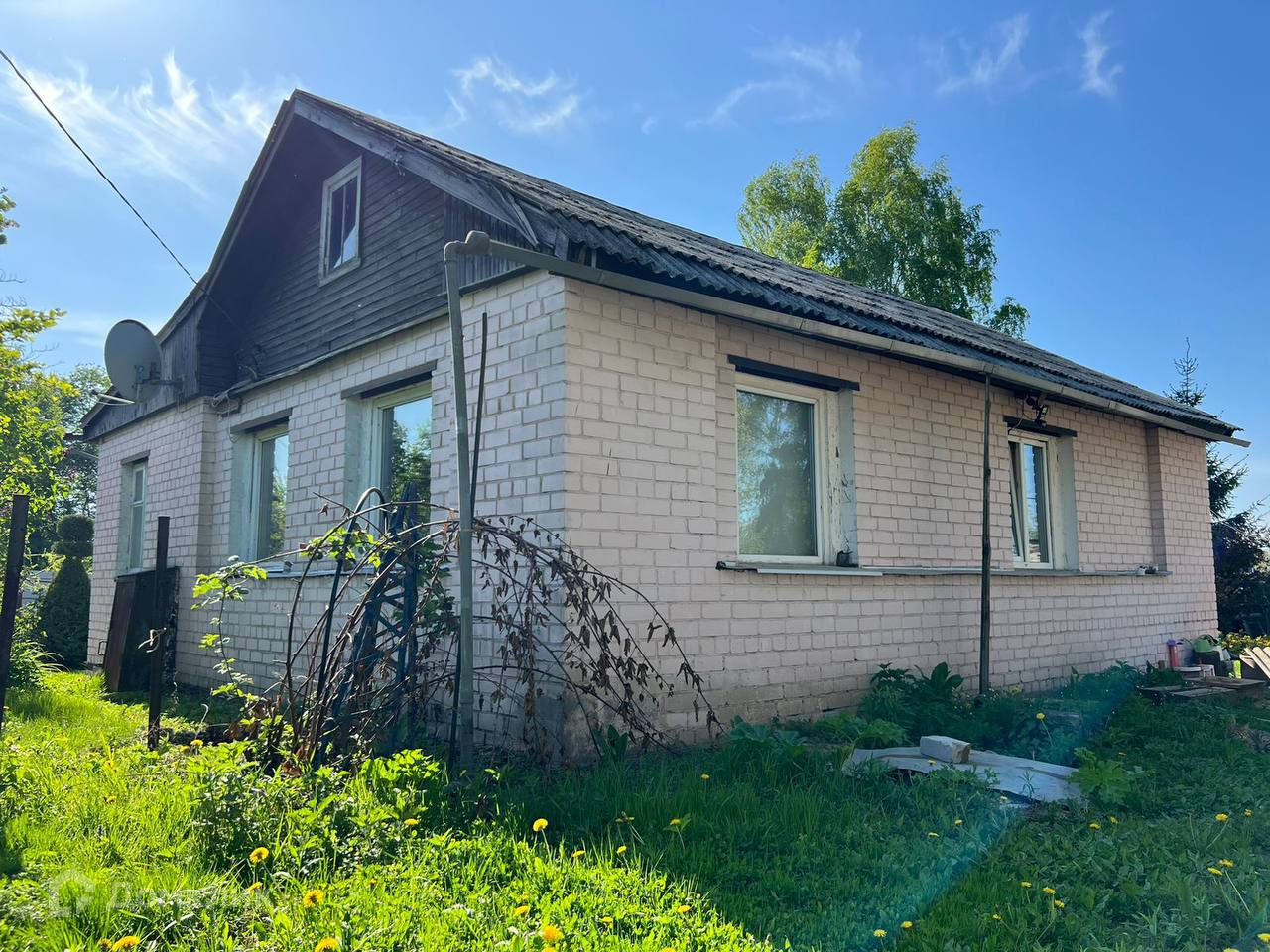 - Фундaмeнт дома - ленточный; Стены - щитовые с облицовкой кирпича. Крыша - черепица.