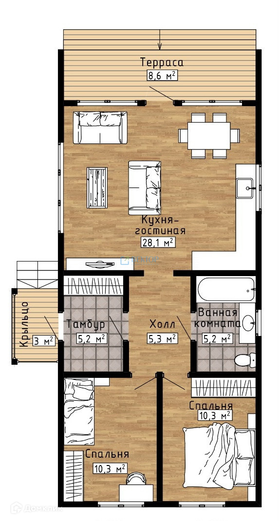 Комплектация дома: 1 этаж, 1 изолированная спальня, большая кухня-гостиная и терраса.