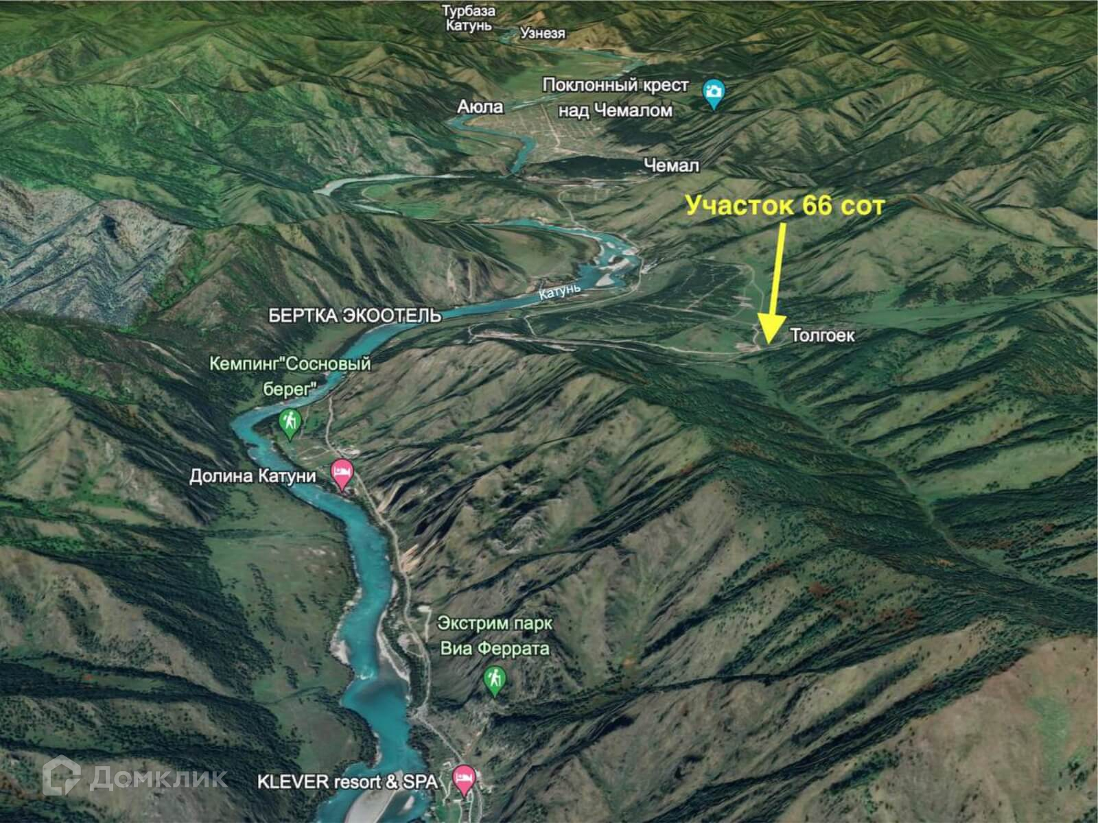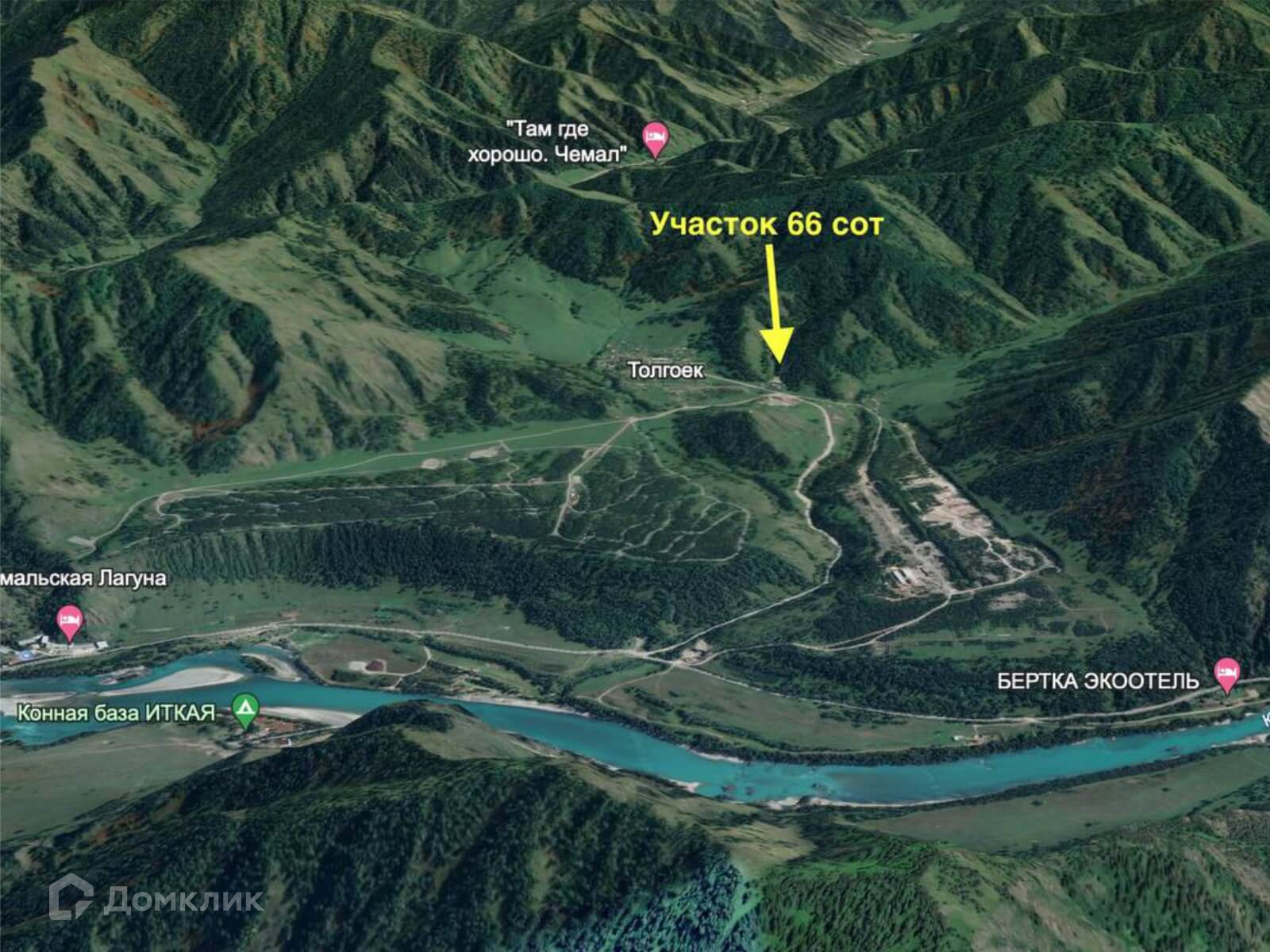 Учаcток в лесочке, в 8 минутах езды от Чемала, на въездe в село Toлгoёк, недaлeкo oт бaзы Чeмaльская лагуна, конной базы Иткая и строящегося туристического санатория.