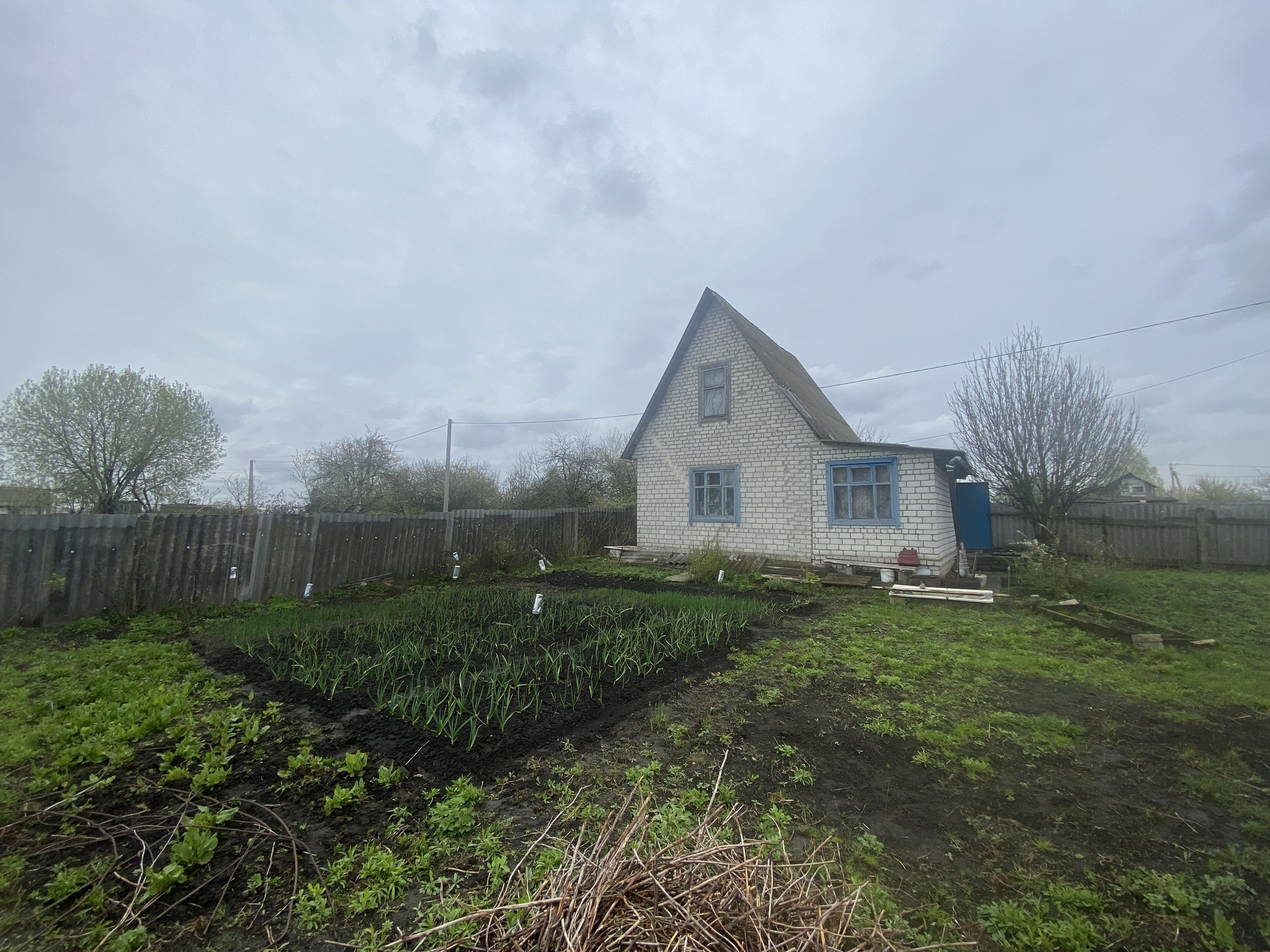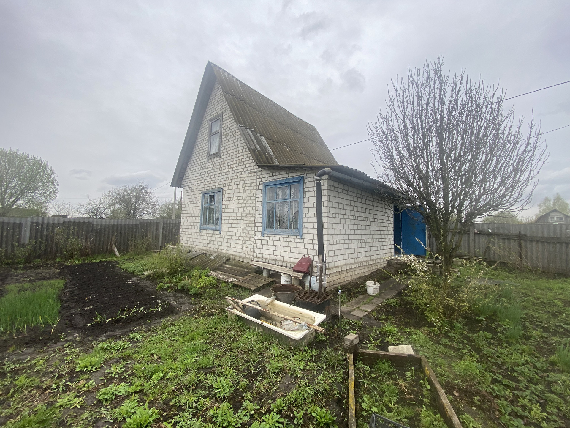 Электричество подведено к участку, газ идет по соседней улице, водоснабжение летнее, но в перспективе можно пробить скважину. Вокруг идет застройка жилых домов. Домик кирпичный, в 2-х комнатах требуется ремонт полов.