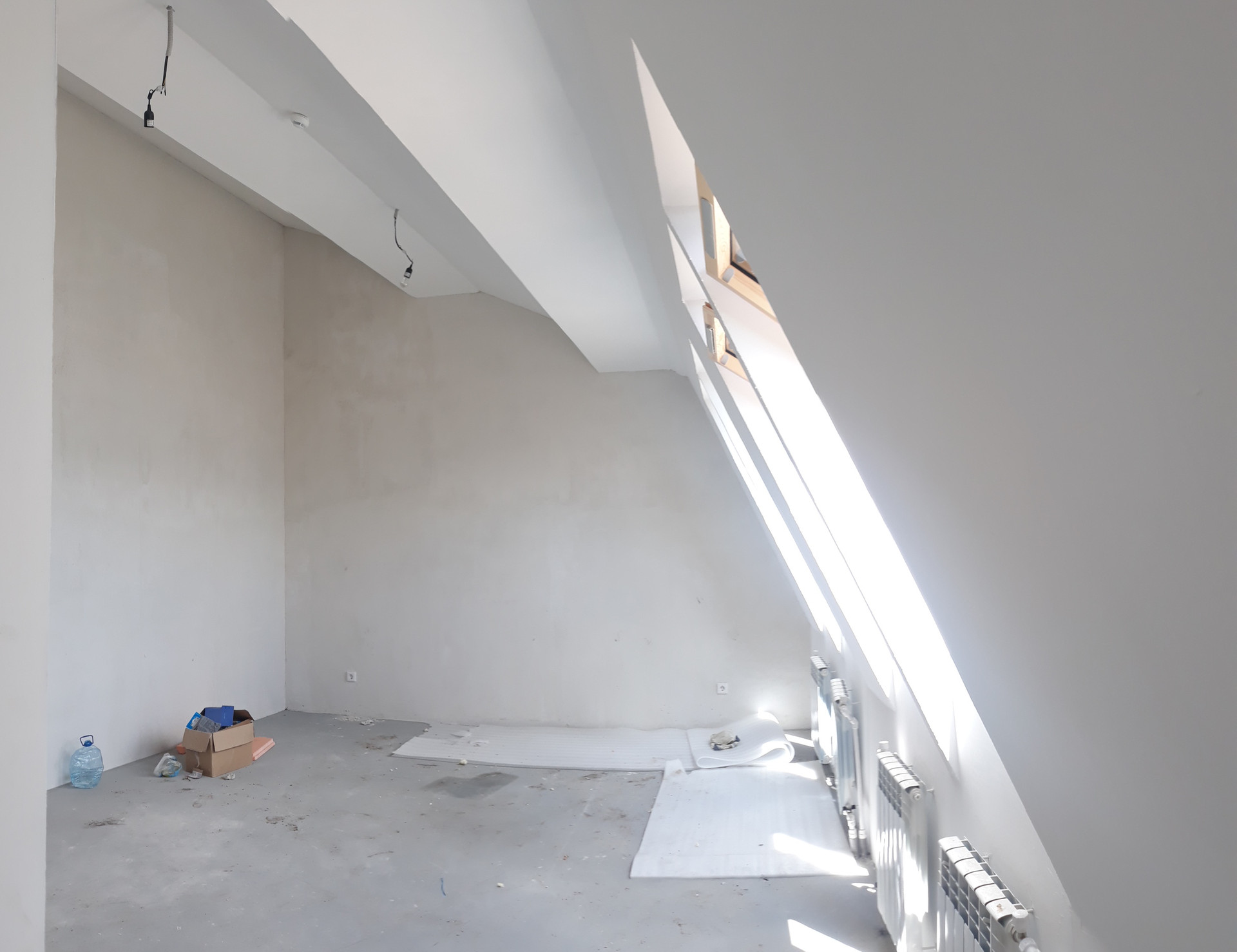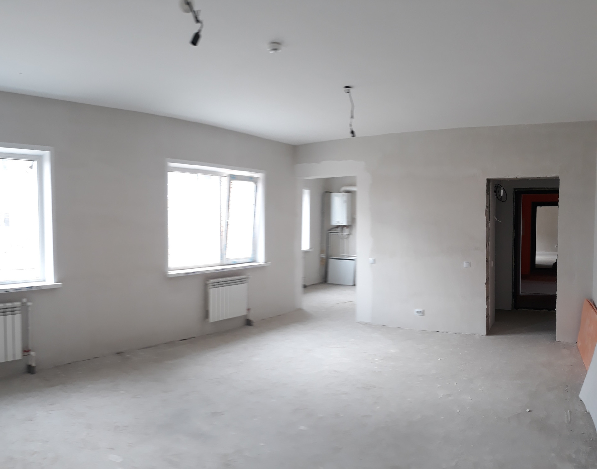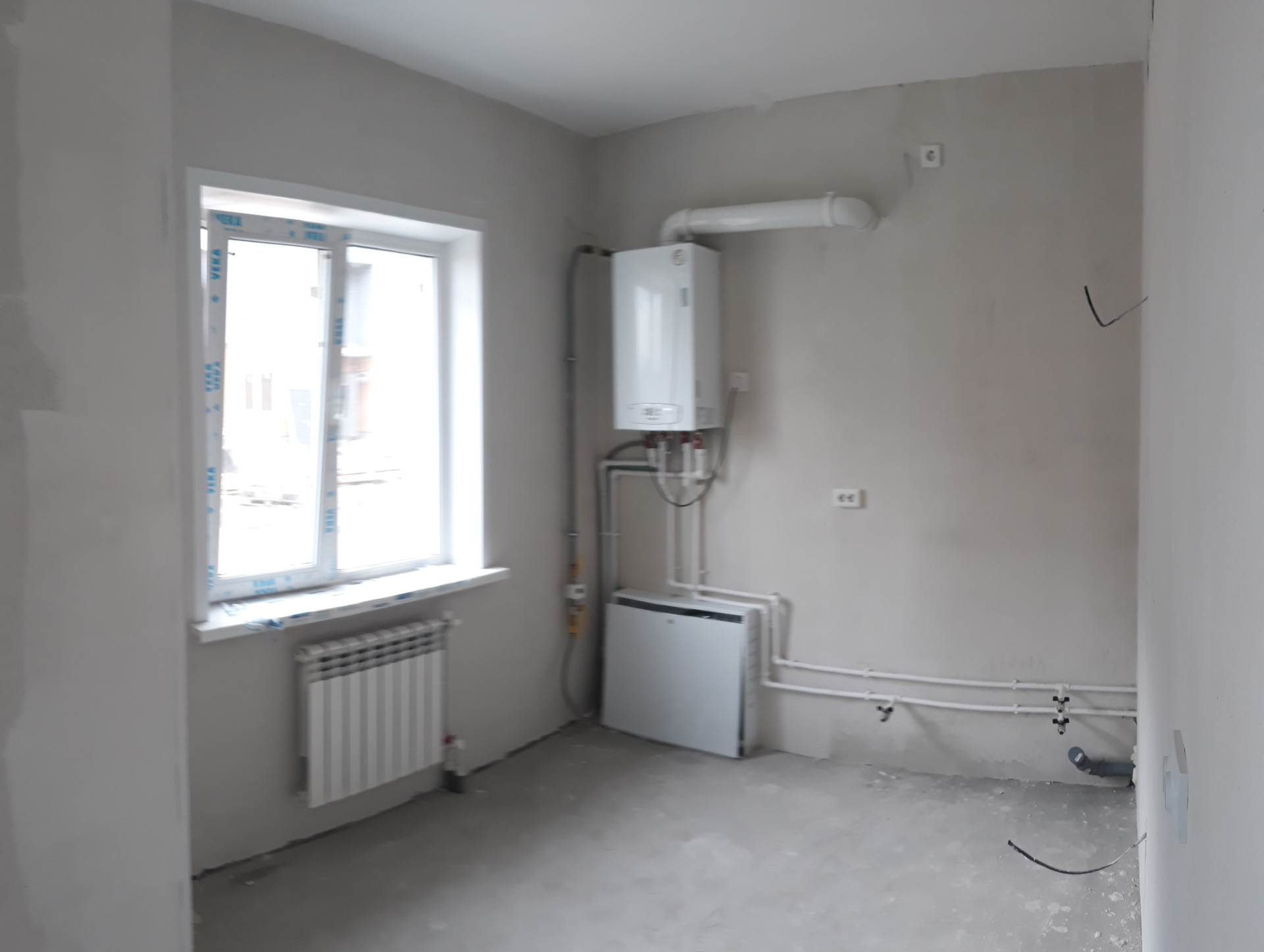 Выполнена черновая самоотделка, установлены приборы учета воды, розетки, выключатели, радиаторы отопления, будет установлен газовый котел марки Bosch, на первых этажах тёплый пол.