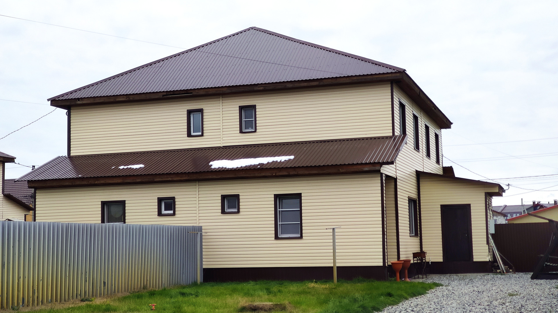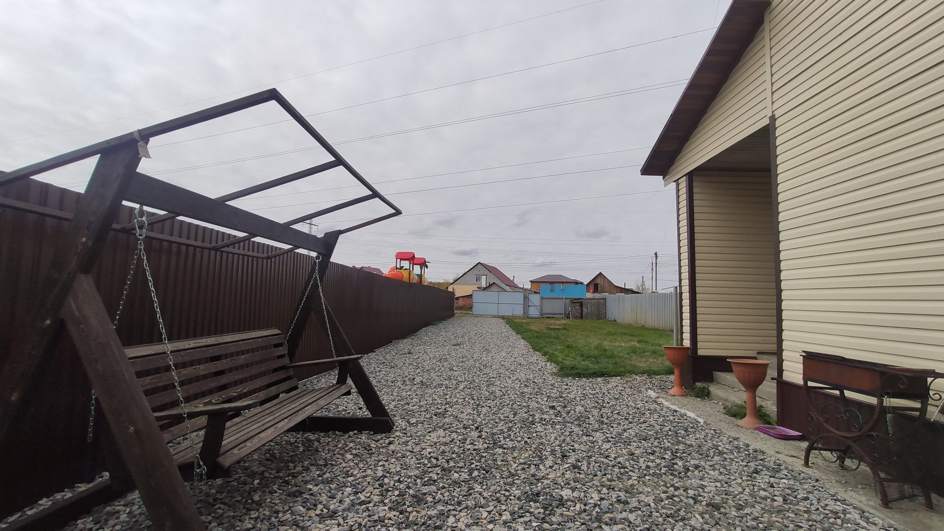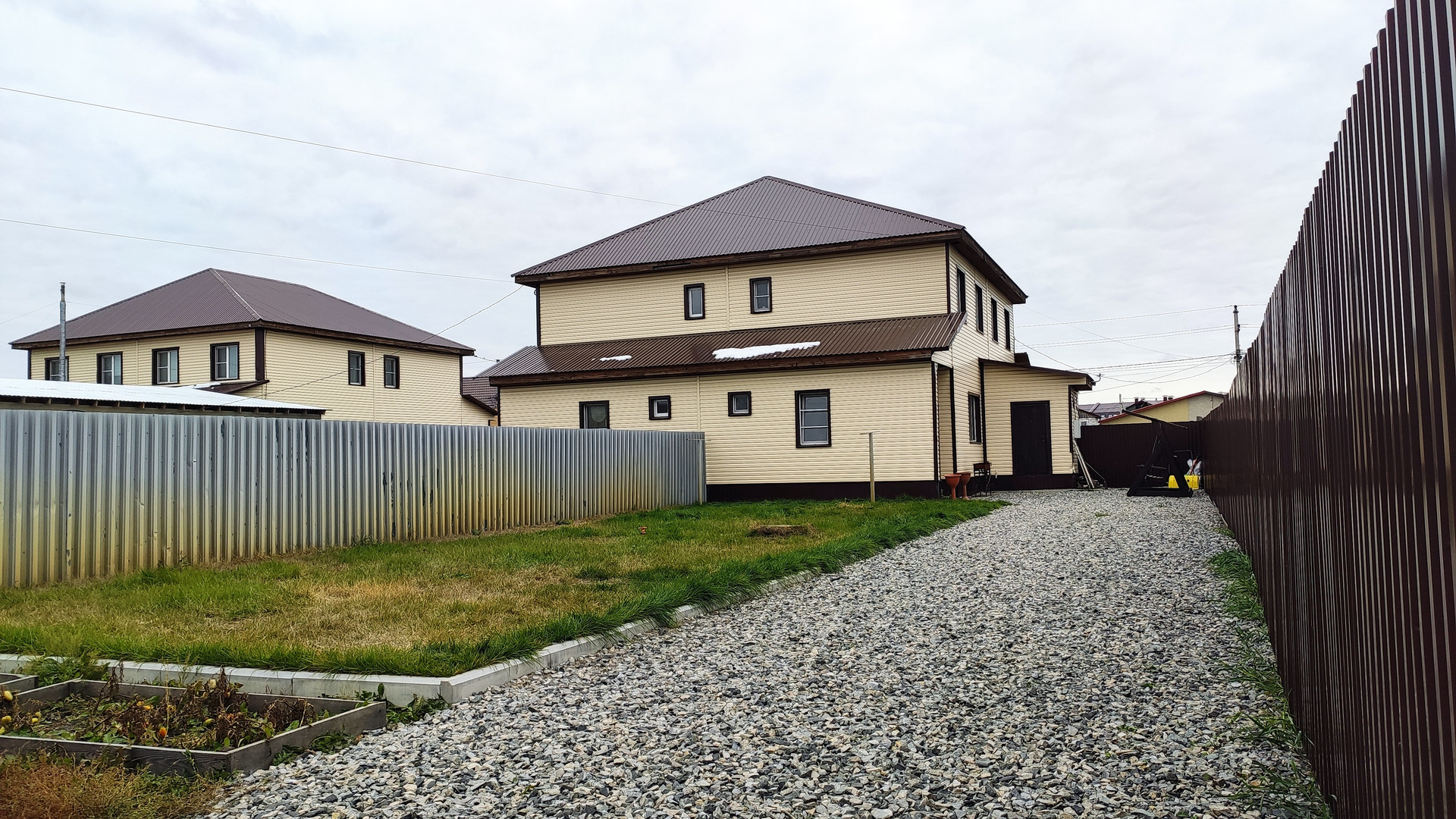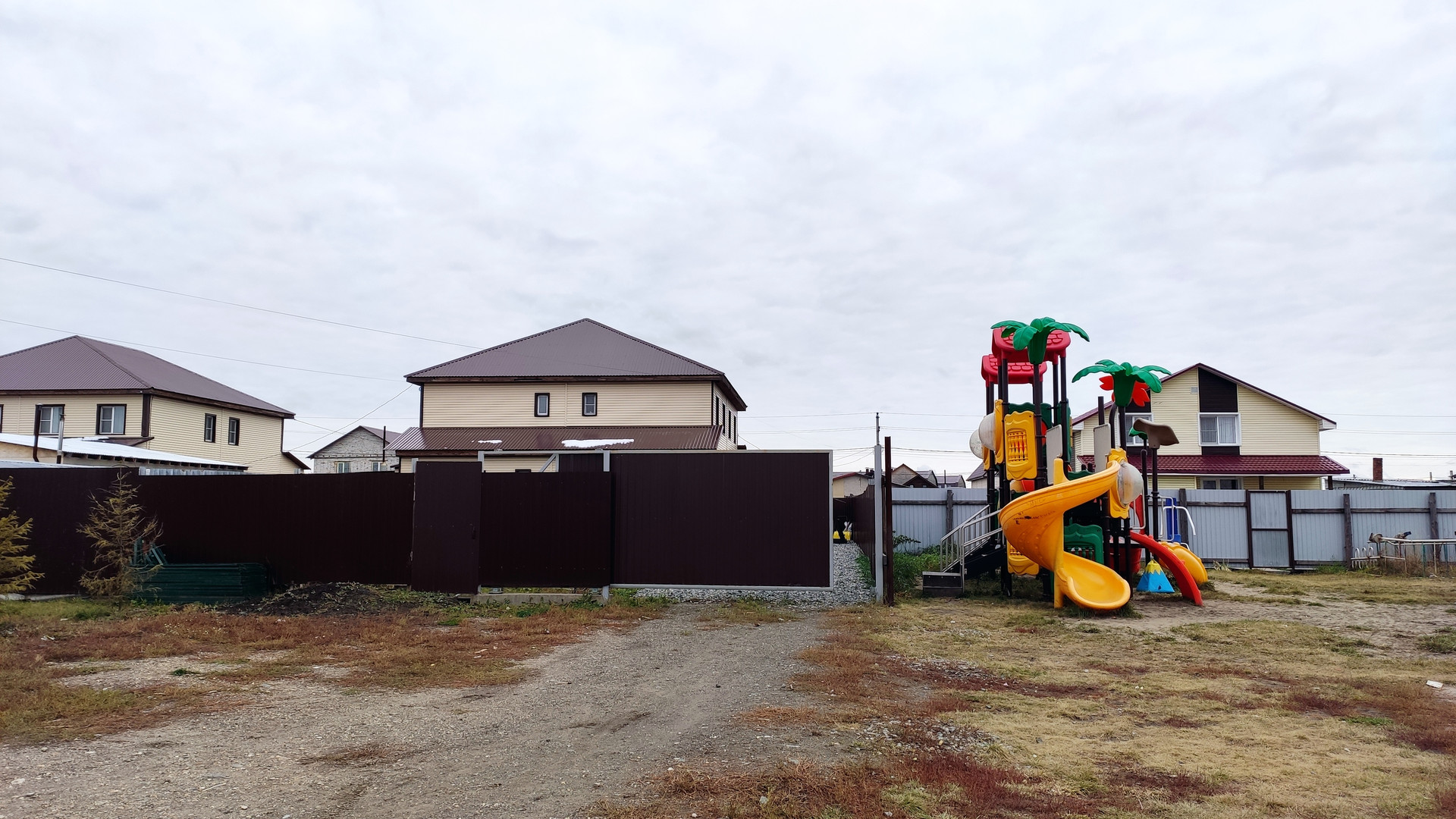 Двор отсыпан , поднят, под рулонным газоном хороший слой плодородной земли. Ворота откатные.