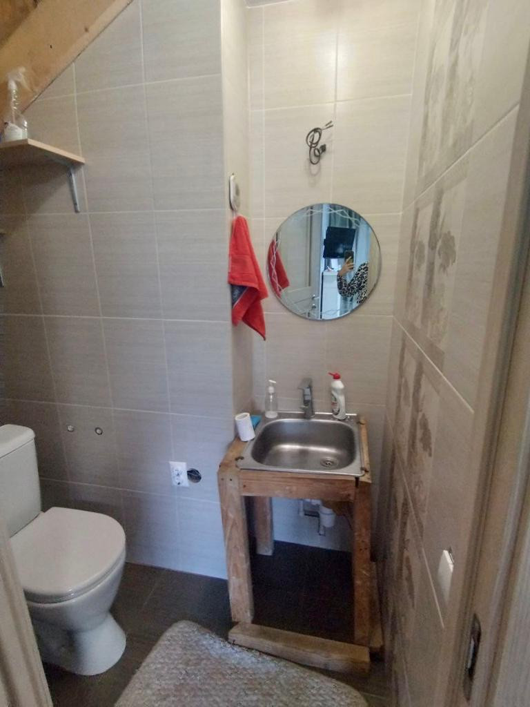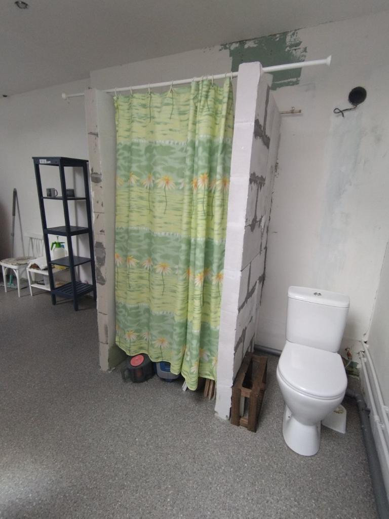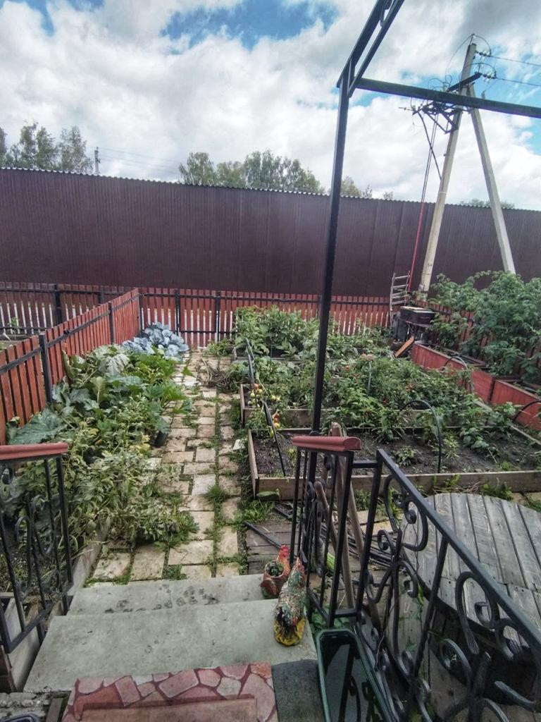 1 этаж: тамбур, прихожая со встроенной гардеробной, кухня-гостинная , общая комната, гостевой туалет ( установлен унитаз и временная раковина). Из кухни-гостинной выход на свой участок, на данный момент там организован огород. Там же можно на свой вкус организовать зону барбекю / личную детскую площадку или газон.