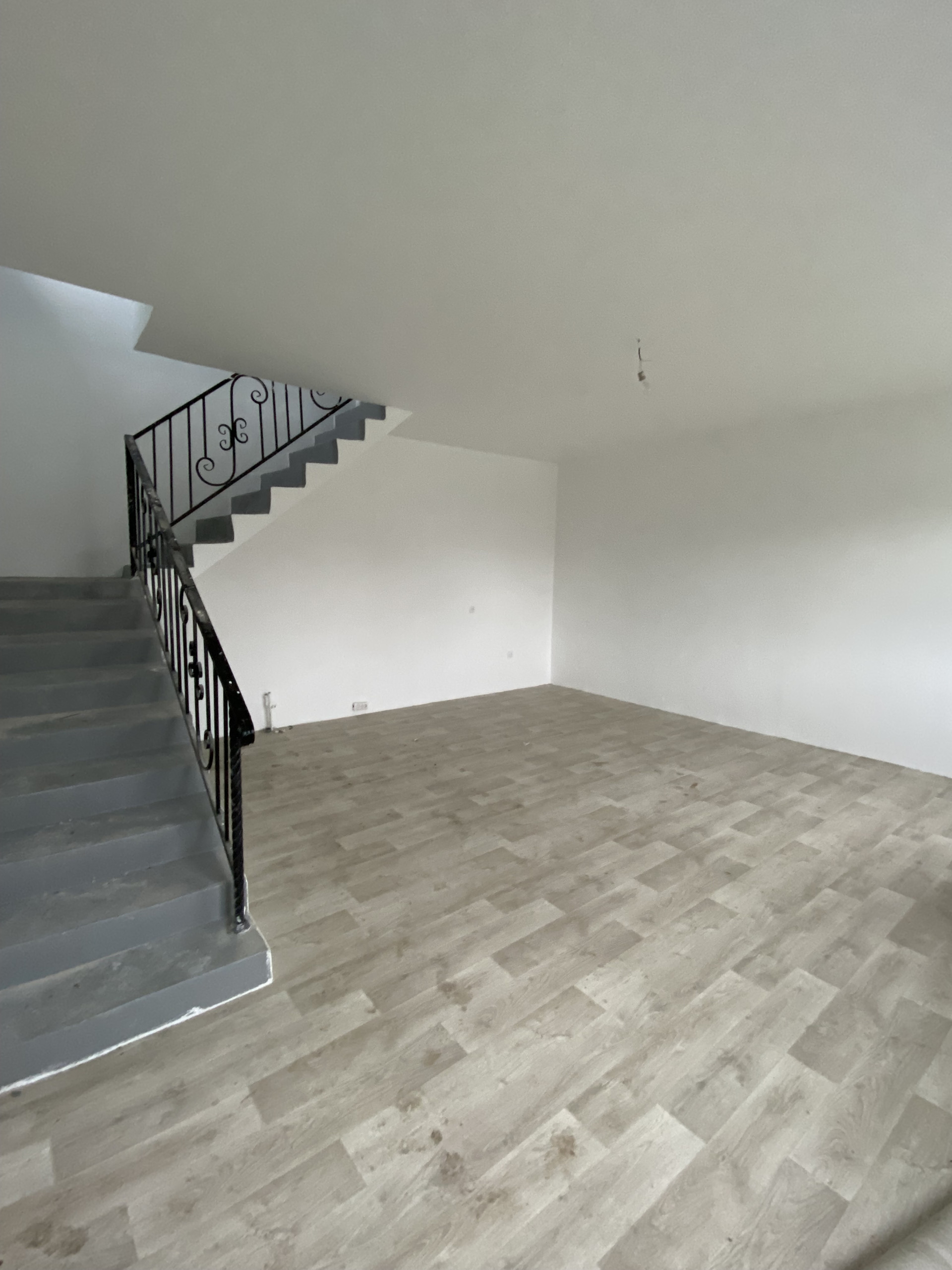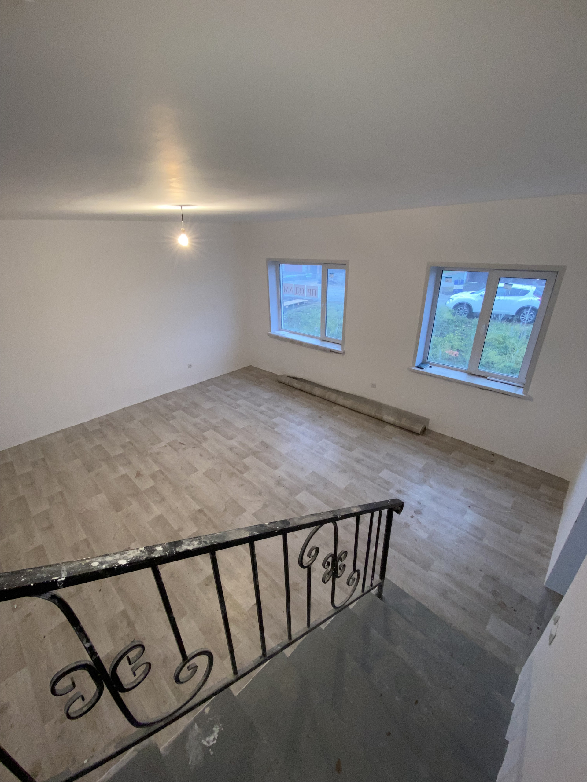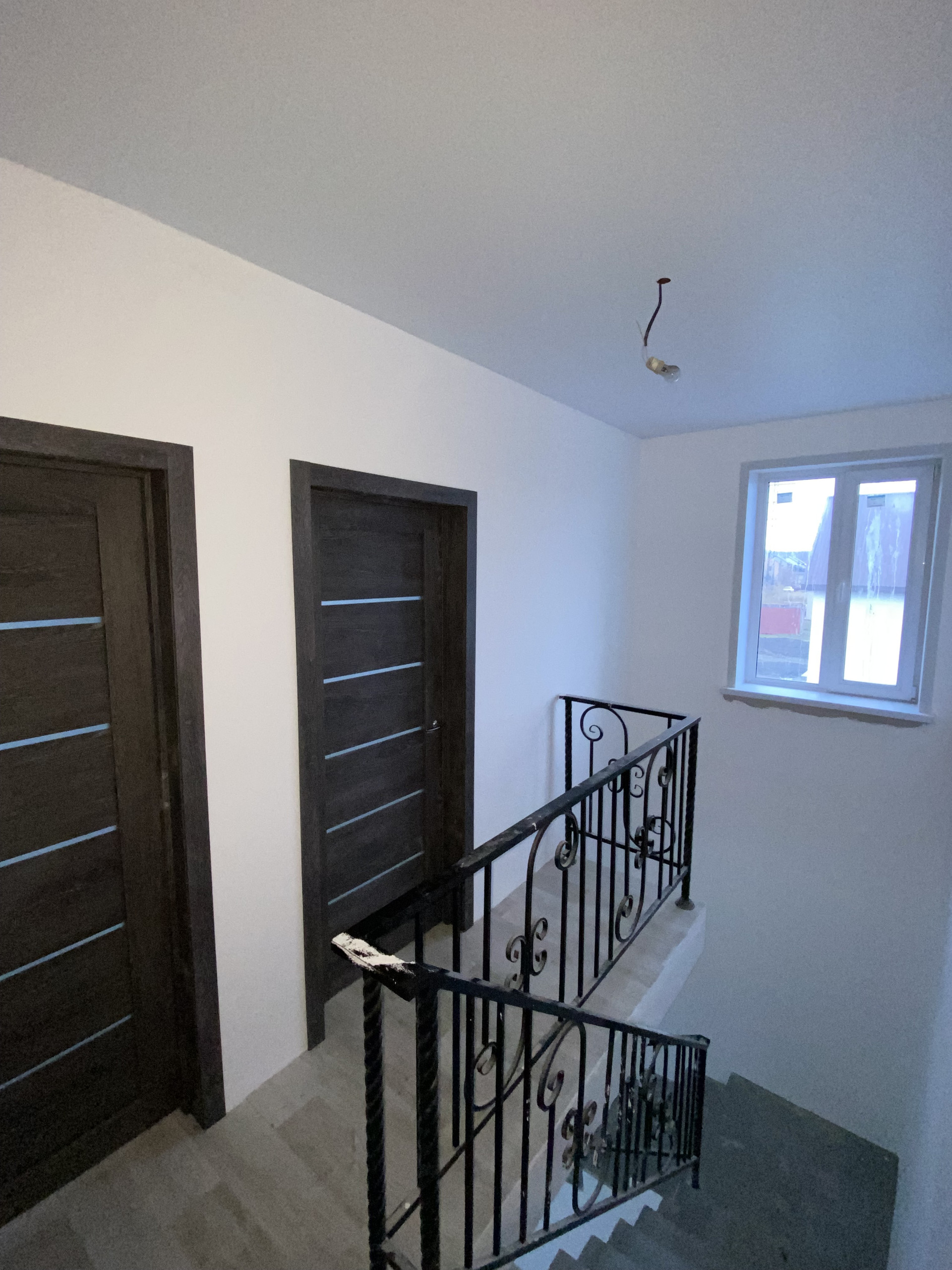 В квартире выполнен свежий ремонт в светлых тонах: на полу линолеум, стены под покраску или поклейку обоев на ваше усмотрение, установлены межкомнатные двери, кованые перила на лестнице.