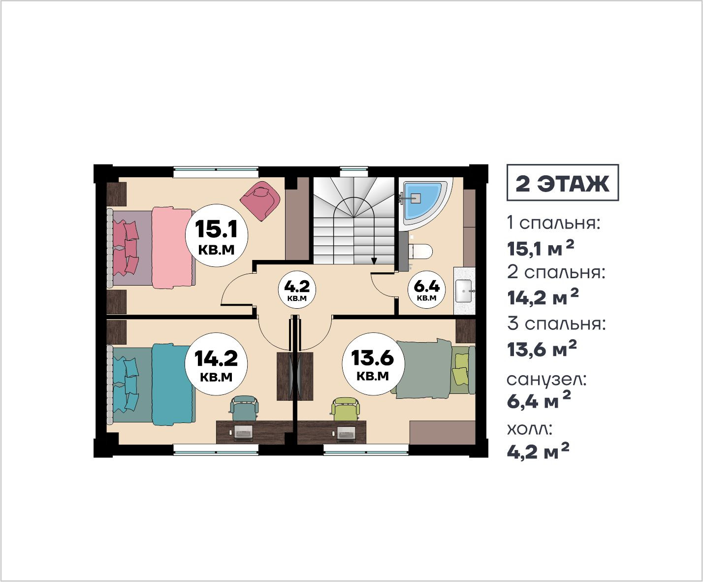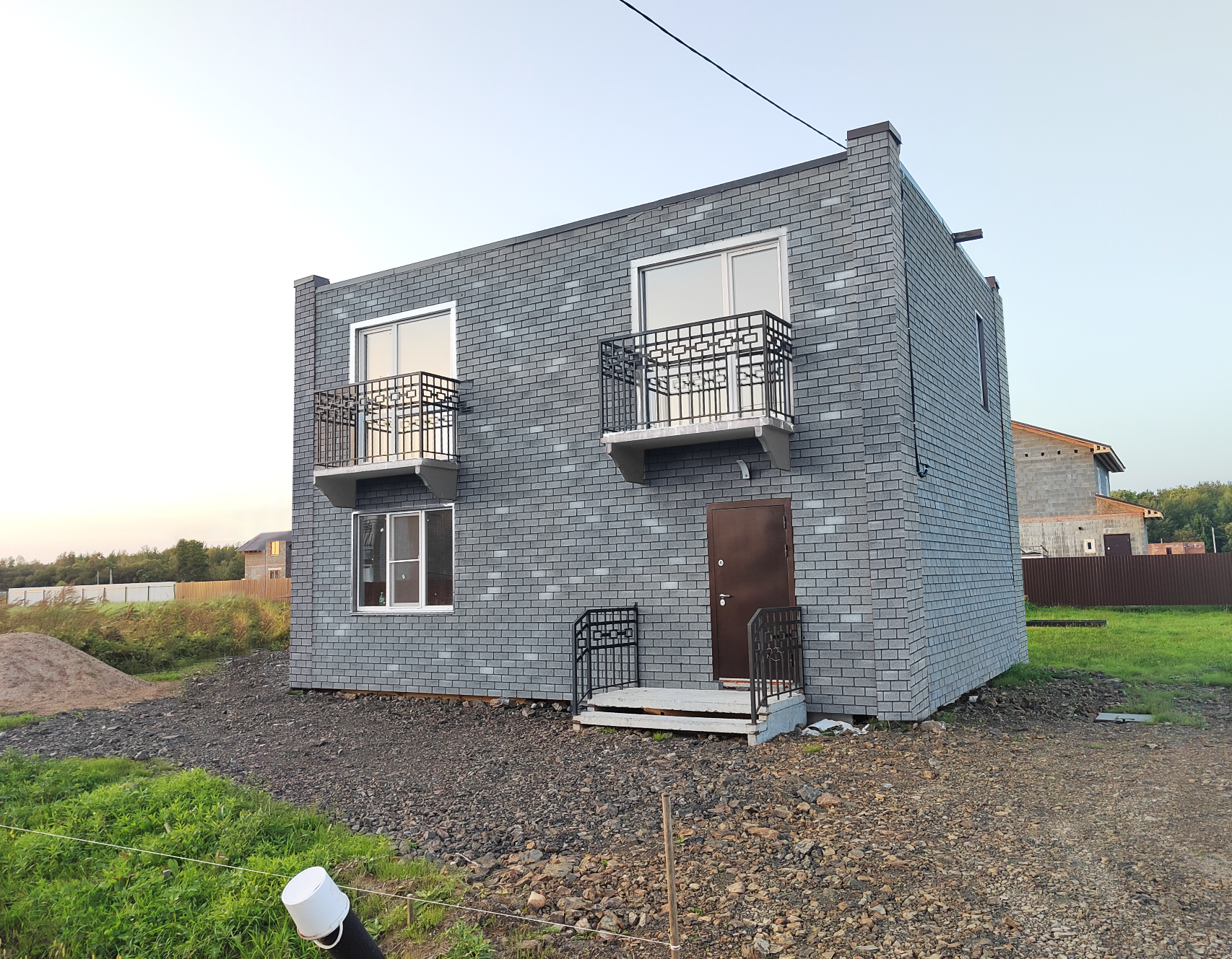 В доме большие панорамные окна, 2 красивых кованых балкона в двух спальнях, качественная утепленная входная дверь с терморазрывом. В гостиной предусмотрен второй выход на участок - здесь вы сделаете террасу, на которой сможете утром выпить чашечку кофе, пообедать в кругу семьи или весело провести время в компании друзей.