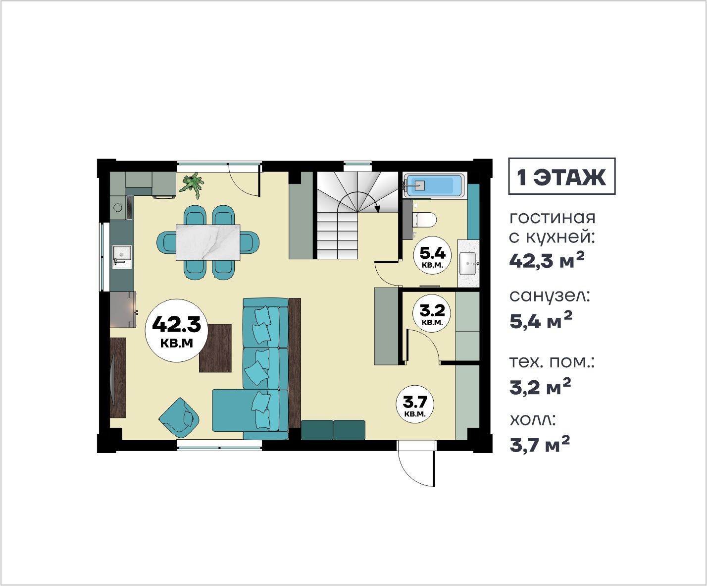 В доме свободная планировка! По проекту на первом этаже просторная кухня-гостиная 43 м2, гостевой санузел, тех. комната под коммуникации, а на втором этаже три светлые, уютные спальни и второй санузел (что очень полезно для большой семьи). Внутри дома состояние после строителей.