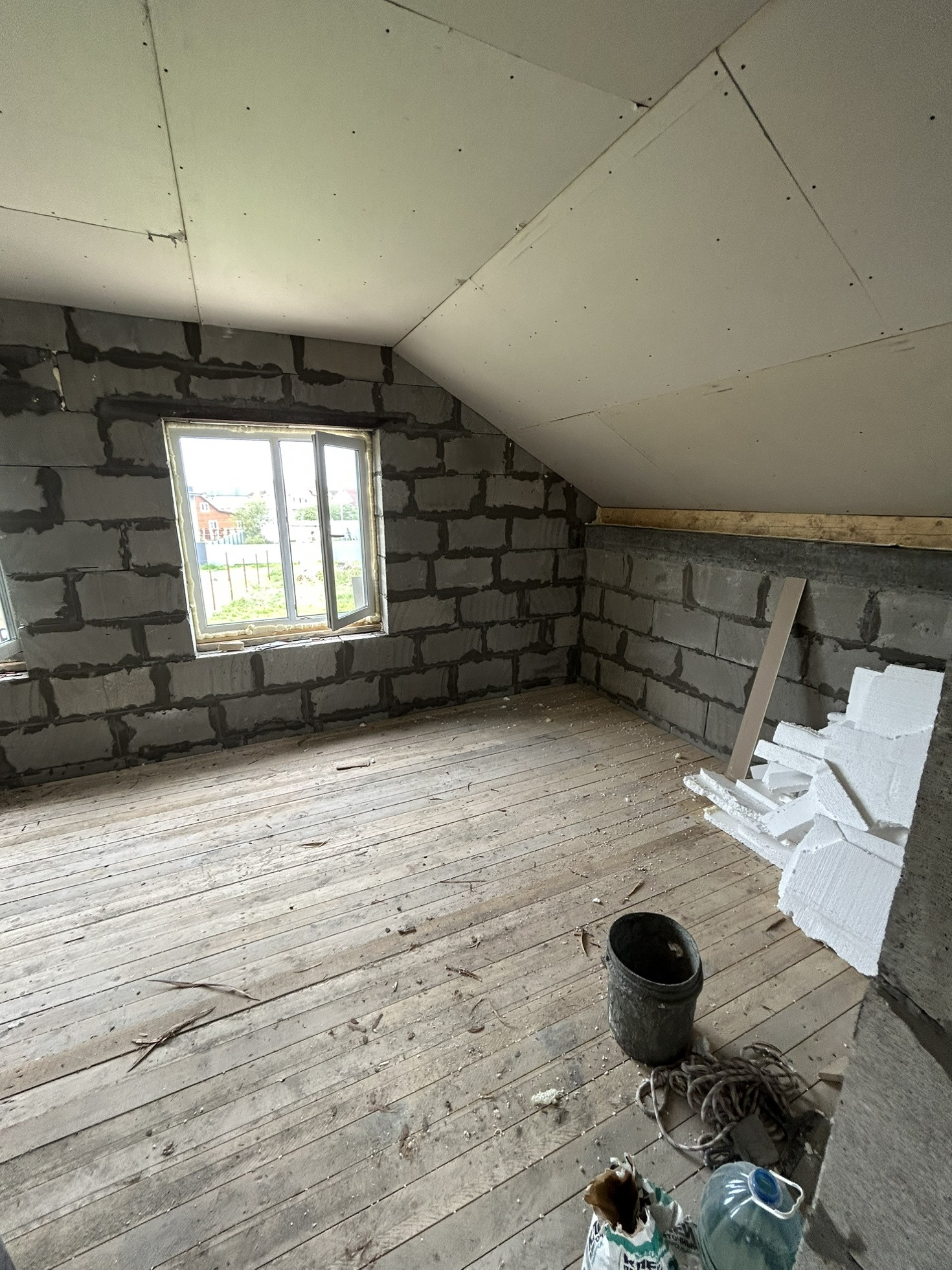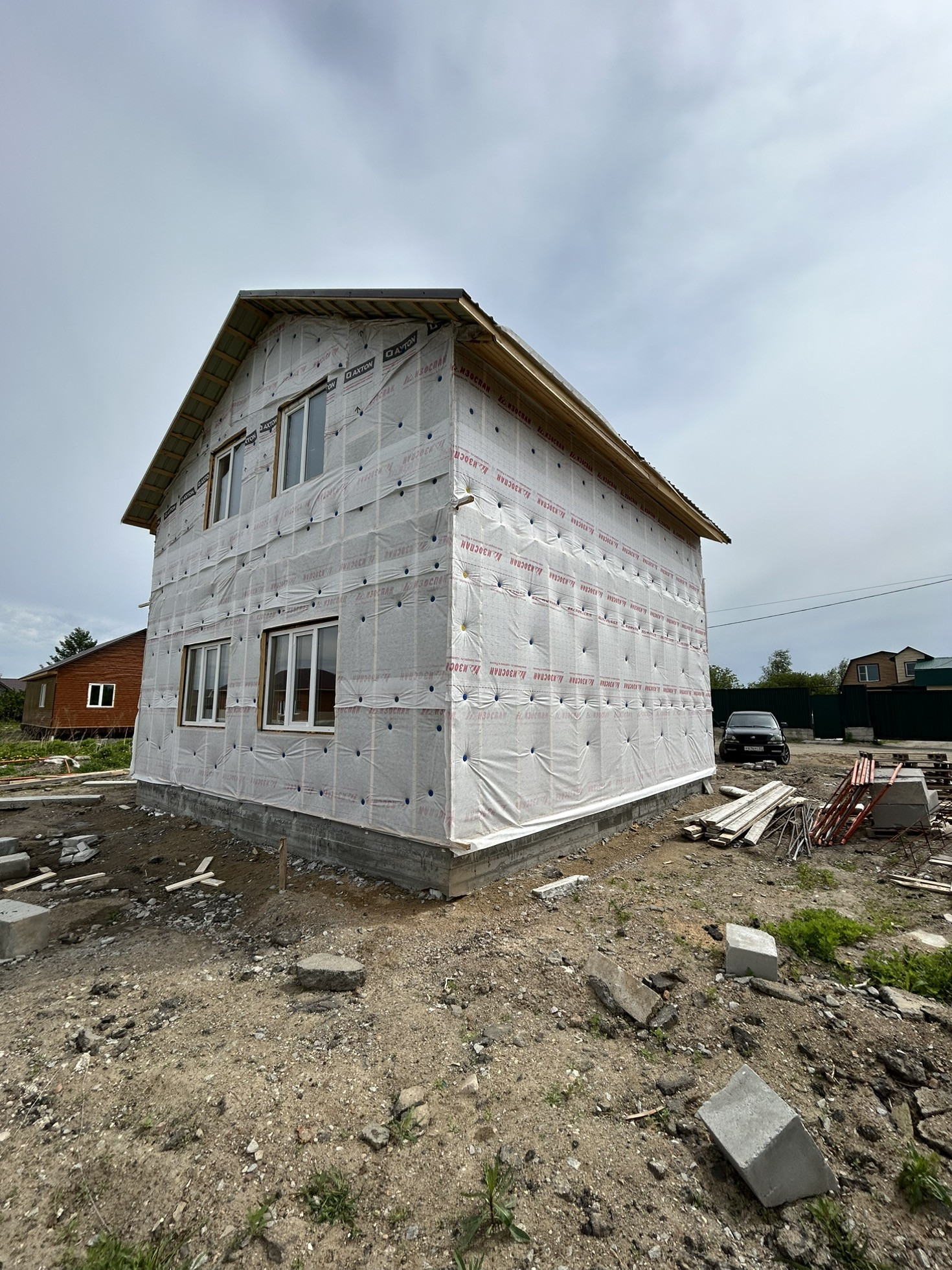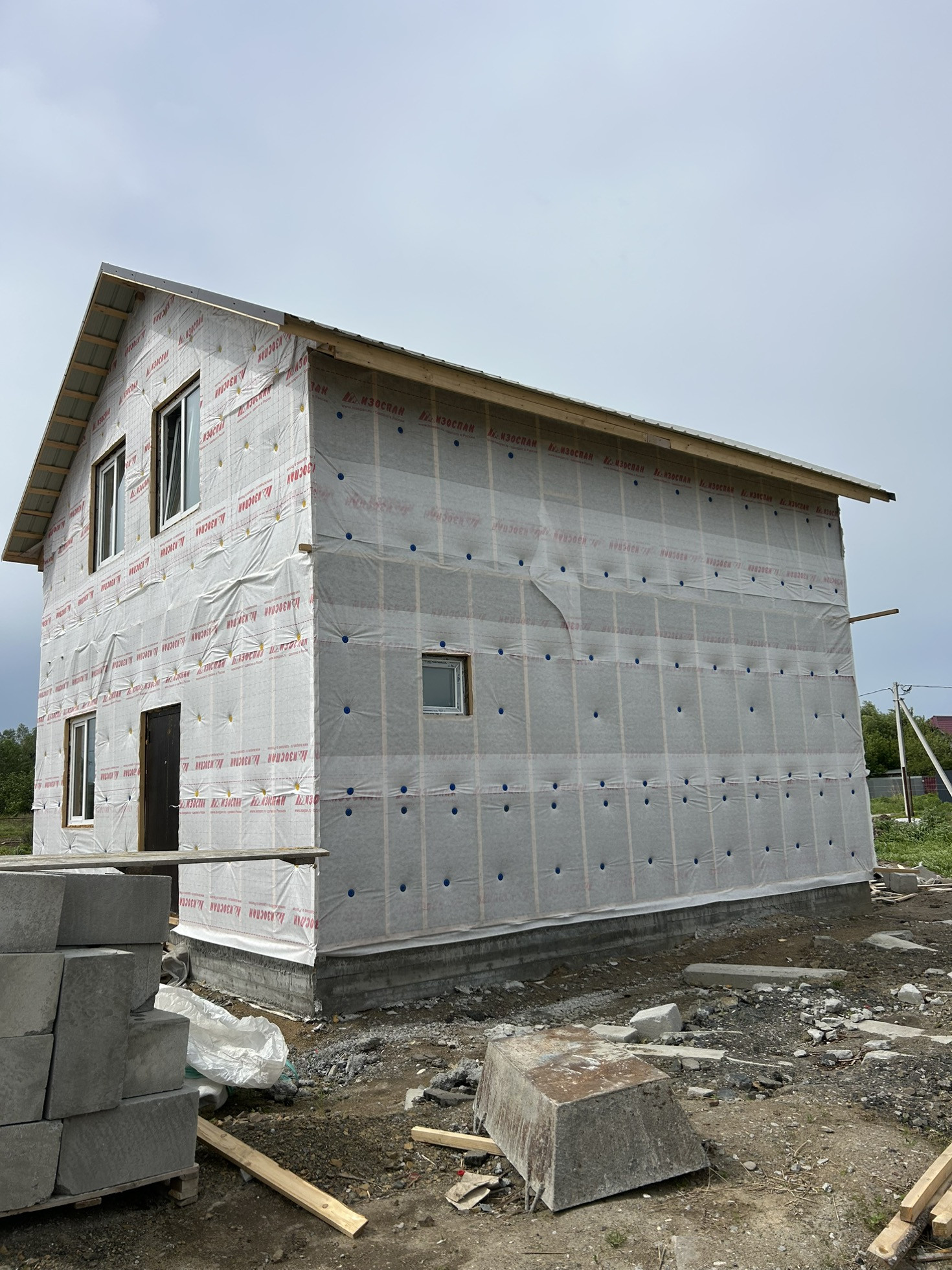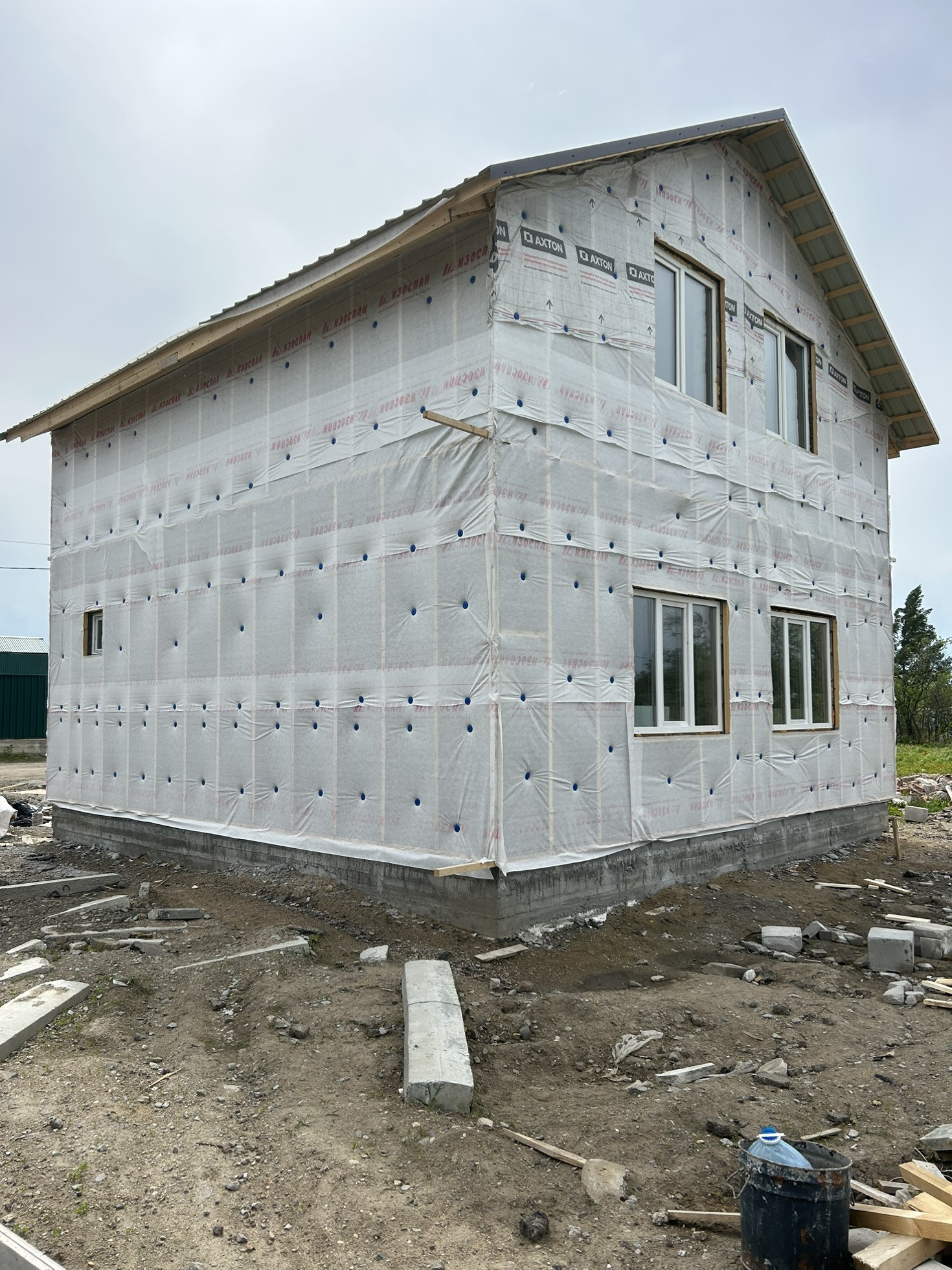 Дом из газоблока с мансардной крышей Шамбо 10 кубов ,черновая отделка,утеплен базалитом и зашит в ветро-влаго защиту .Перекрытие-деревянные лаги.лестница в процессе сборки