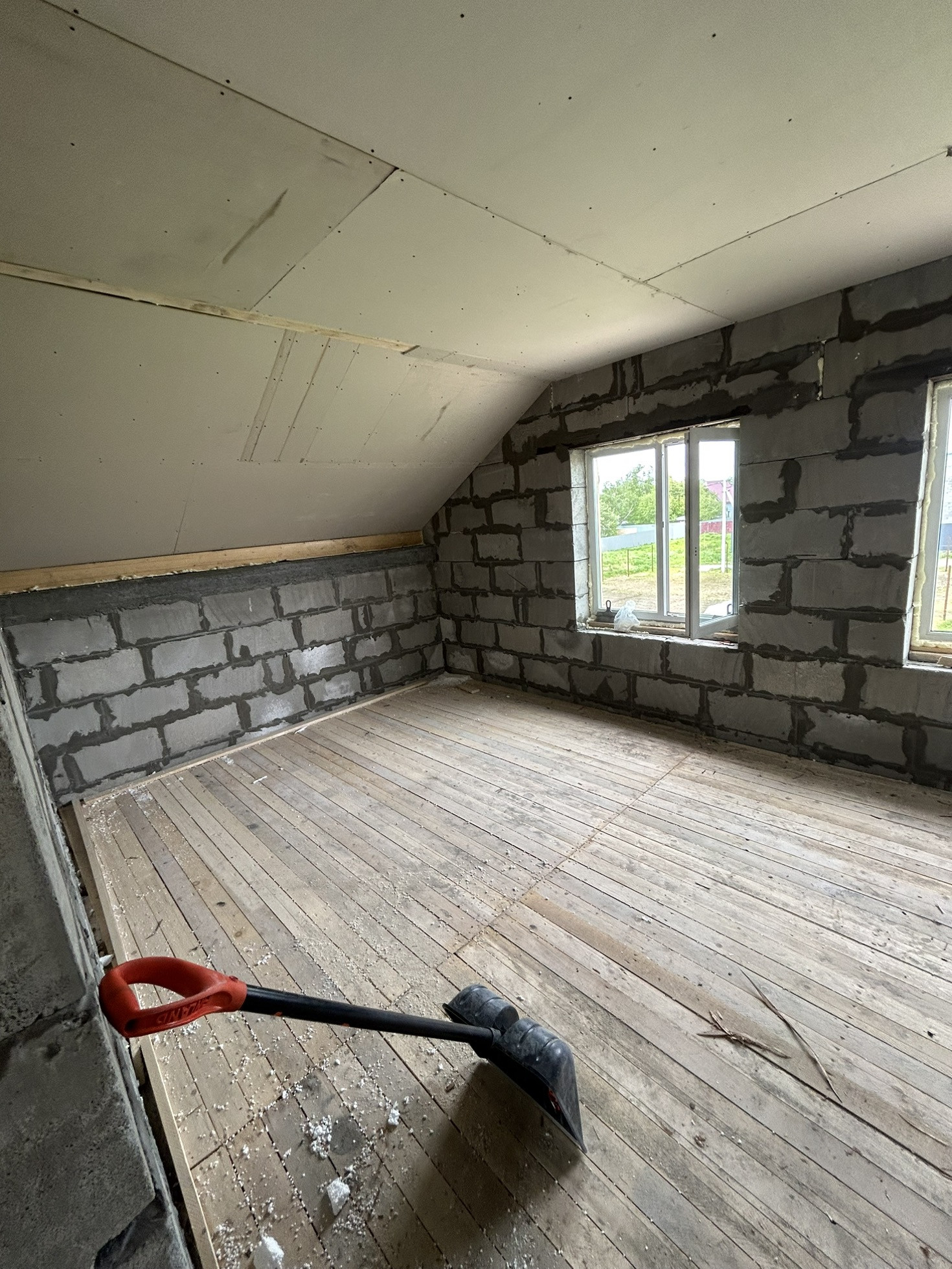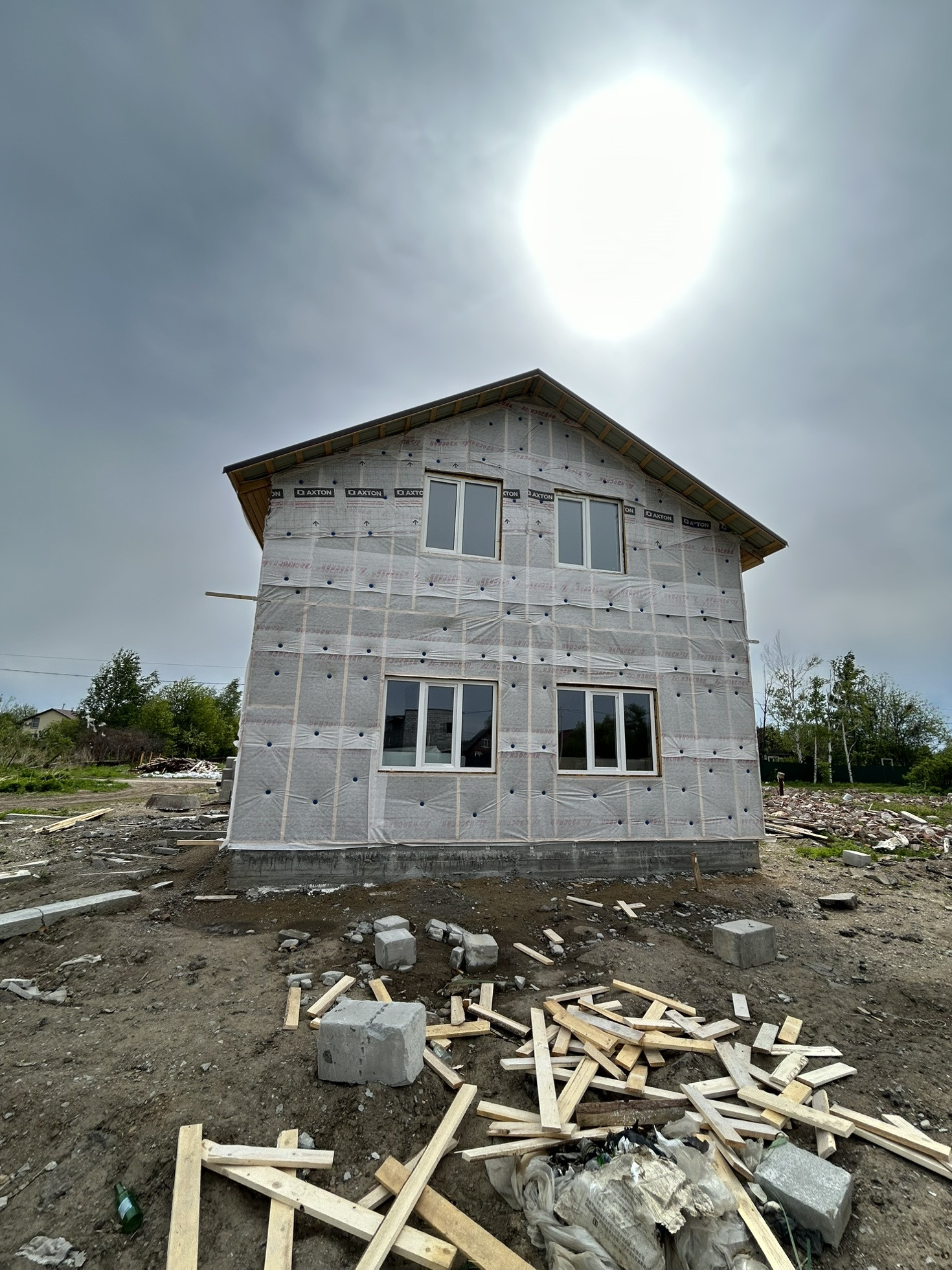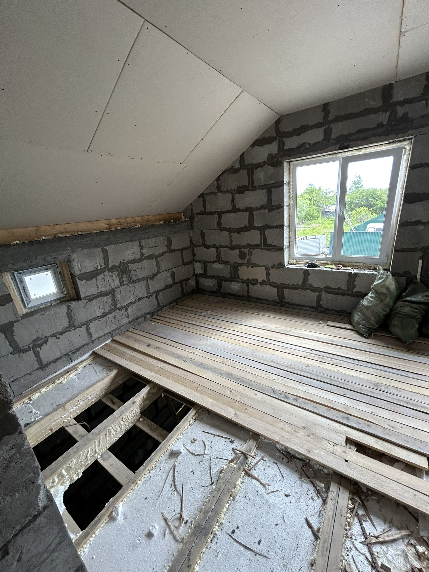 Дом из газоблока с мансардной крышей Шамбо 10 кубов ,черновая отделка,утеплен базалитом и зашит в ветро-влаго защиту .Перекрытие-деревянные лаги.лестница в процессе сборки