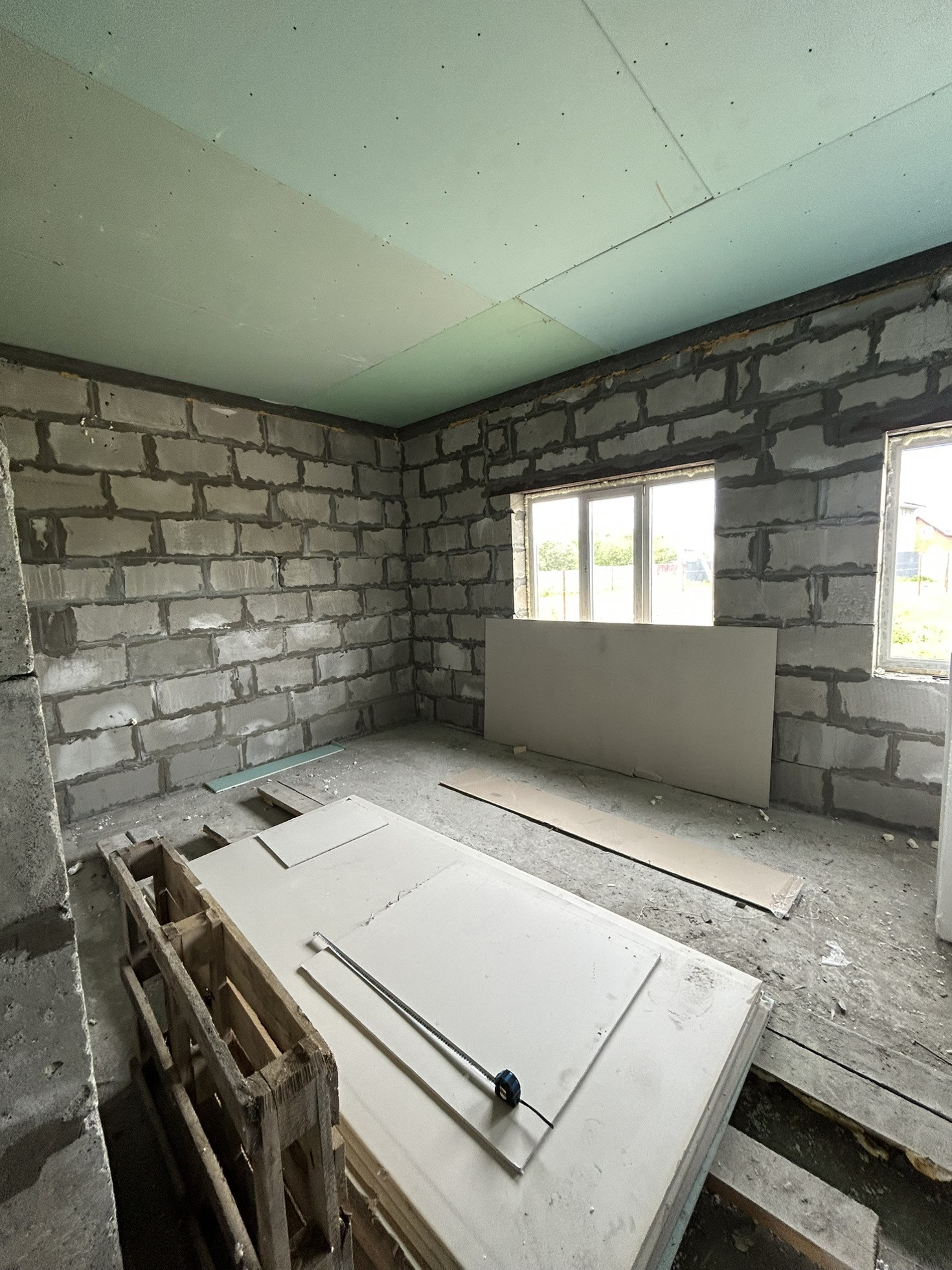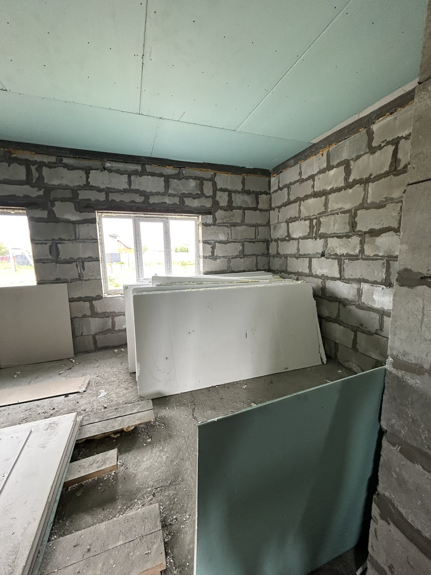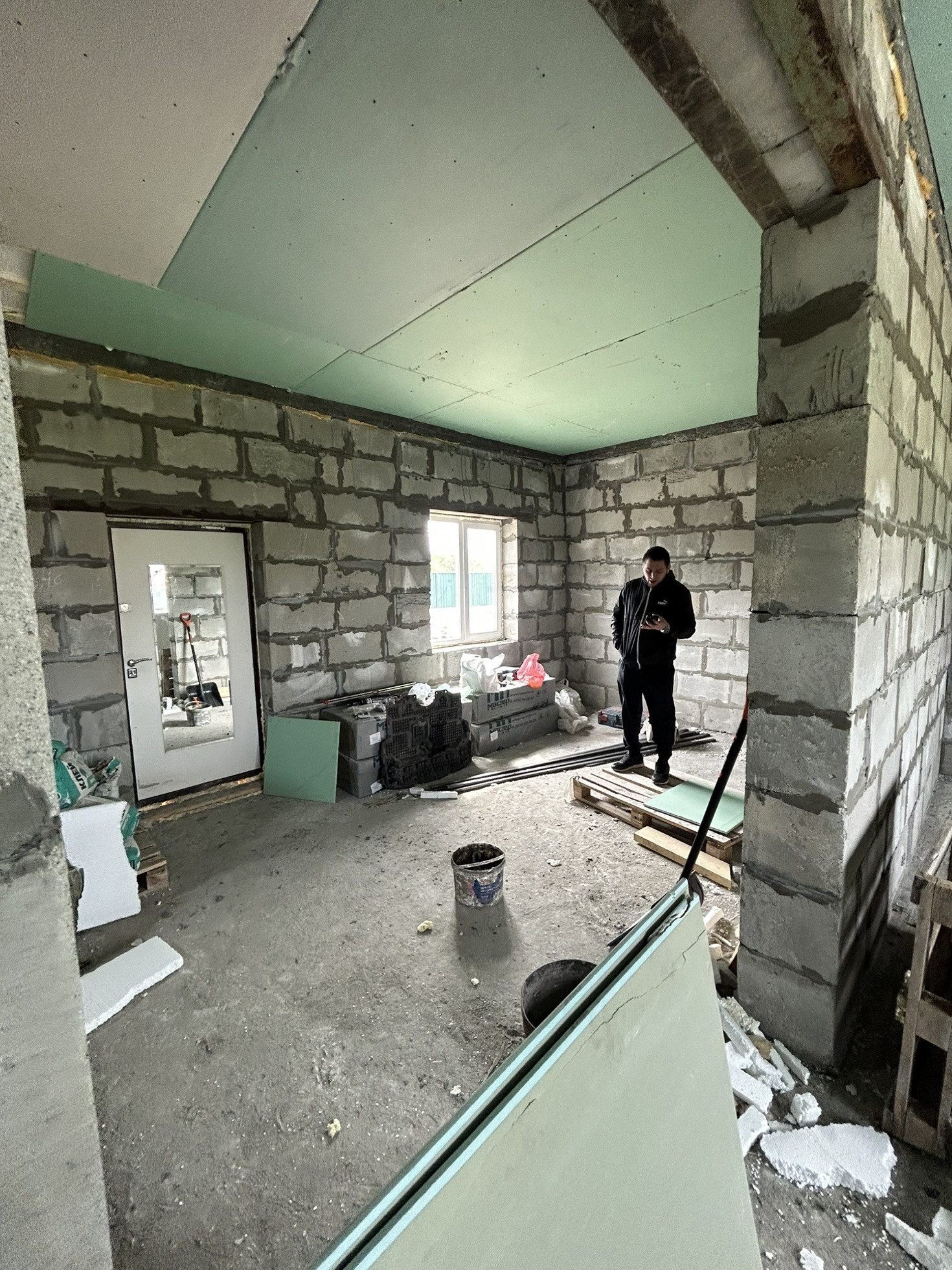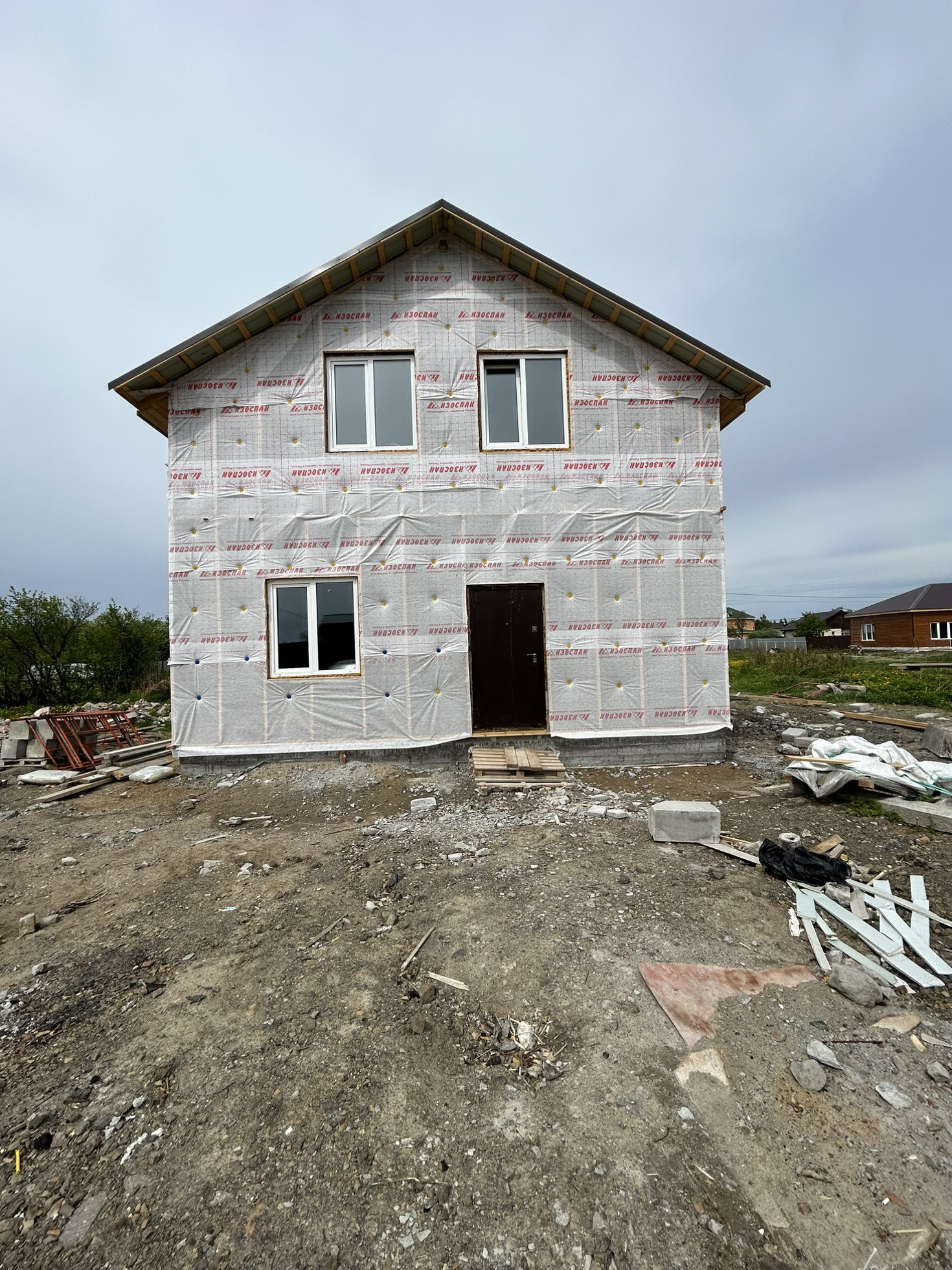Дом из газоблока с мансардной крышей Шамбо 10 кубов ,черновая отделка,утеплен базалитом и зашит в ветро-влаго защиту .Перекрытие-деревянные лаги.лестница в процессе сборки