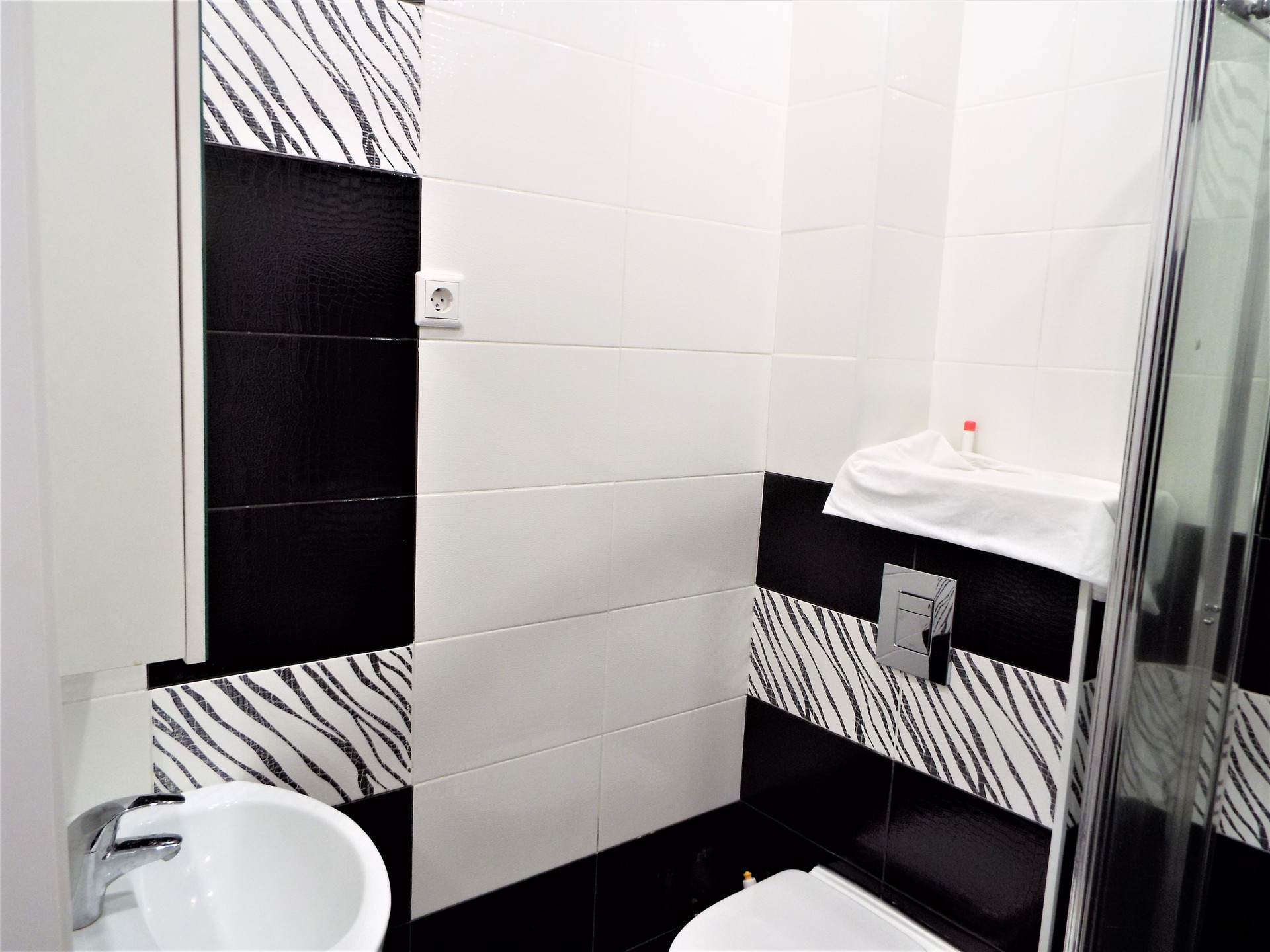 В сан.узле качественный кафель, душевая кабинка, новая дорогая сантехника, электрический полотенцесушитель.