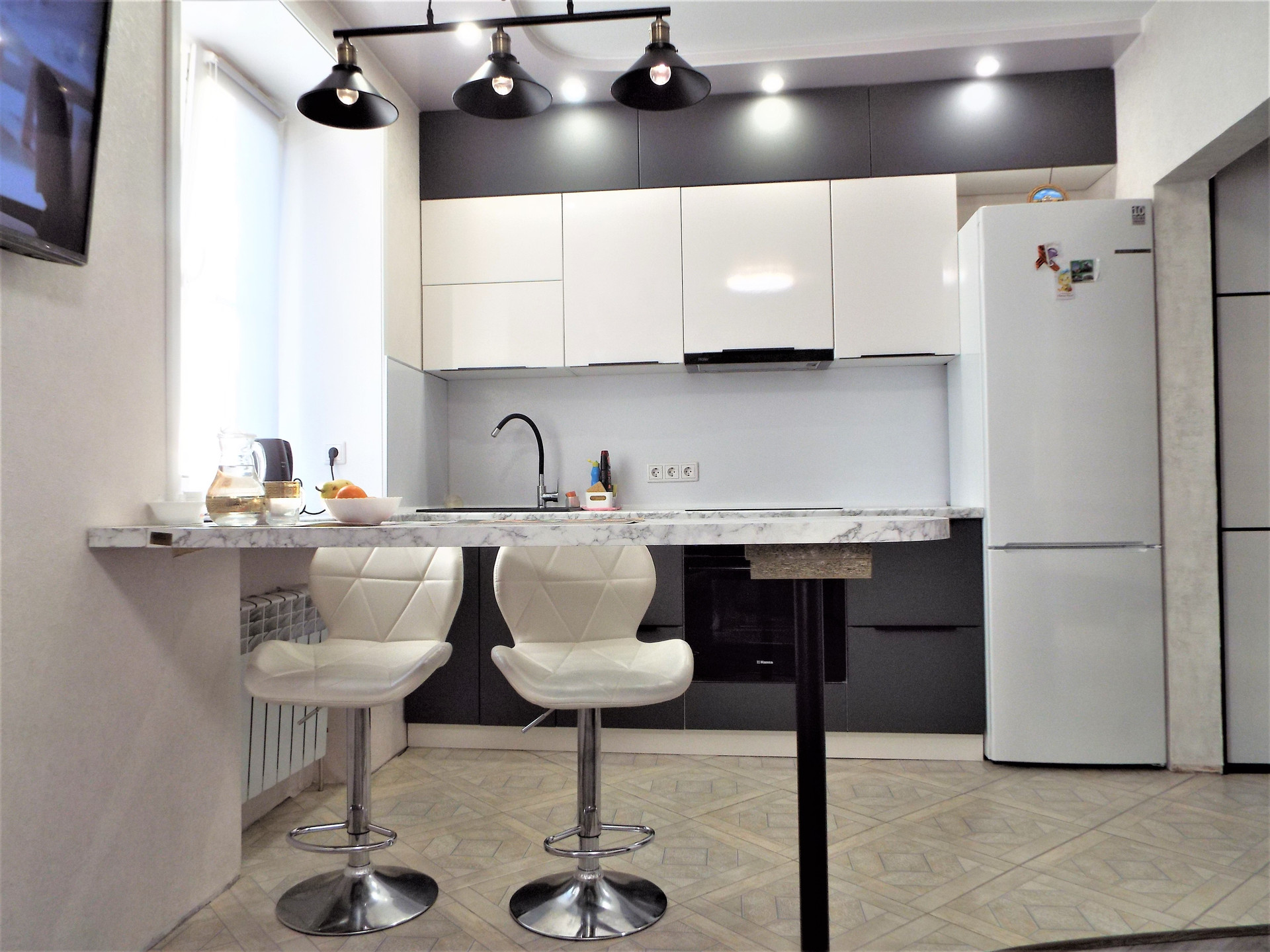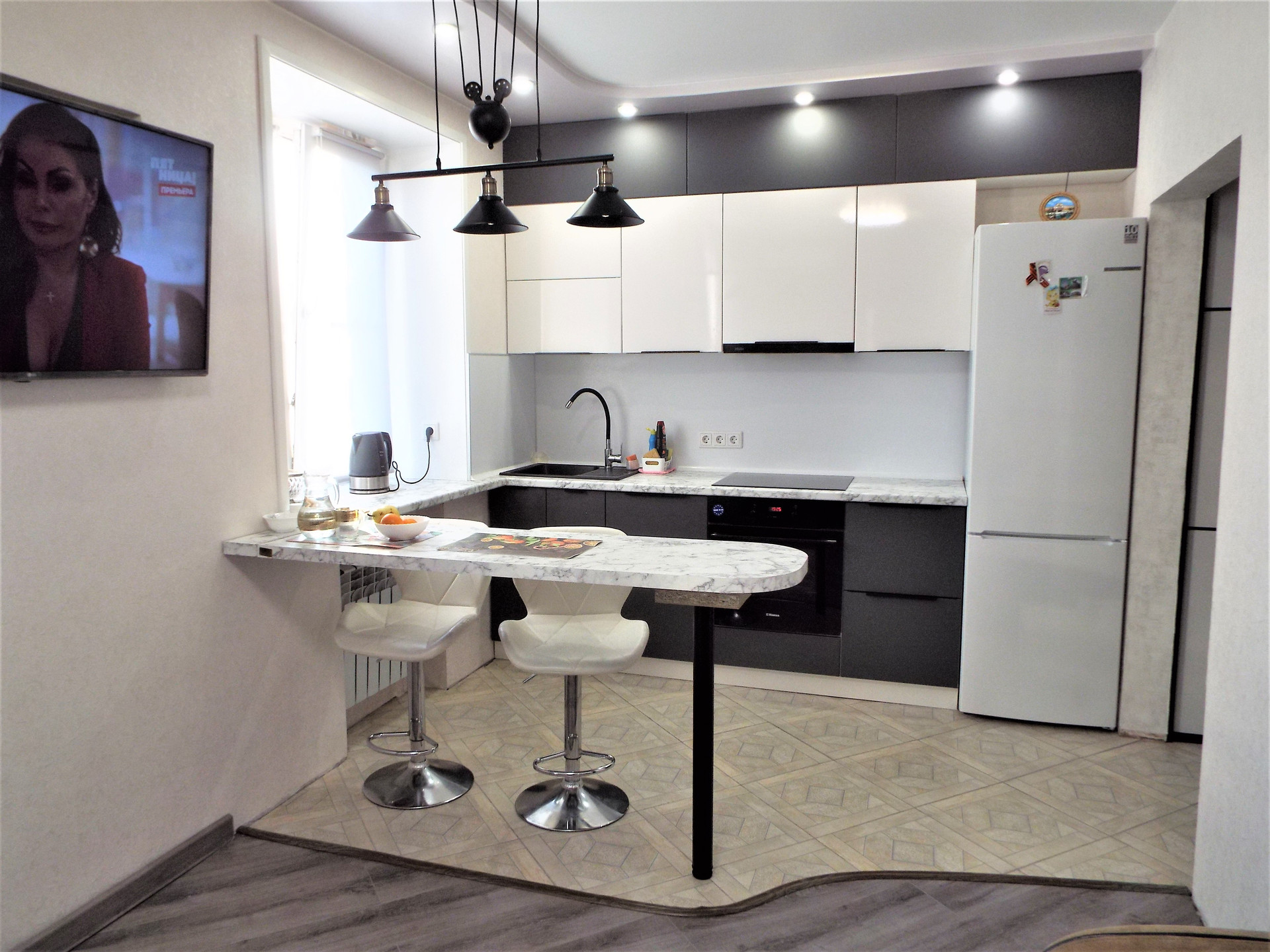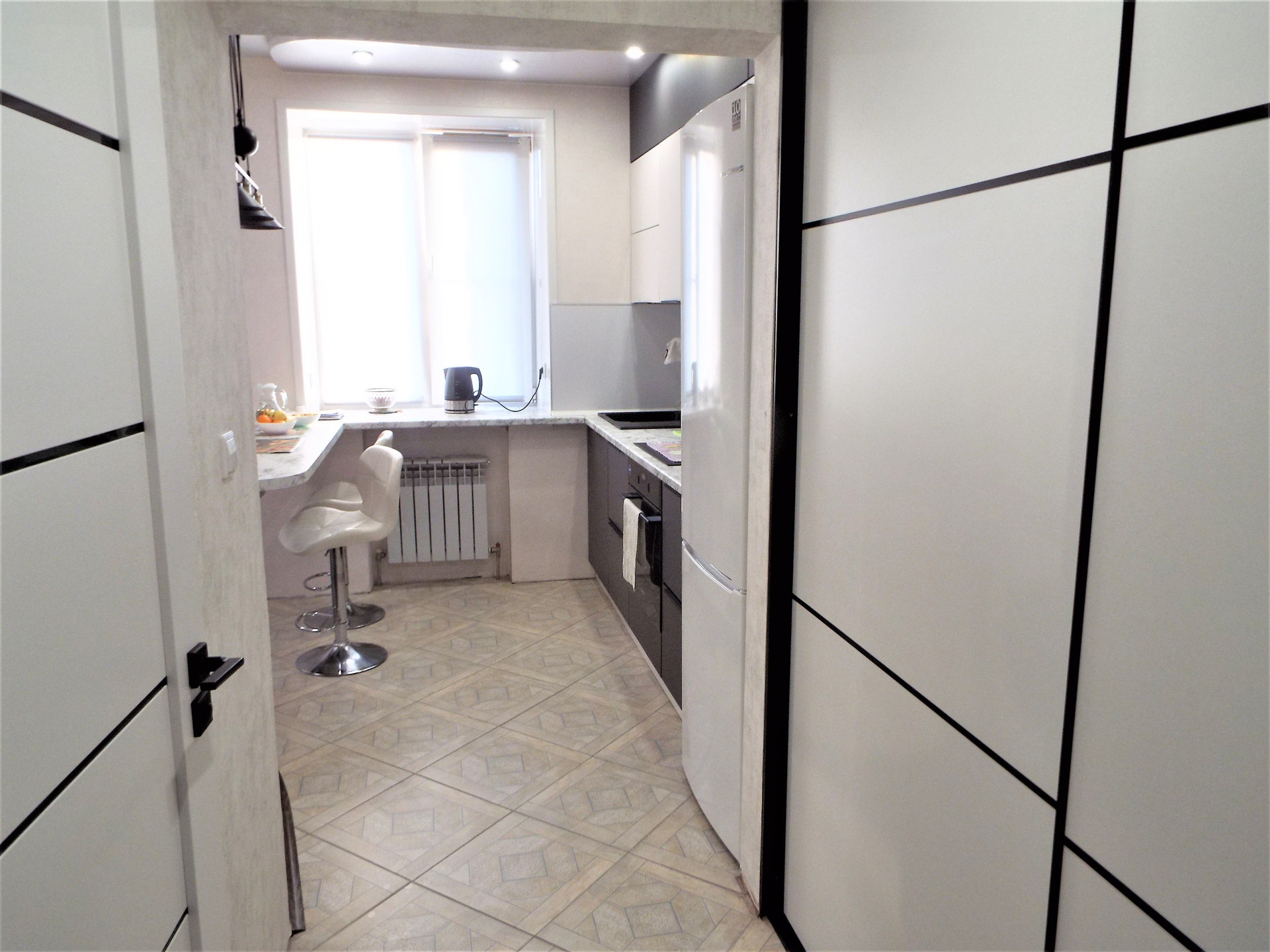 Стильный современный ремонт в квартире- полы частично керамогранит, частично- ламинат.