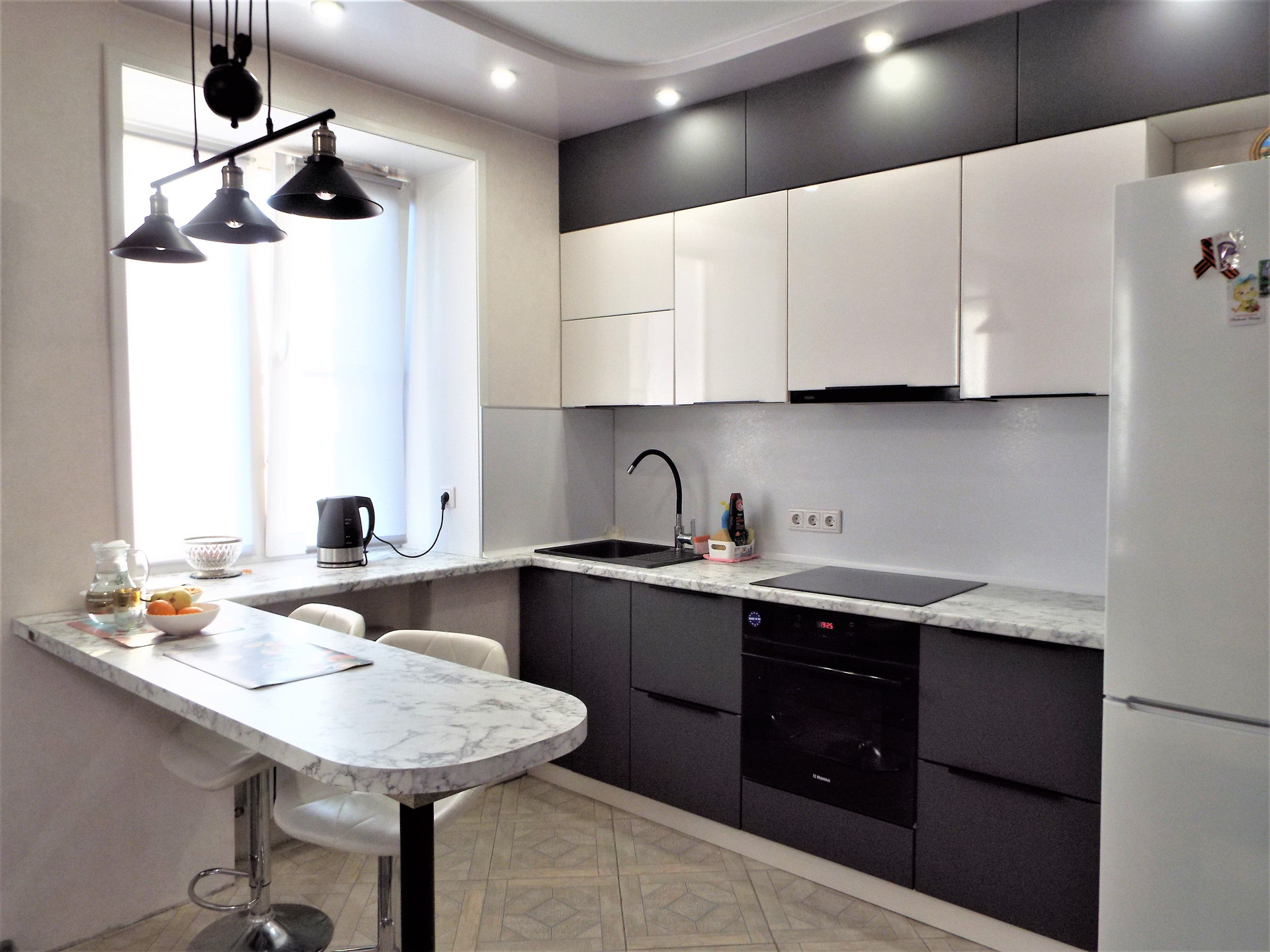 В кухонной зоне- дорогой современный гарнитур, встроенная техника (варочная панель, духовой шкаф, вытяжка)