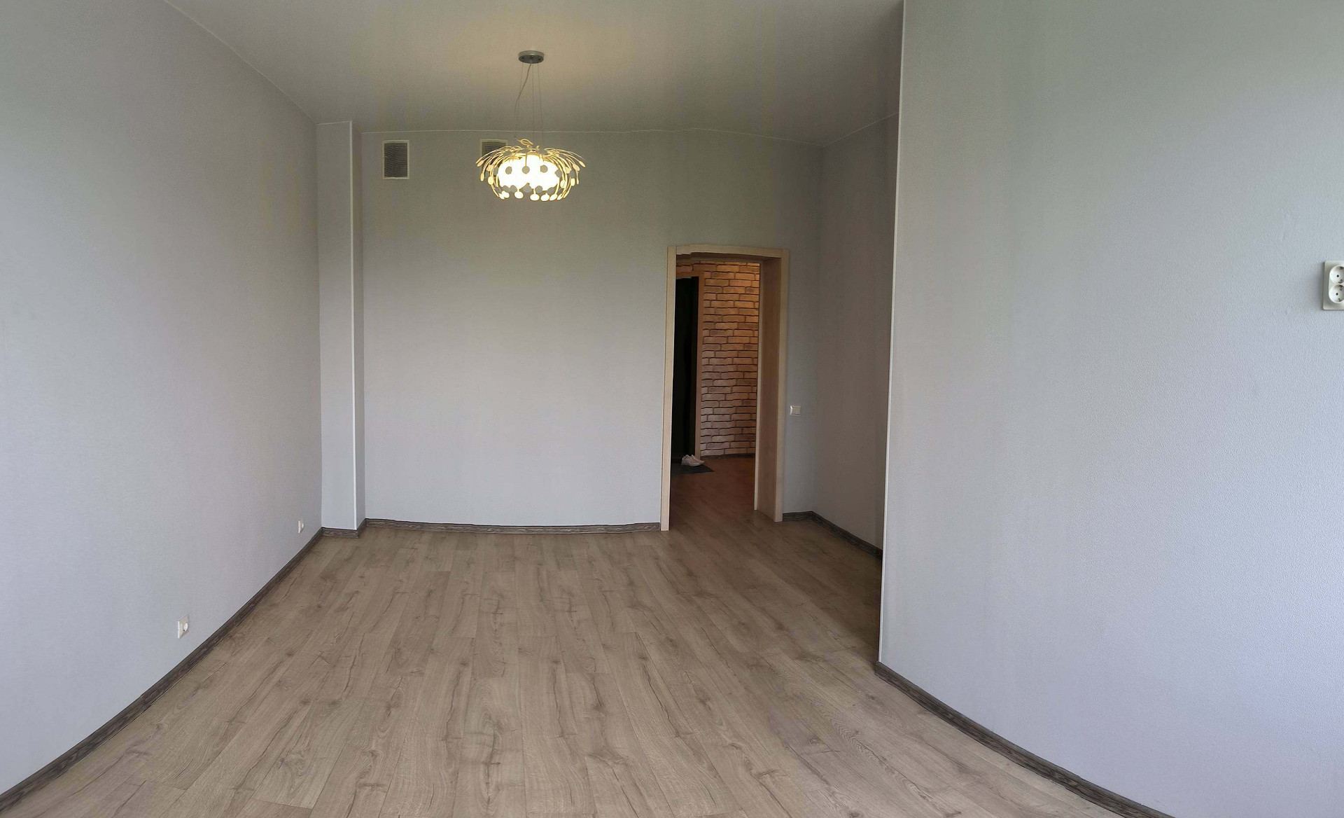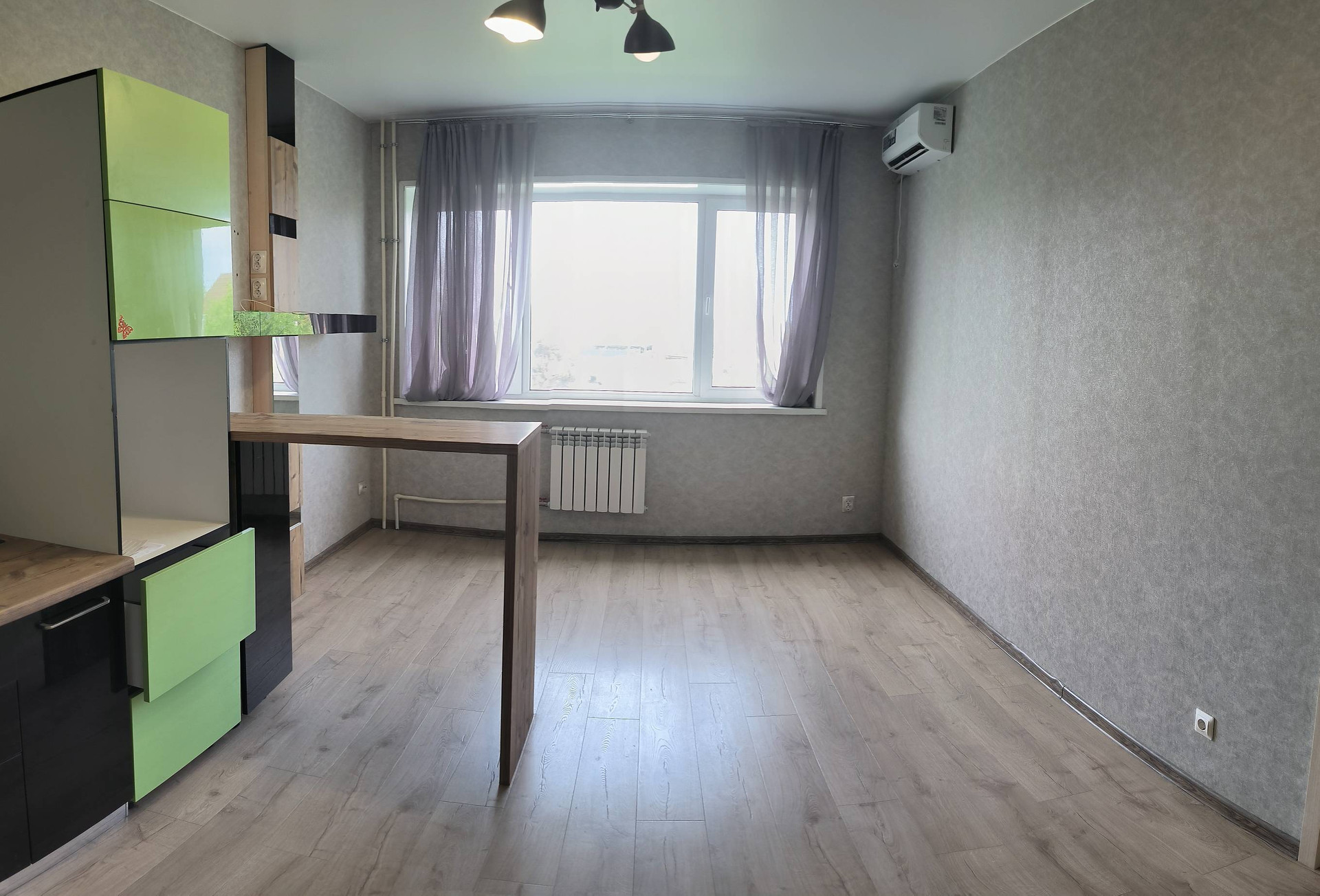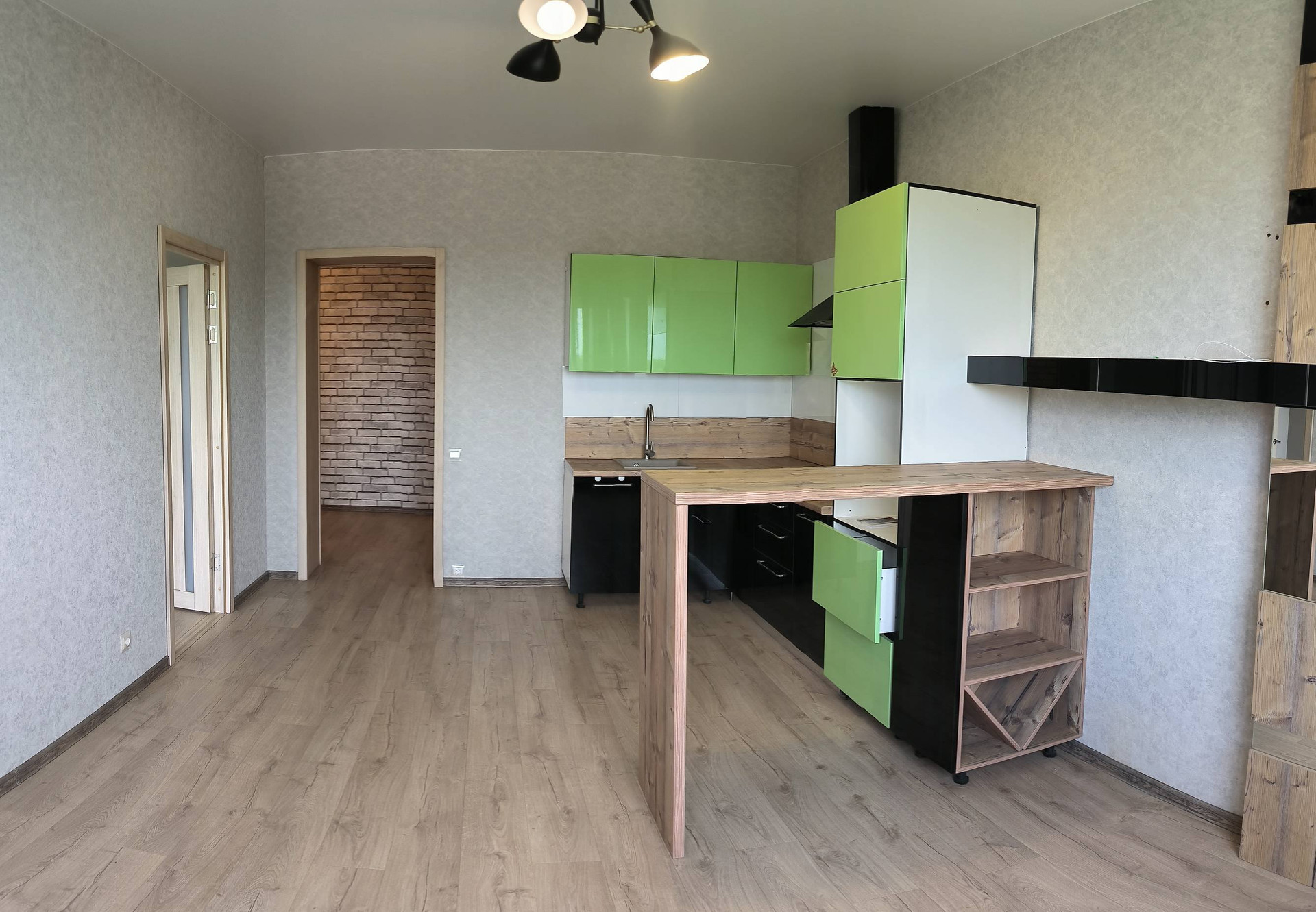 Просторный холл, кухня-гостиная (с кухонным гарнитуром и встроенной варочной панелью) и две раздельные комнаты.