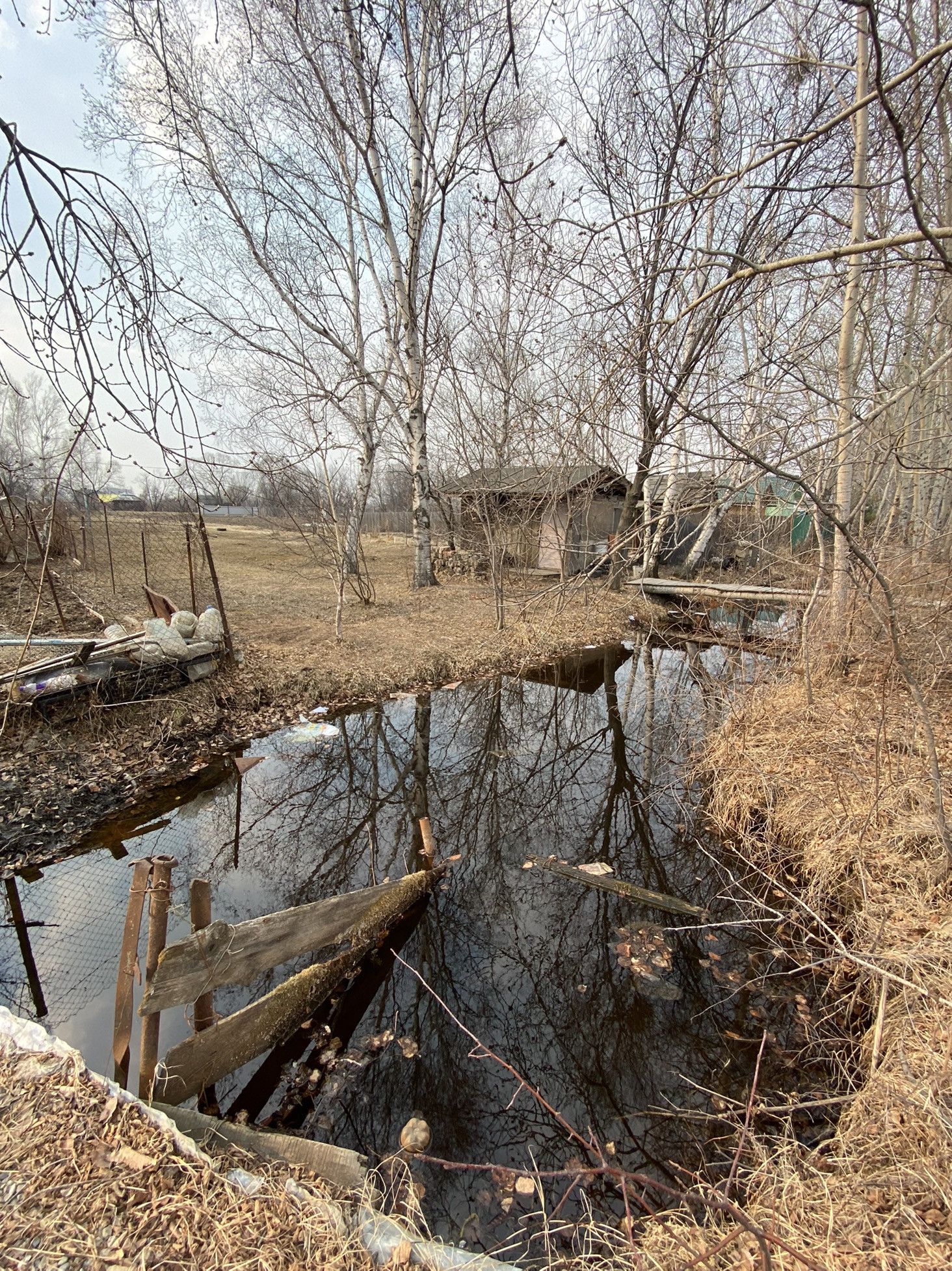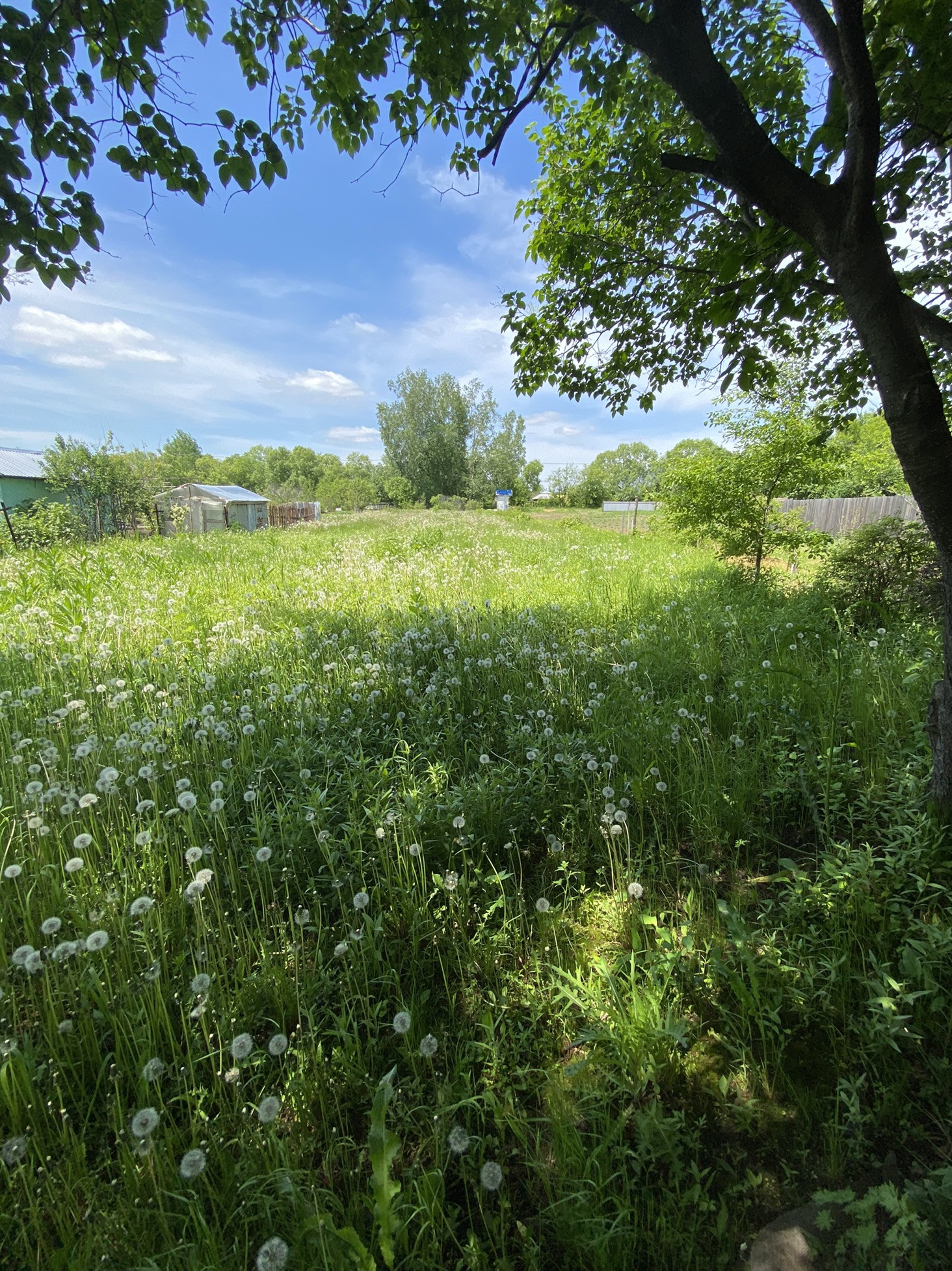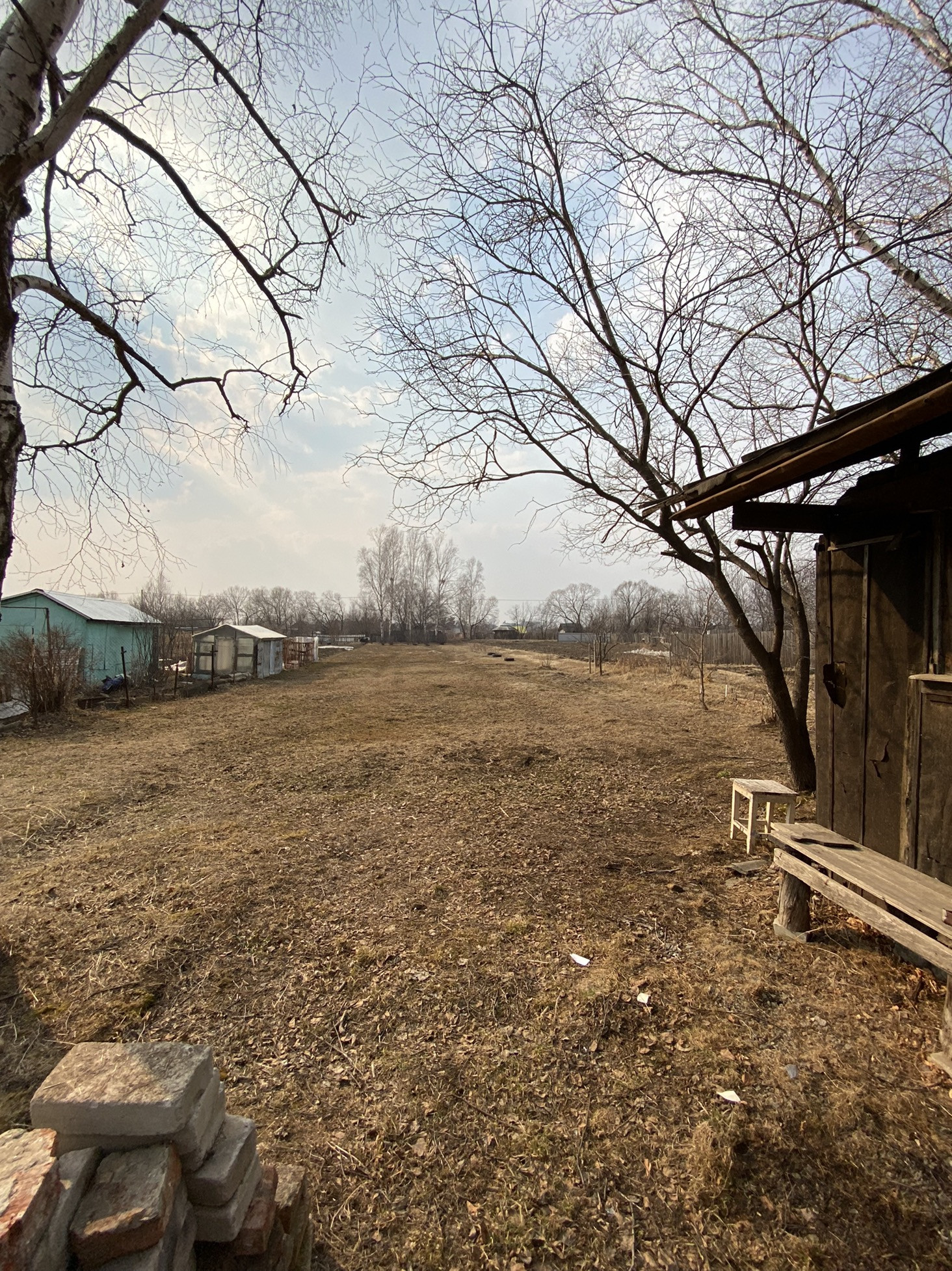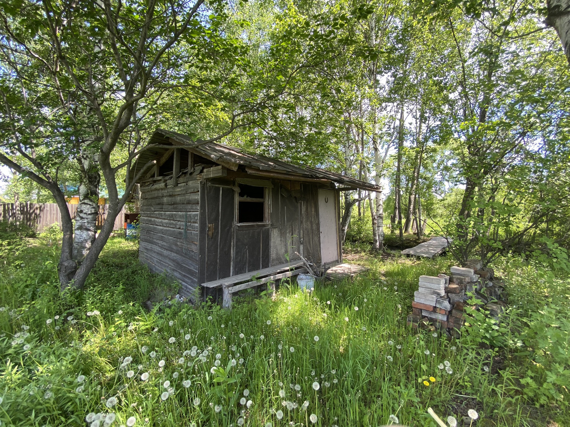Есть домик деревянный и насаждения - плодовые деревья. Канава для полива. Очень живописно. В своё время было очень много завезено на участок перегноя, удобрений.