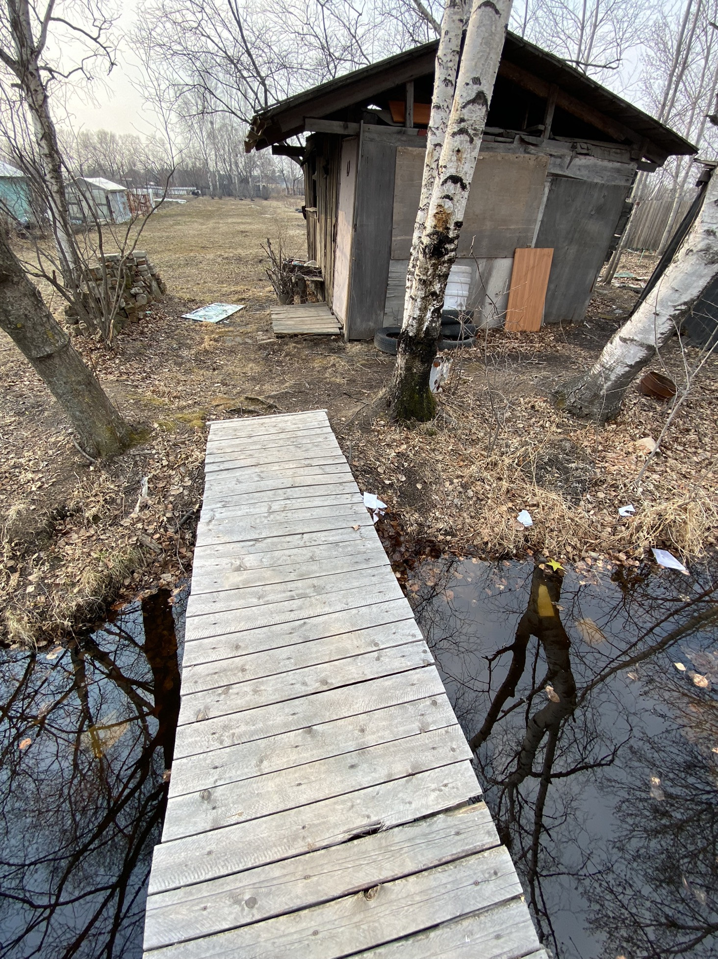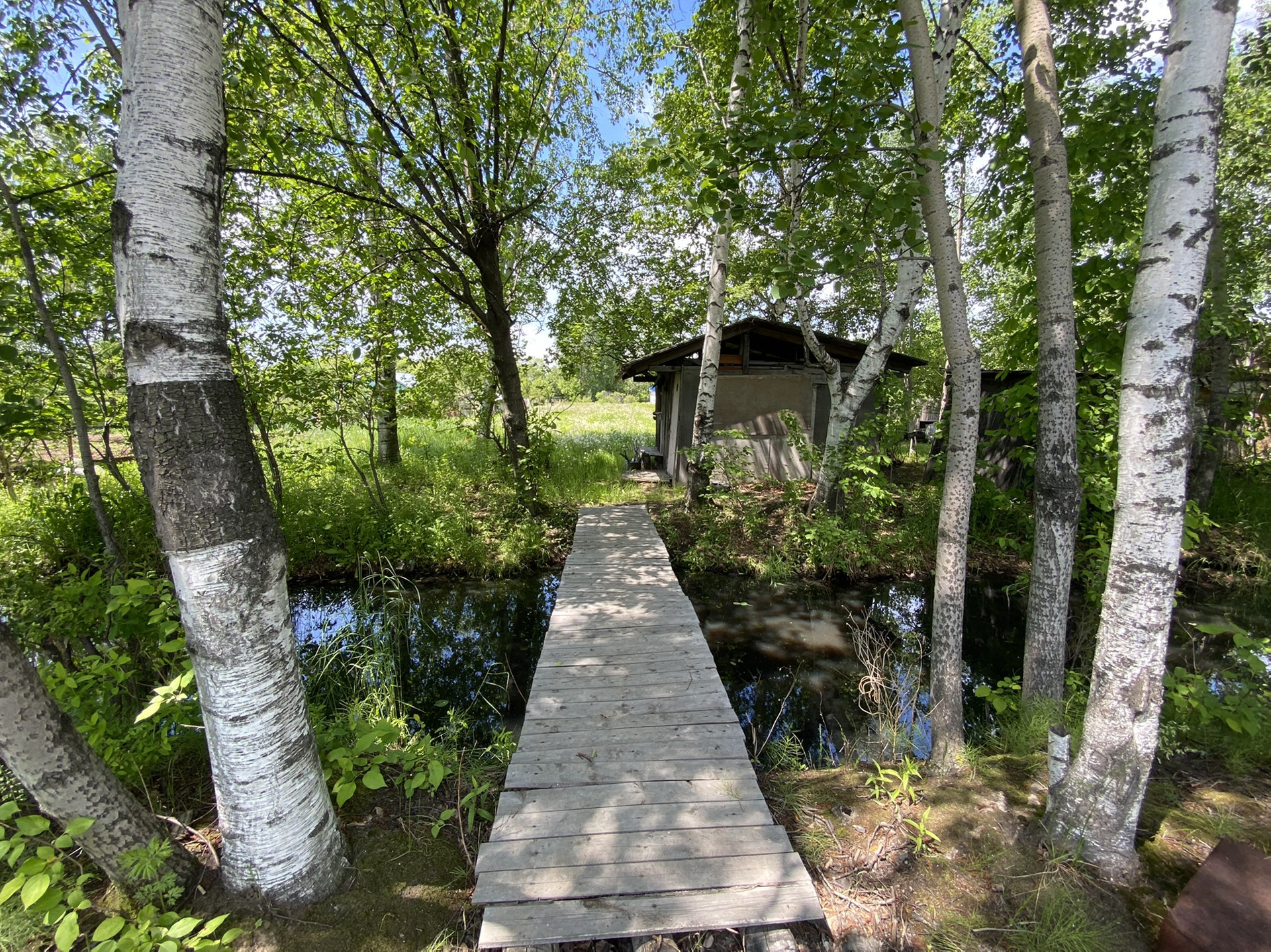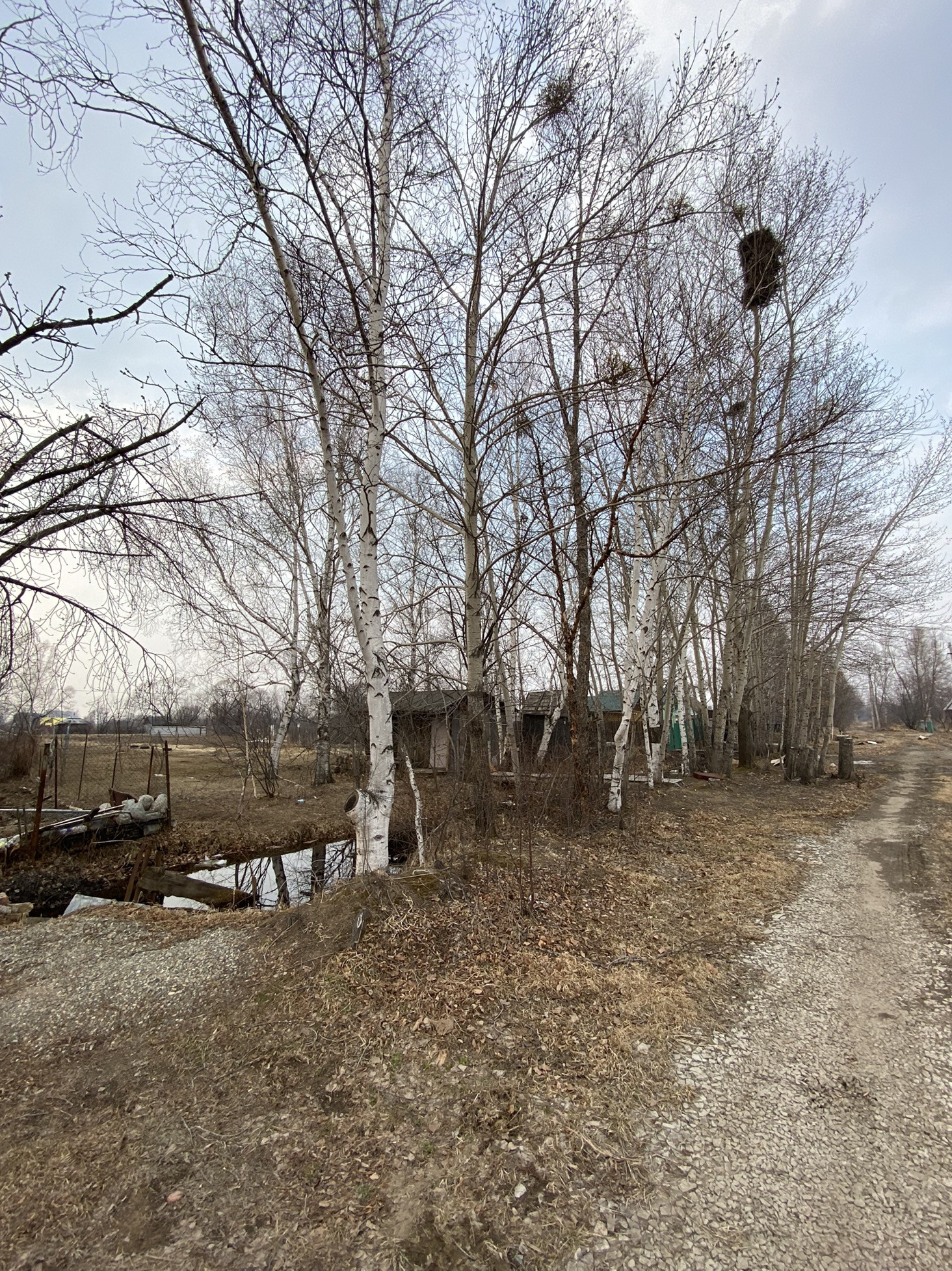 Есть домик деревянный и насаждения - плодовые деревья. Канава для полива. Очень живописно. В своё время было очень много завезено на участок перегноя, удобрений.