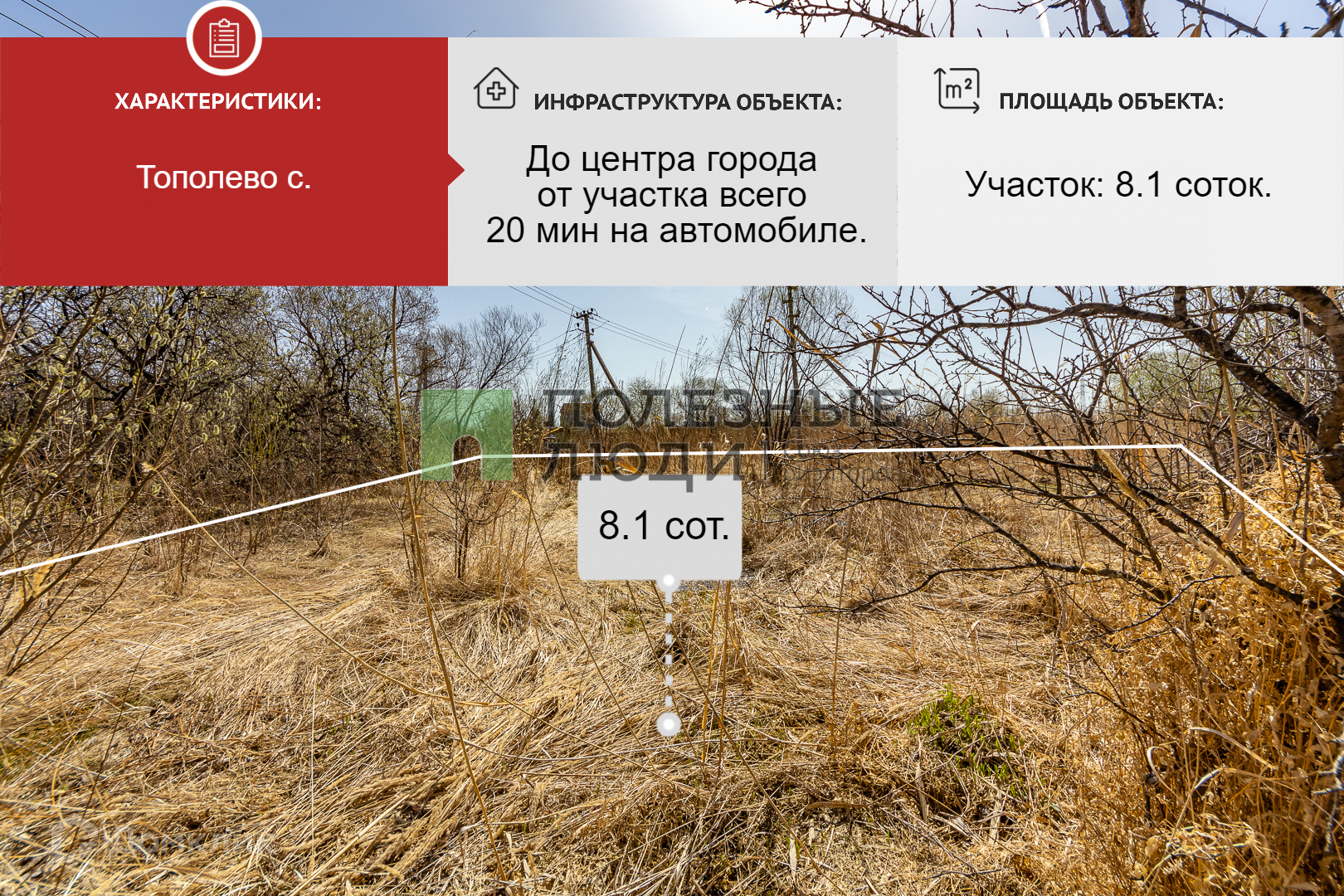 Продаётся земельный участок рядом с городом в экологически чистом районе. Участок расположен на окраине с. Тополево, подъездные пути хорошие (асфальт-грунтовка), участок расположен не далеко от трассы. Плюс то что участок находиться в глубине от трассы, что обеспечит тишину и оградит вас от суеты внешнего мира. Электричество к участку подведено. В округе идёт интенсивное застраивание домами и коттеджами. До центра города от участка всего 20 мин на автомобиле. Категория земель: Земли поселений (земли населенных пунктов), для ведения личного подсобного хозяйства. Участок отлично подойдет как под строительство дома.