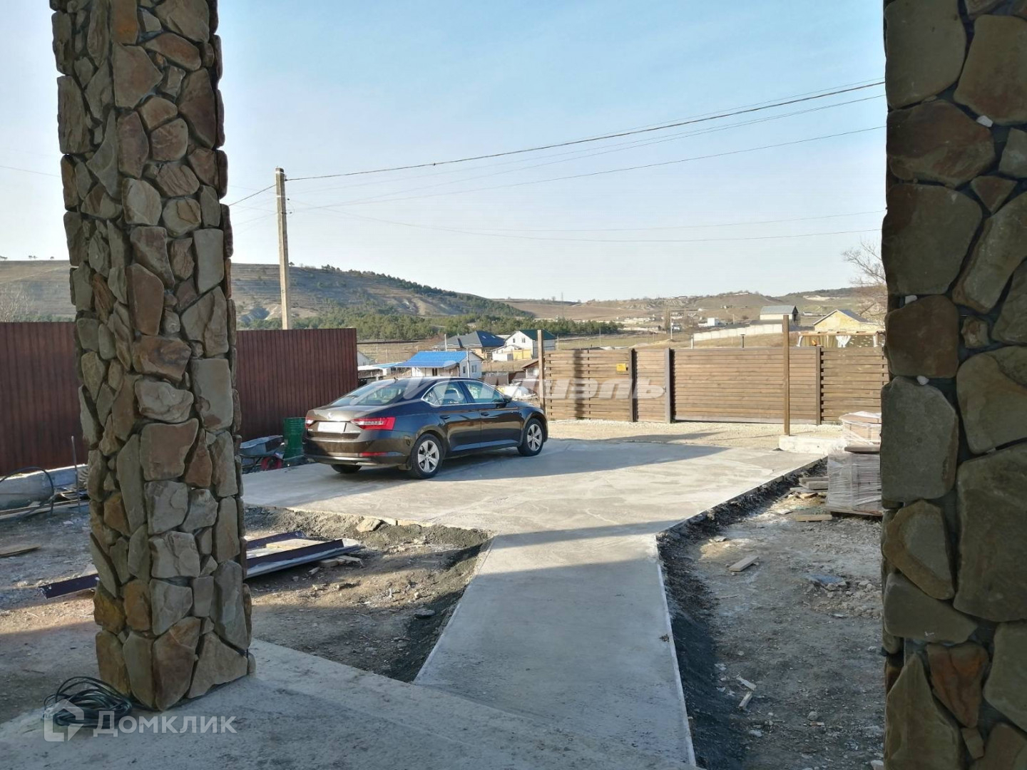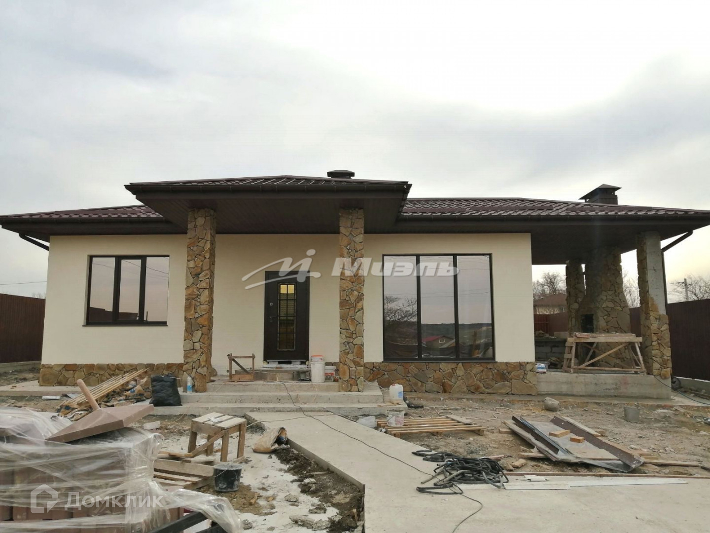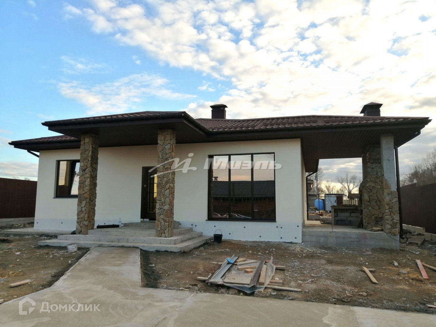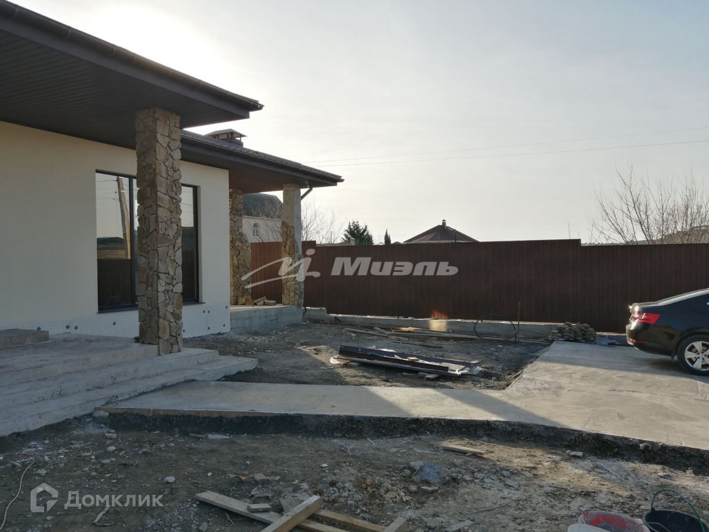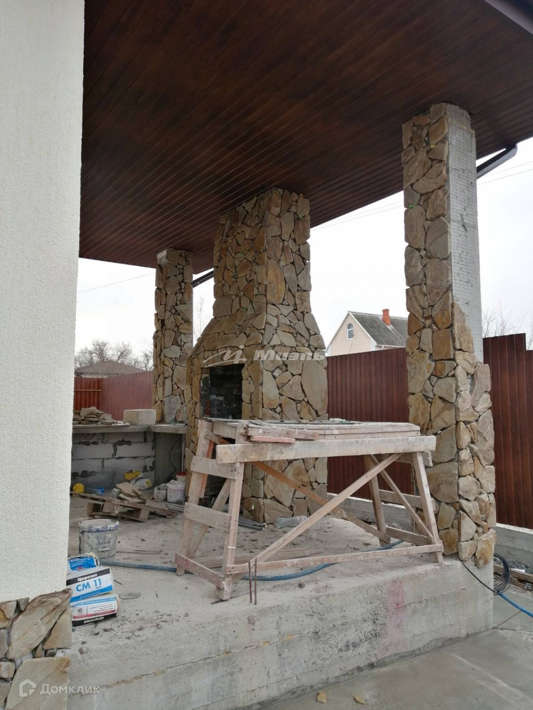 Отделка цоколя и колонн природным камнем. Вокруг дома выполнена отмостка. Во дворе бетонная армированная площадка на 2 авто.