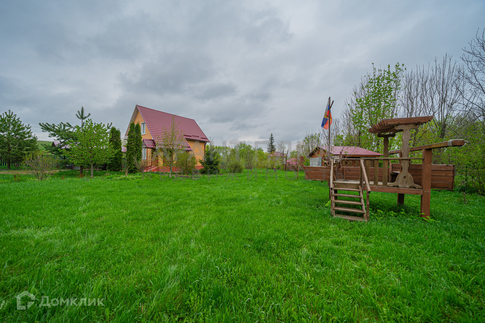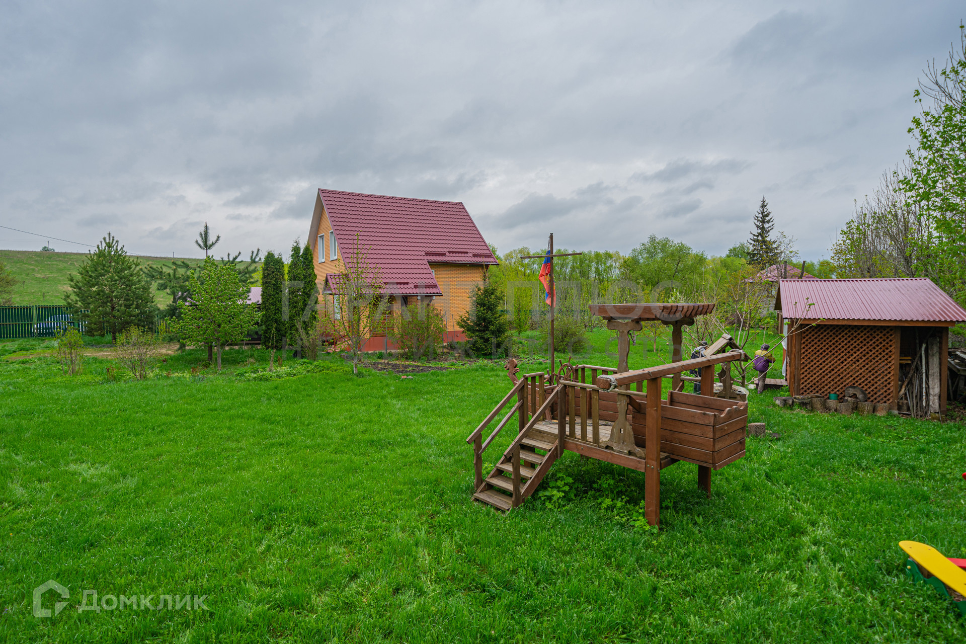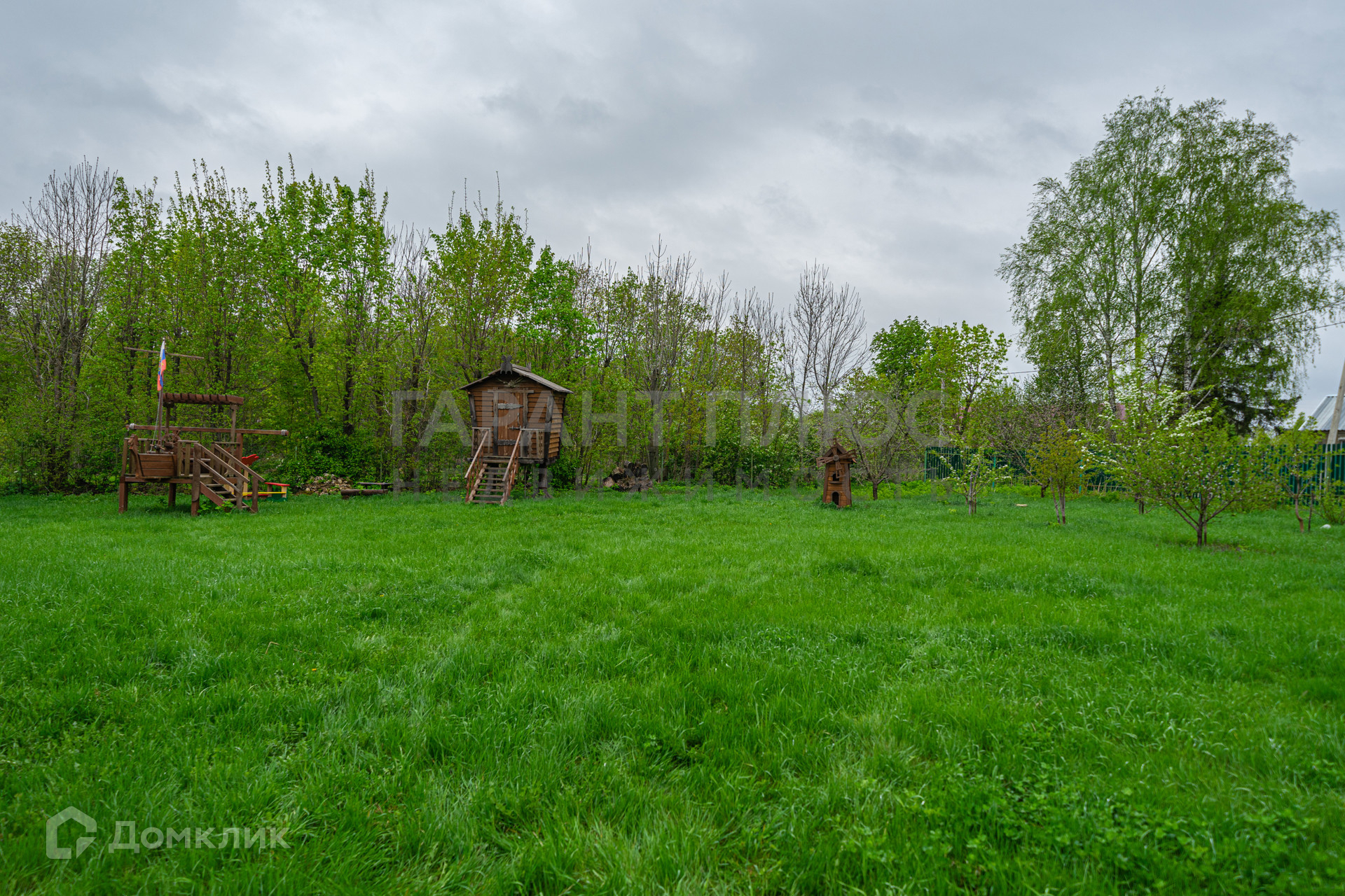 Благоустроенная территория с системой полива, беседкой, садовыми фигурами, качелями.