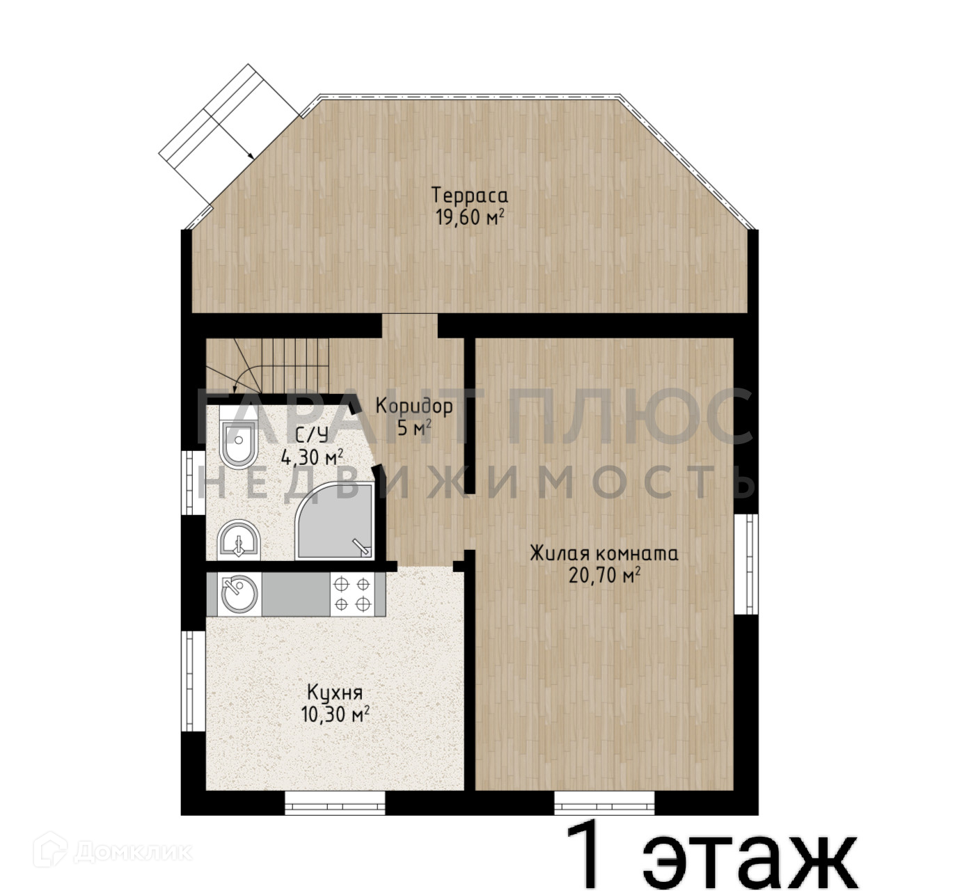 1 этаж: гостиная - 20,7кв.м; кухня - 10,3кв.м, санузел;