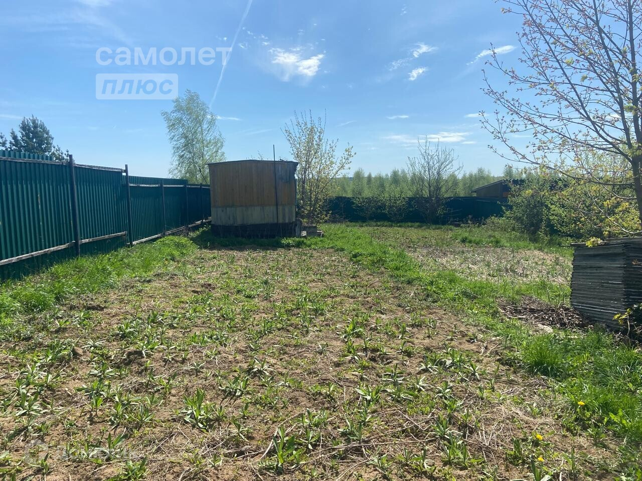 Участок огорожен по периметру профнастилом. Растут плодовые деревья.