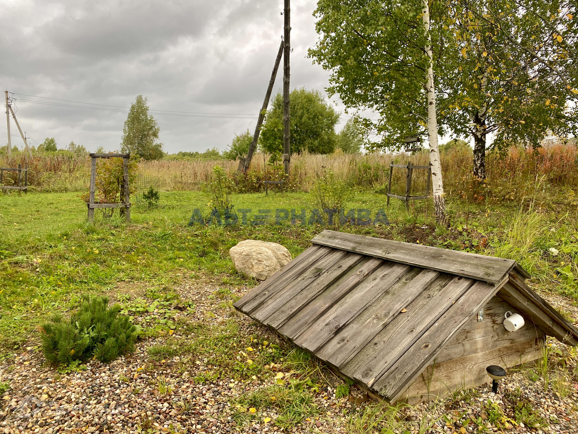 На участке электричество 15 кВт и старый бревенчатый дом с печью.
