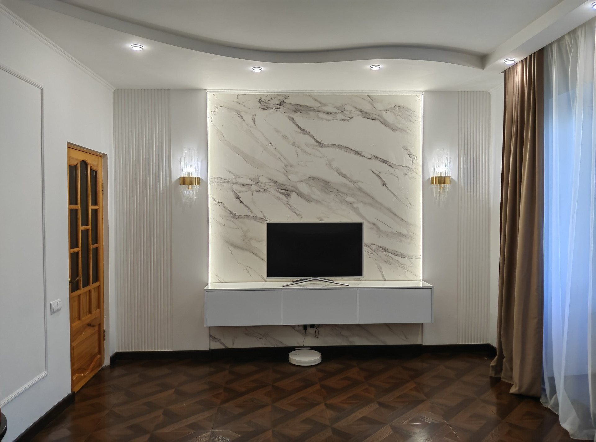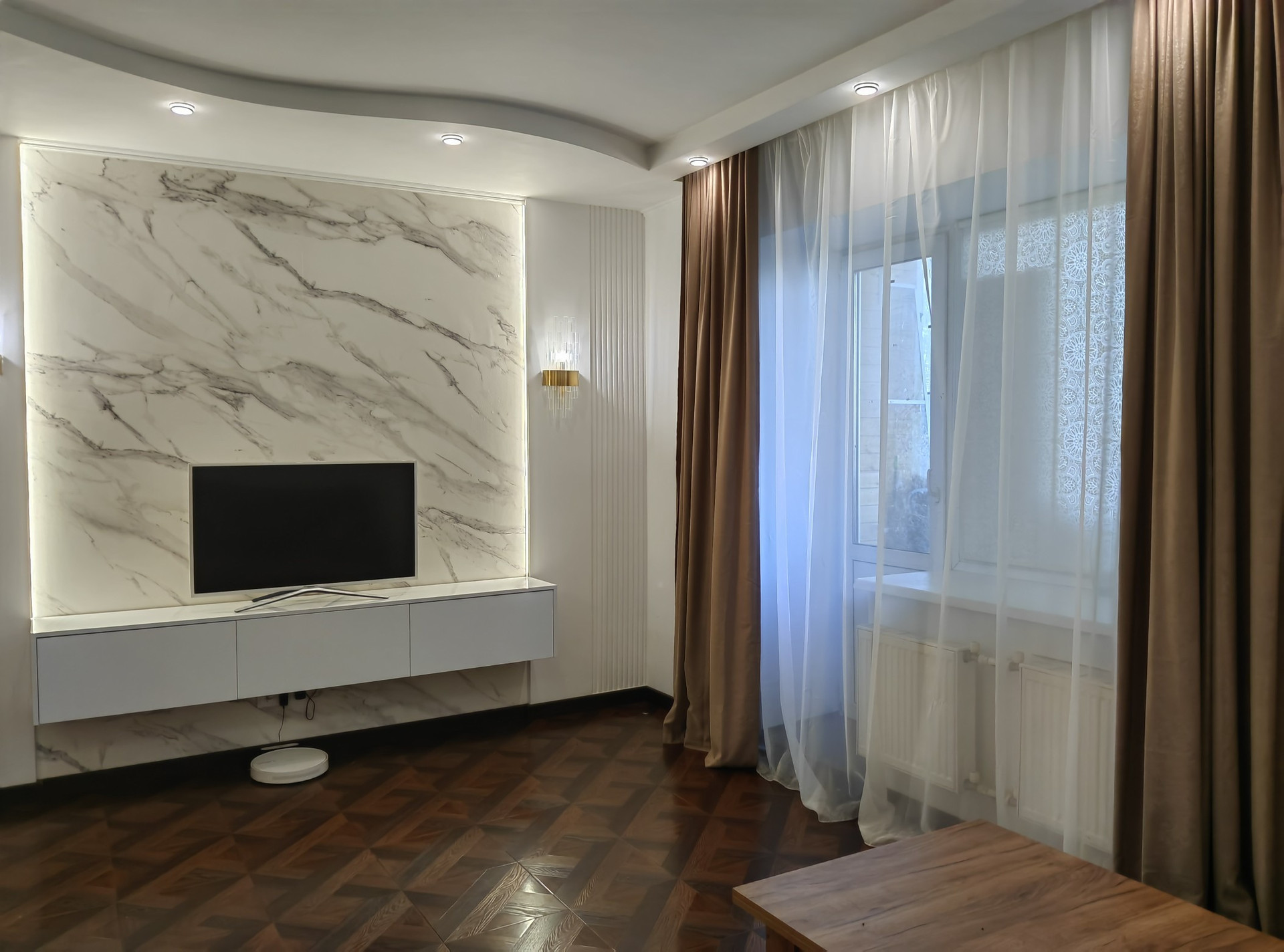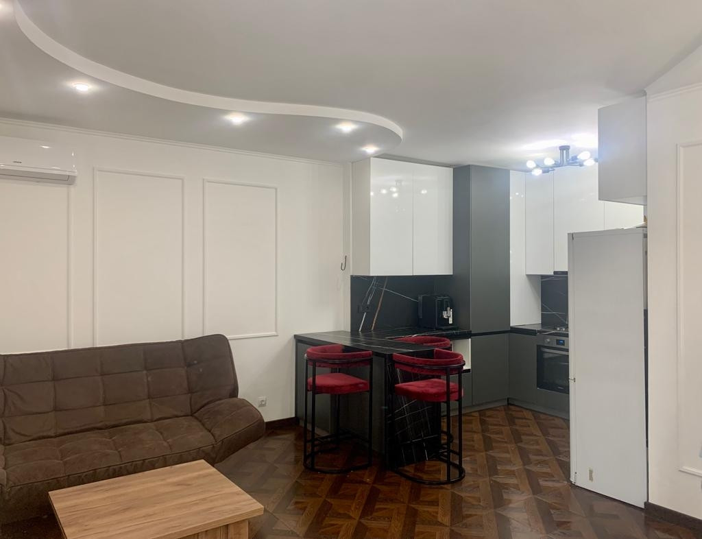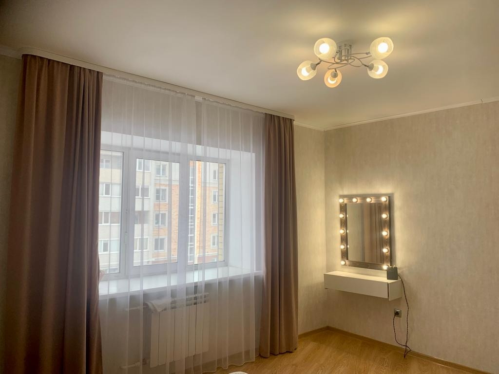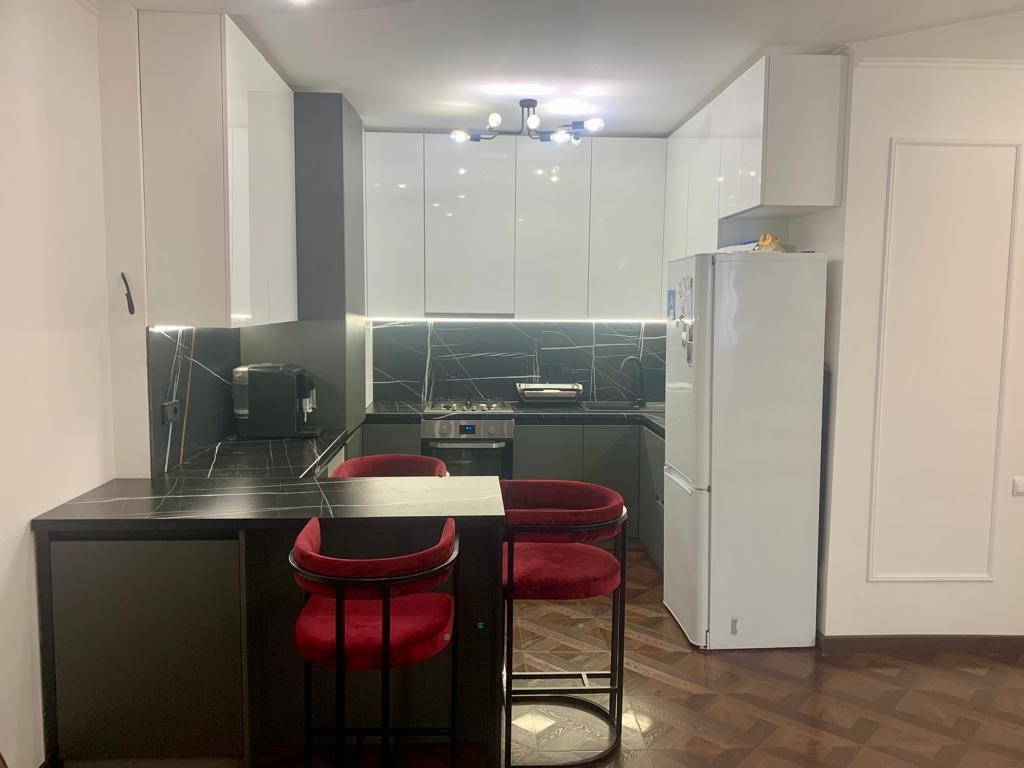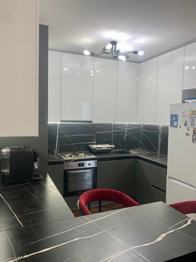 Новым собственникам остается функциональный кухонный гарнитур с барной зоной, встроенная техника (варочная поверхность, духовой шкаф, вытяжка, посудомоечная машинка).                                                                                                                                             В гостиной остается мягкий диван, красивые бра и тумба под тв.