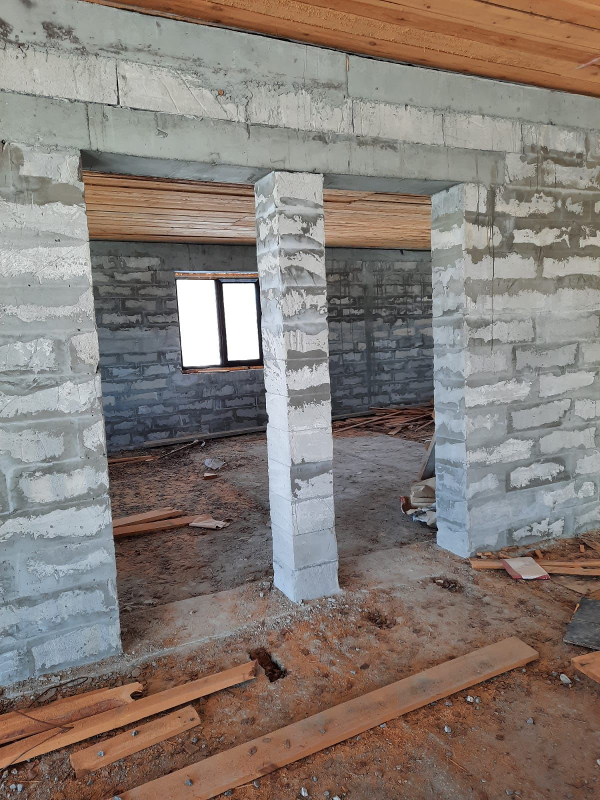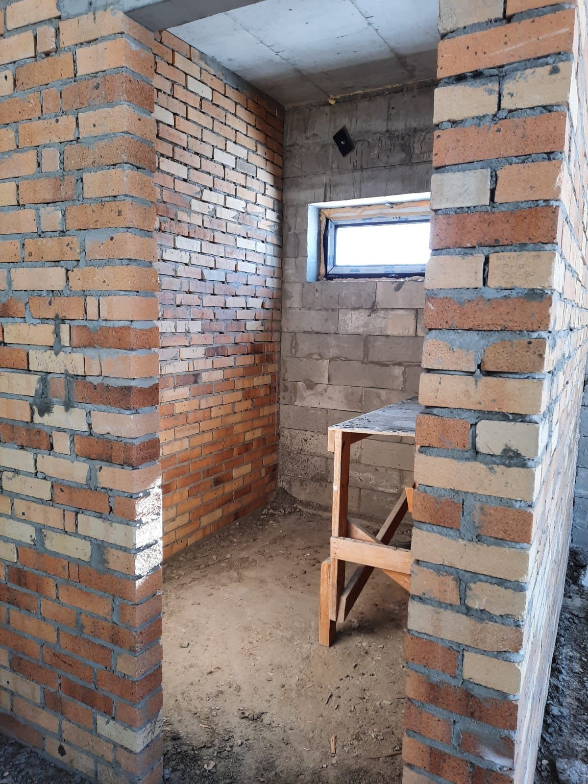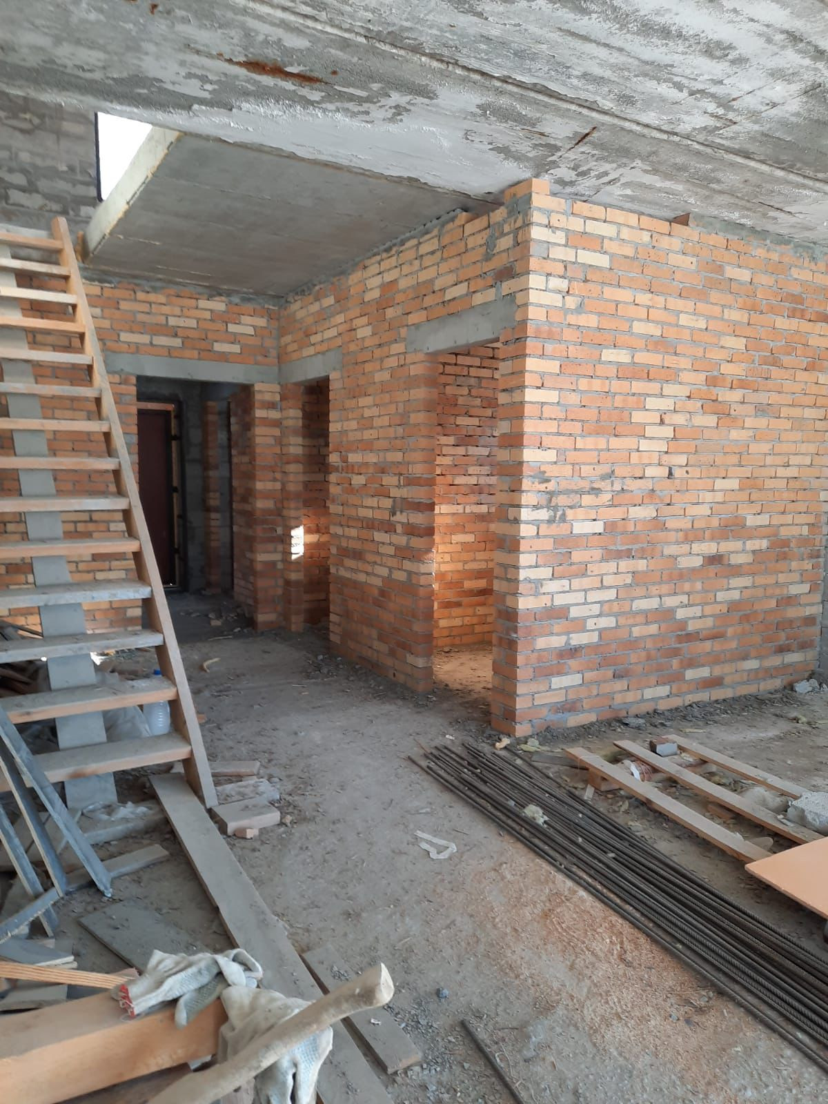 Дом строился по собственному проекту, перекрытия: первый этаж - монолитная плита, второй этаж - железобетонные плиты перекрытия, крыша металлочерепица, установлены пластиковые окна, двери , гаражные ворота Alutech. На первом этаже установлены кирпичные перегородки.