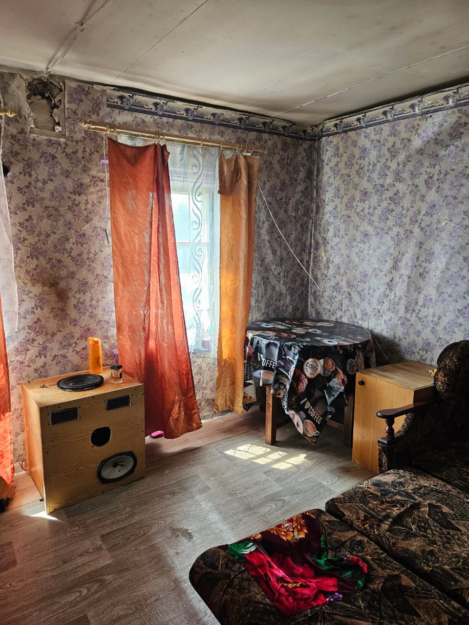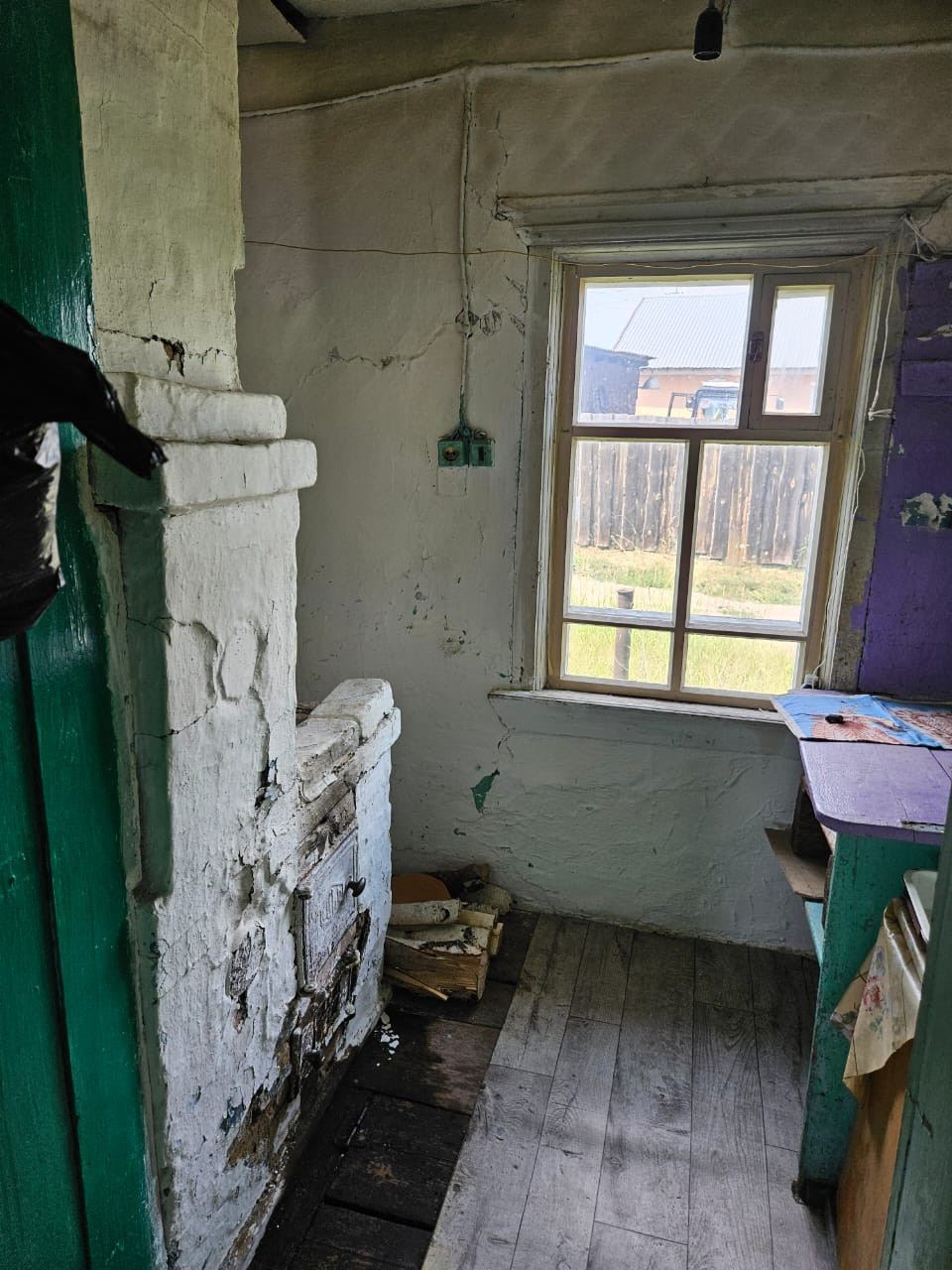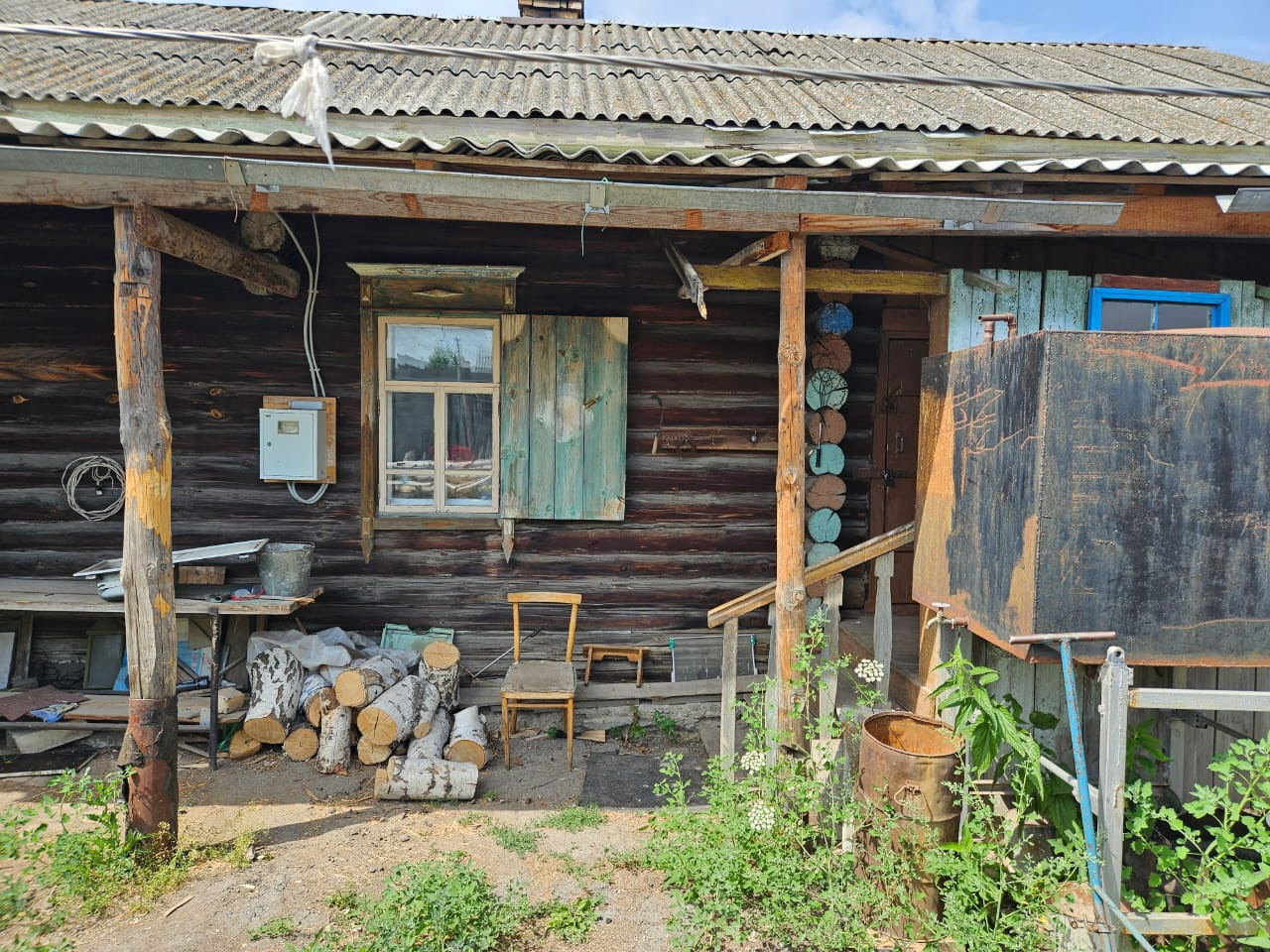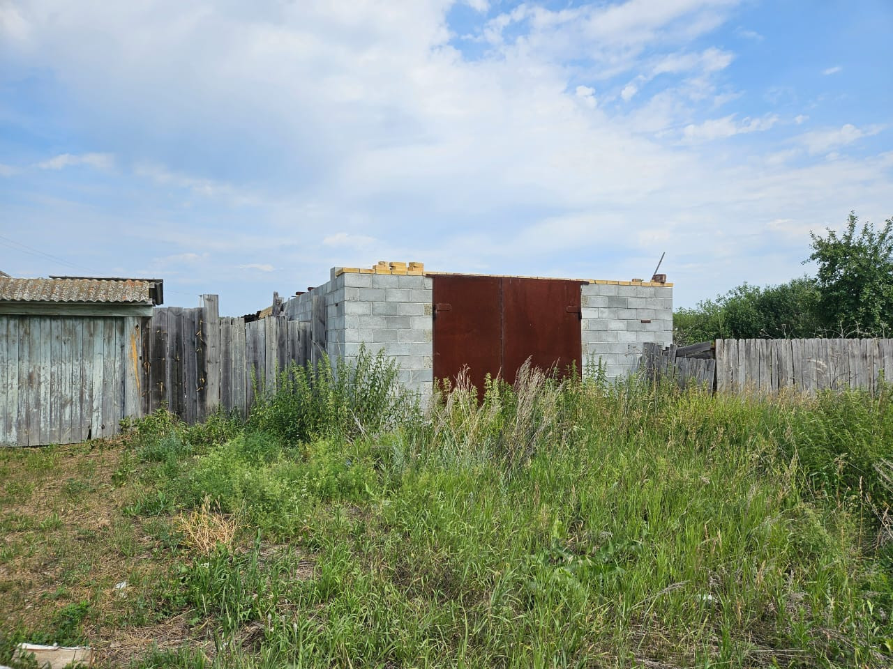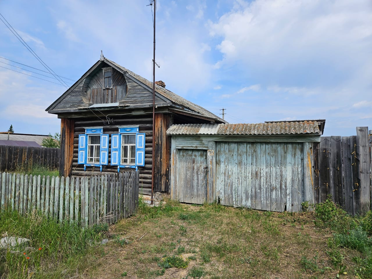 Дом из бруса. Газ проходит рядом. В доме одна комната и кухня. Крыша из шифера. Окна деревянные. В саду плодовые деревья. Гараж 6*16, без крыши.
