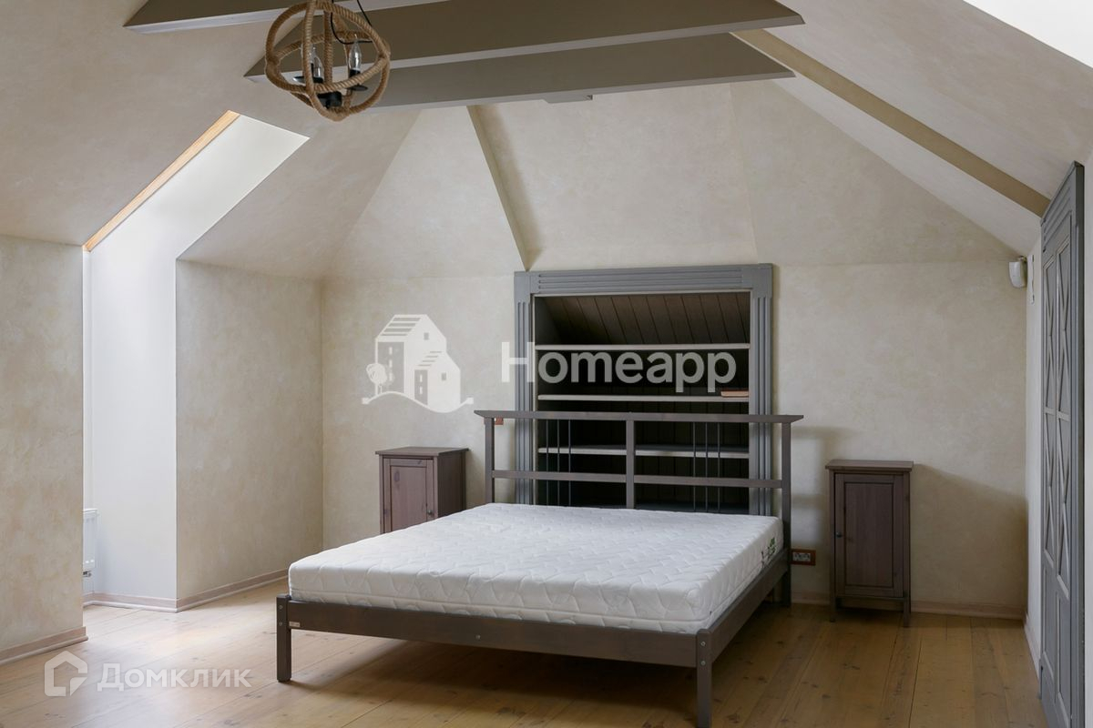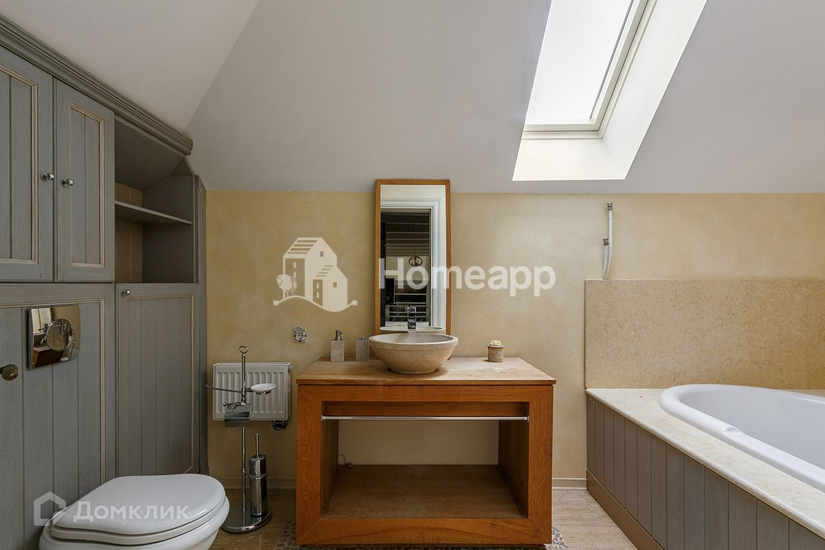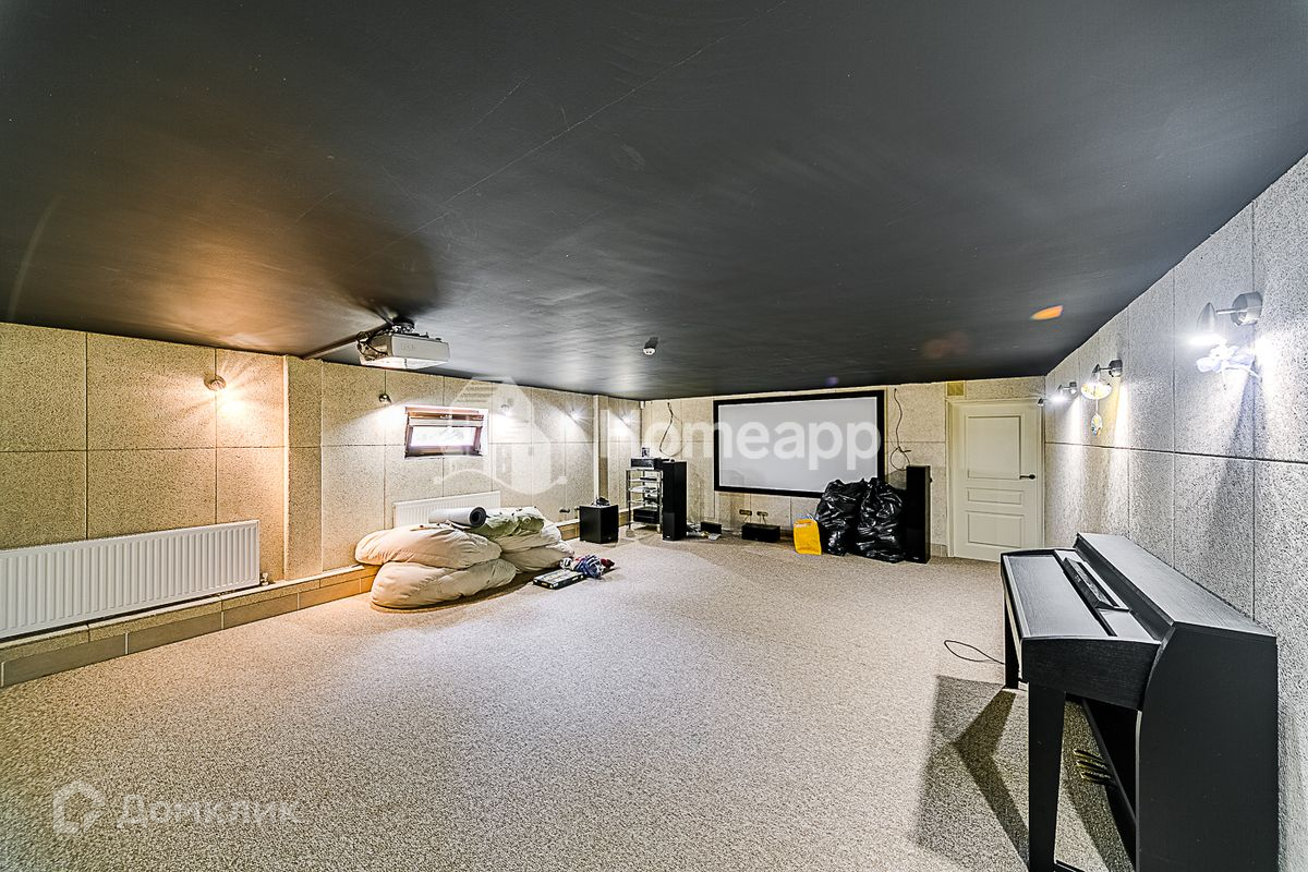 Основной дом: первый этаж - кухня, столовая, гостиная, 2 кабинета, гардеробная, санузул; второй этаж - холл, мастер-спальня с отдельной ванной и гардеробом, 3 спальни и 2 санузла; мансарда - спальня с собственным санузлом и ванной; цоколь - кинозал-игровая, холодильная комната, прачечная и кладовые. Имеются два входа.