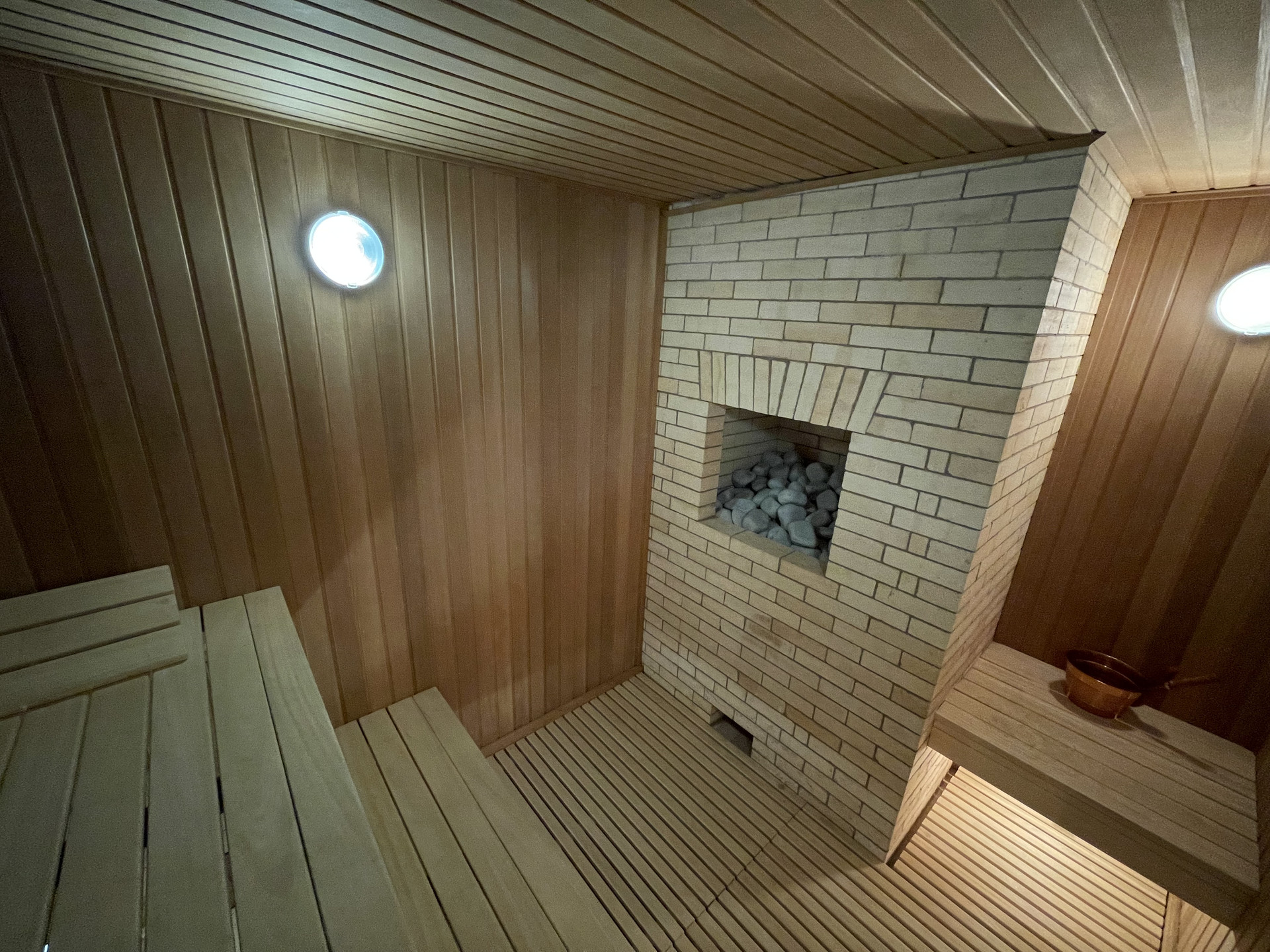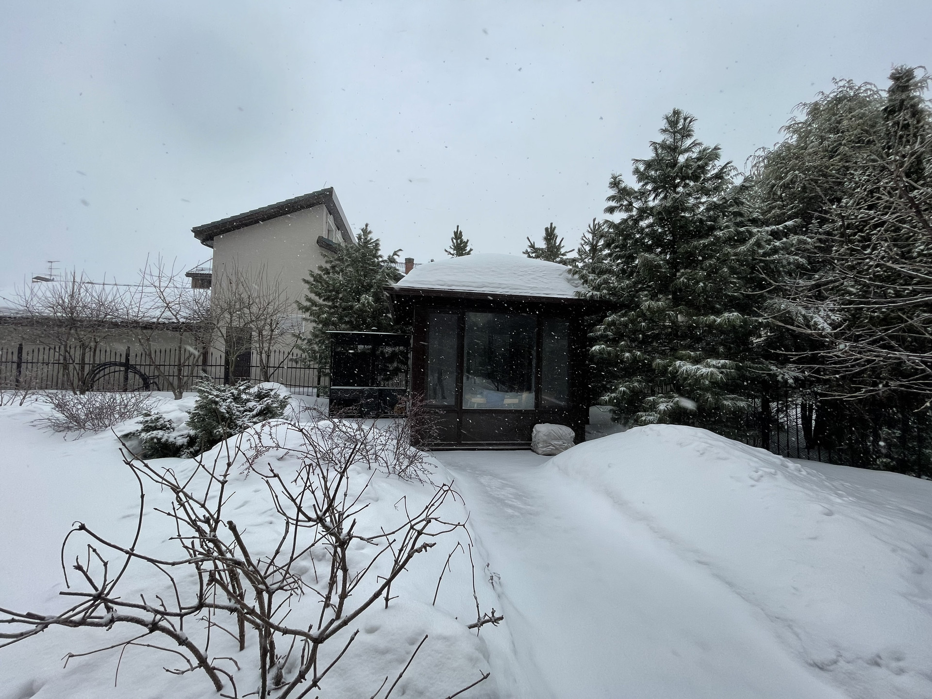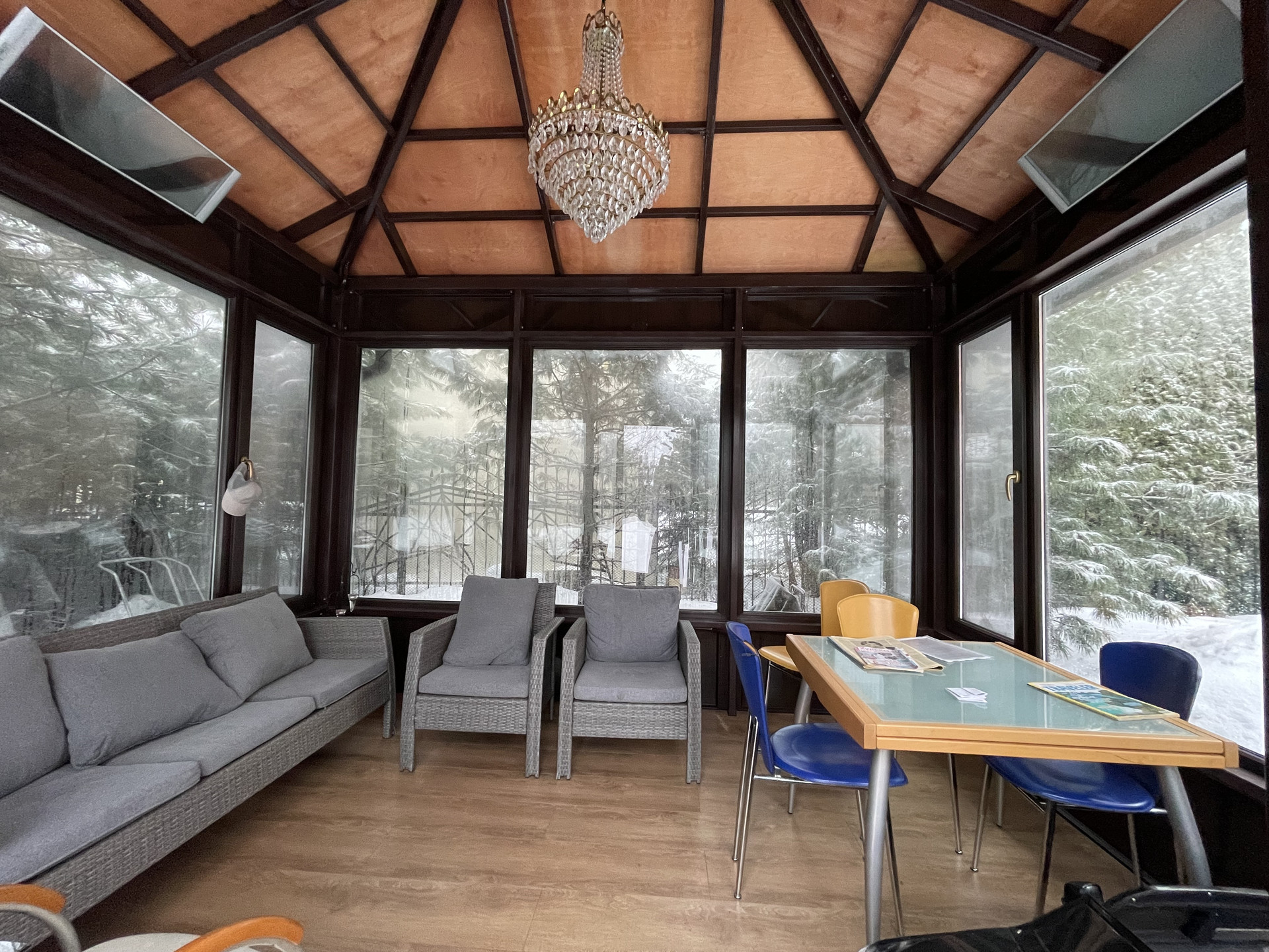 Беседка отапливается за счет инфракрасных обогревателей, благодаря чему в ней удобно в любое время года.