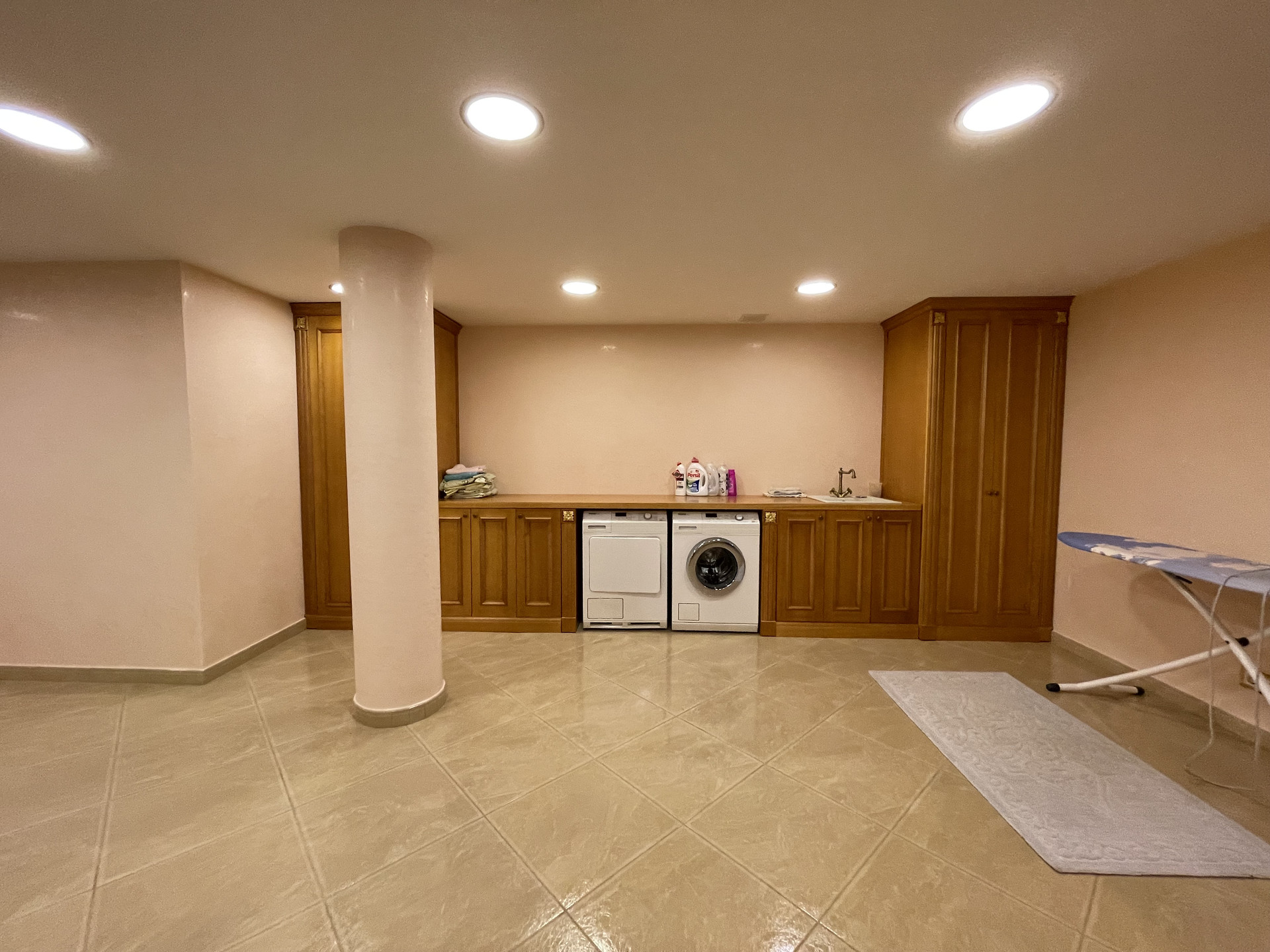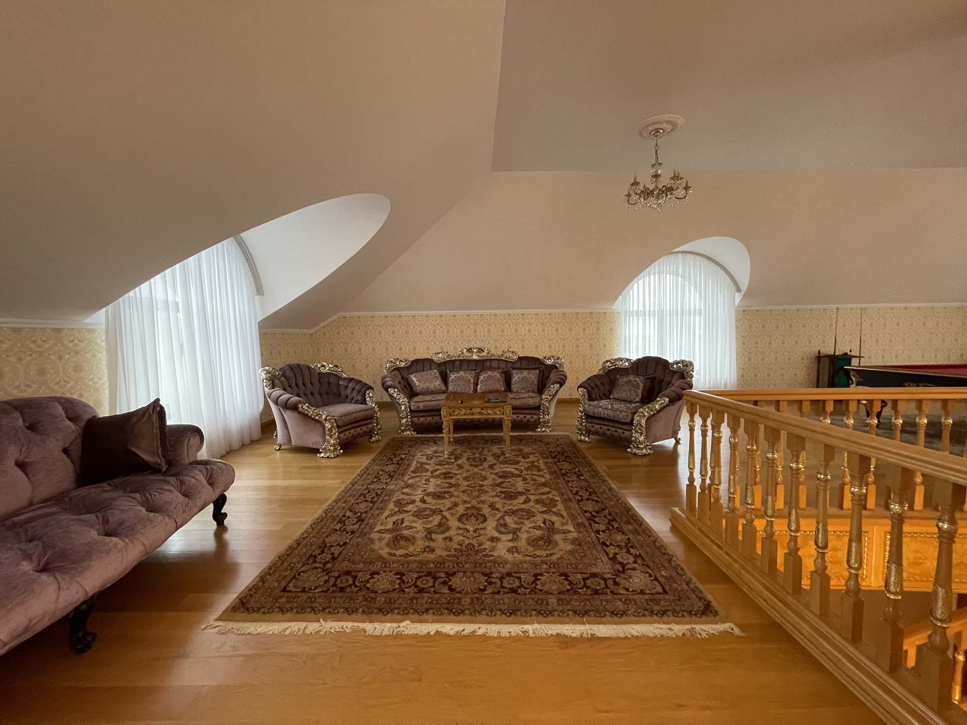 Пространство дома гармоничное, в нем учтены потребности домочадцев: объединиться в просторных гостиной и кухне, зоне отдыха с бильярдом и большим телевизором третьего этажа, или сауны цокольного этажа, либо обособиться в отдельных спальнях с собственными санузлами, одна из которых на первом этаже, две на втором и одна на третьем, кабинете, уголках для отдыха и бесед.