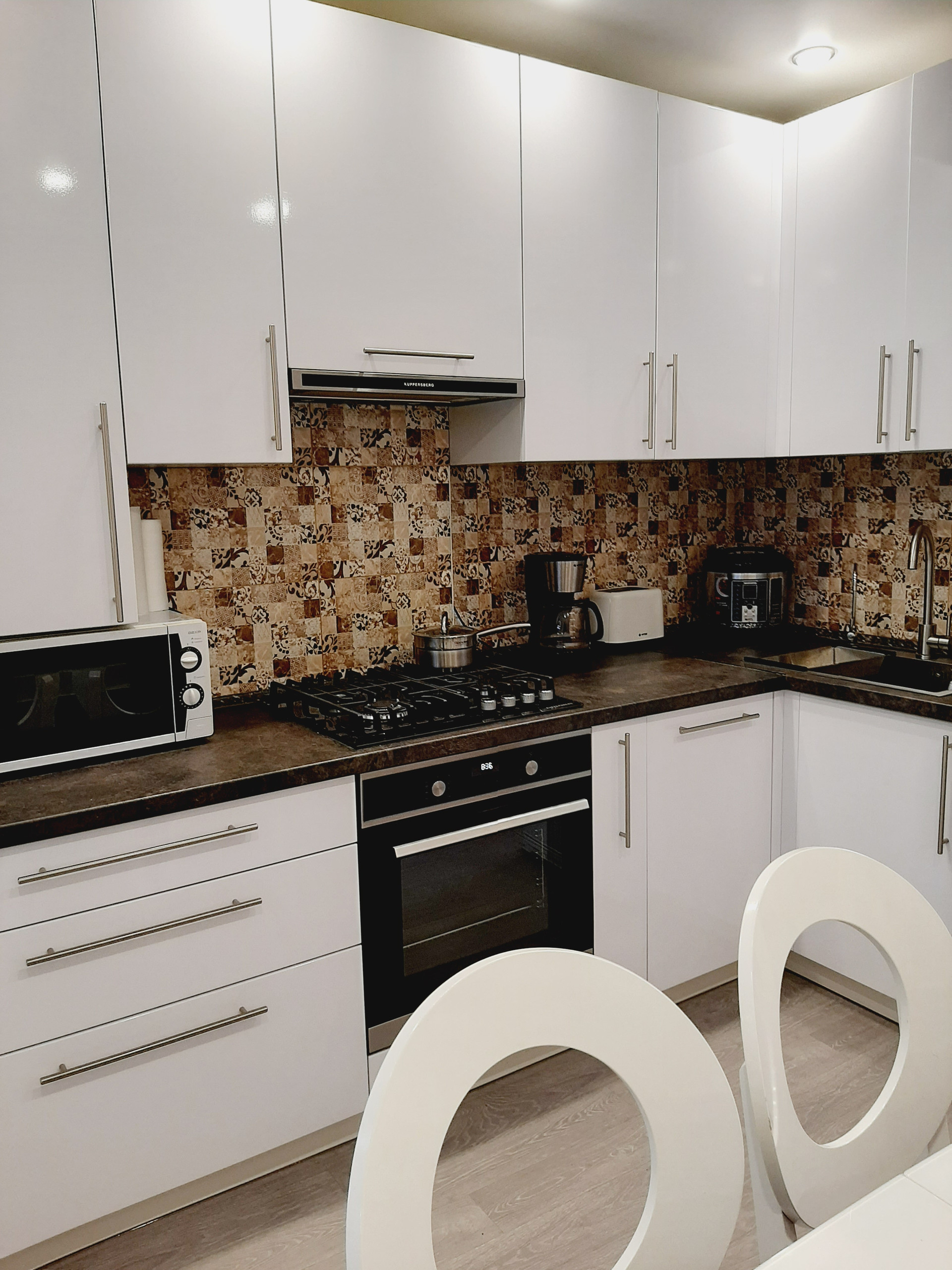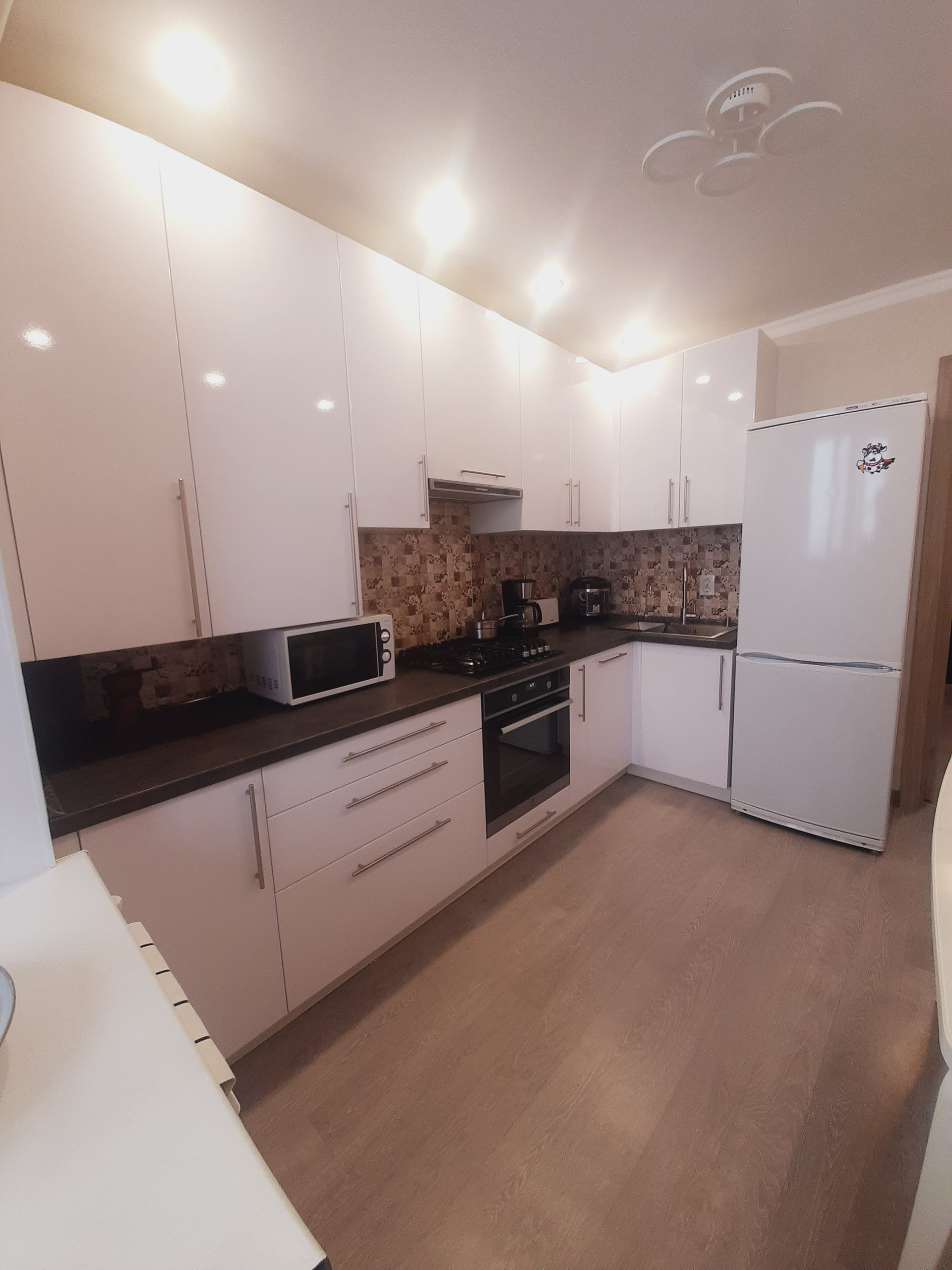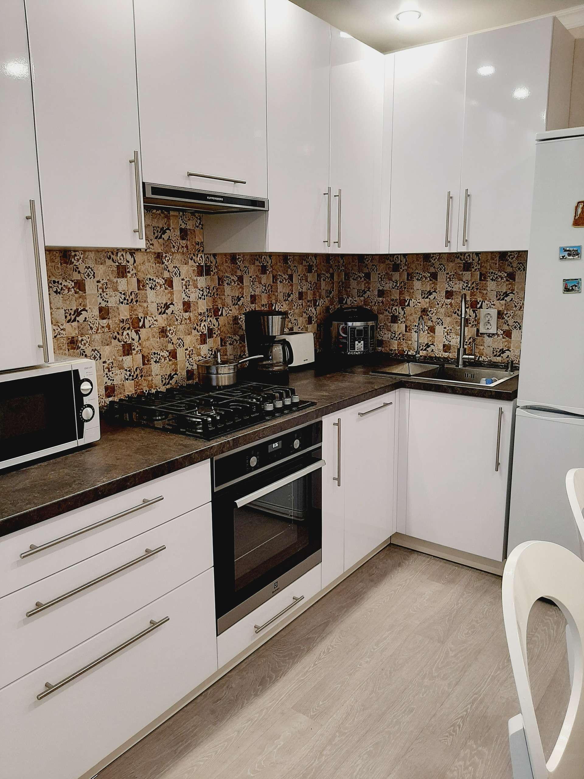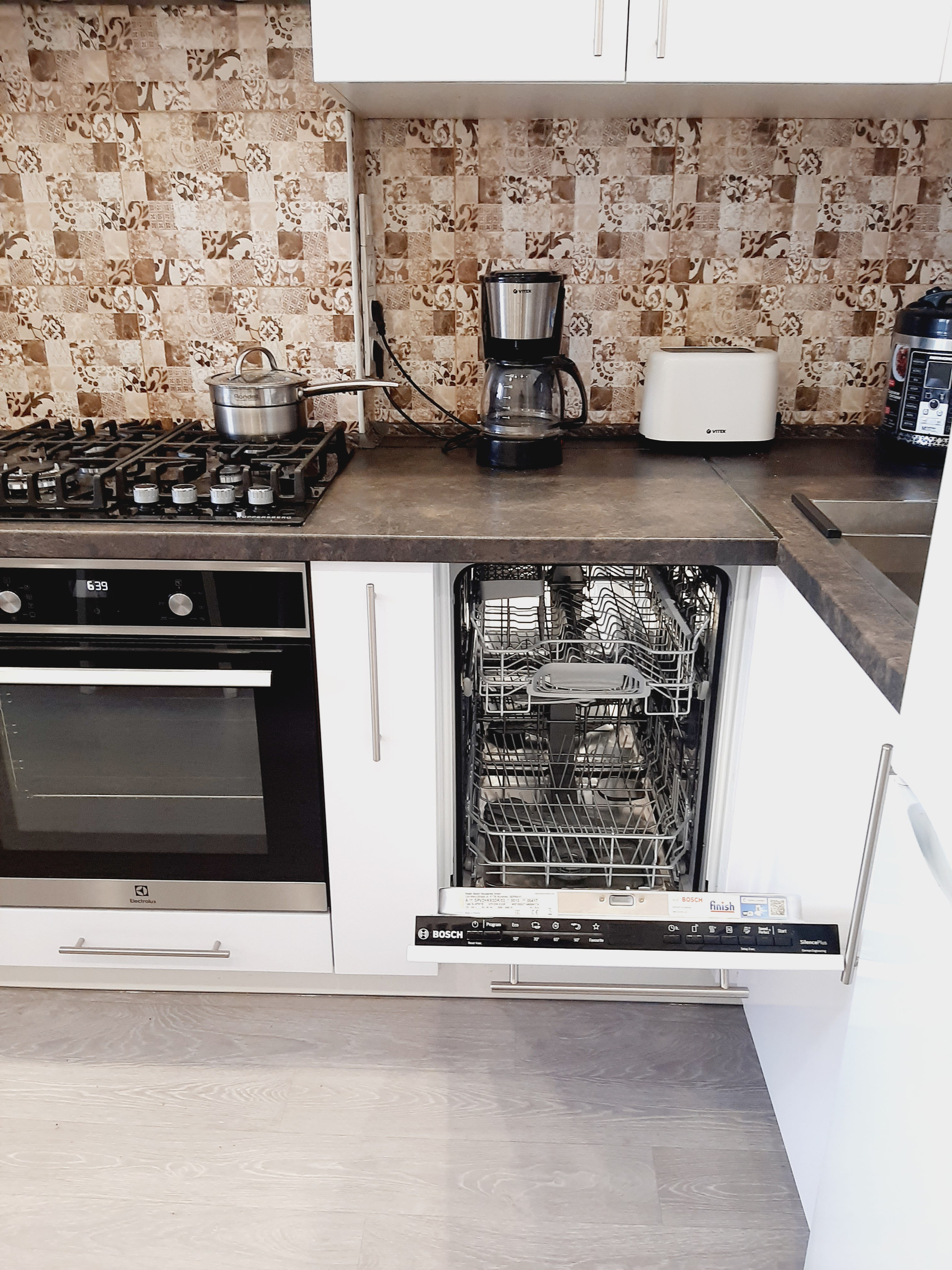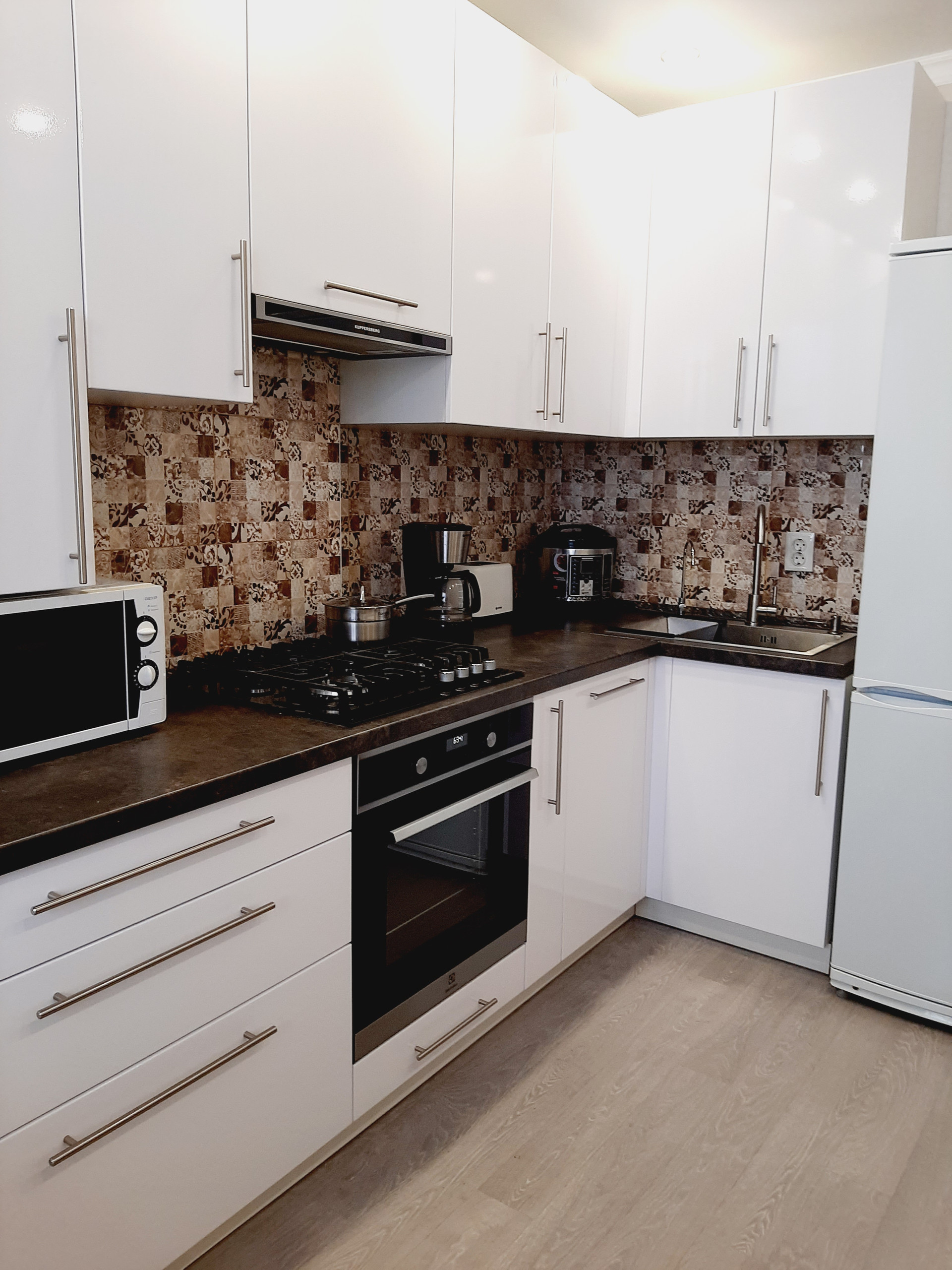 Кухня, полностью оснащена новой бытовой техникой: холодильник, газовая варочная панель и электрический духовой шкаф, компактная посудомойка, микроволновка, имеется вытяжка и 3-х ступенчатый фильтр очистки воды. Прекрасный кухонный гарнитур с достаточным количеством мест хранения надежного производителя. Вся бытовая техника – от известных производителей, комплекты гарантийных документов – в наличии.