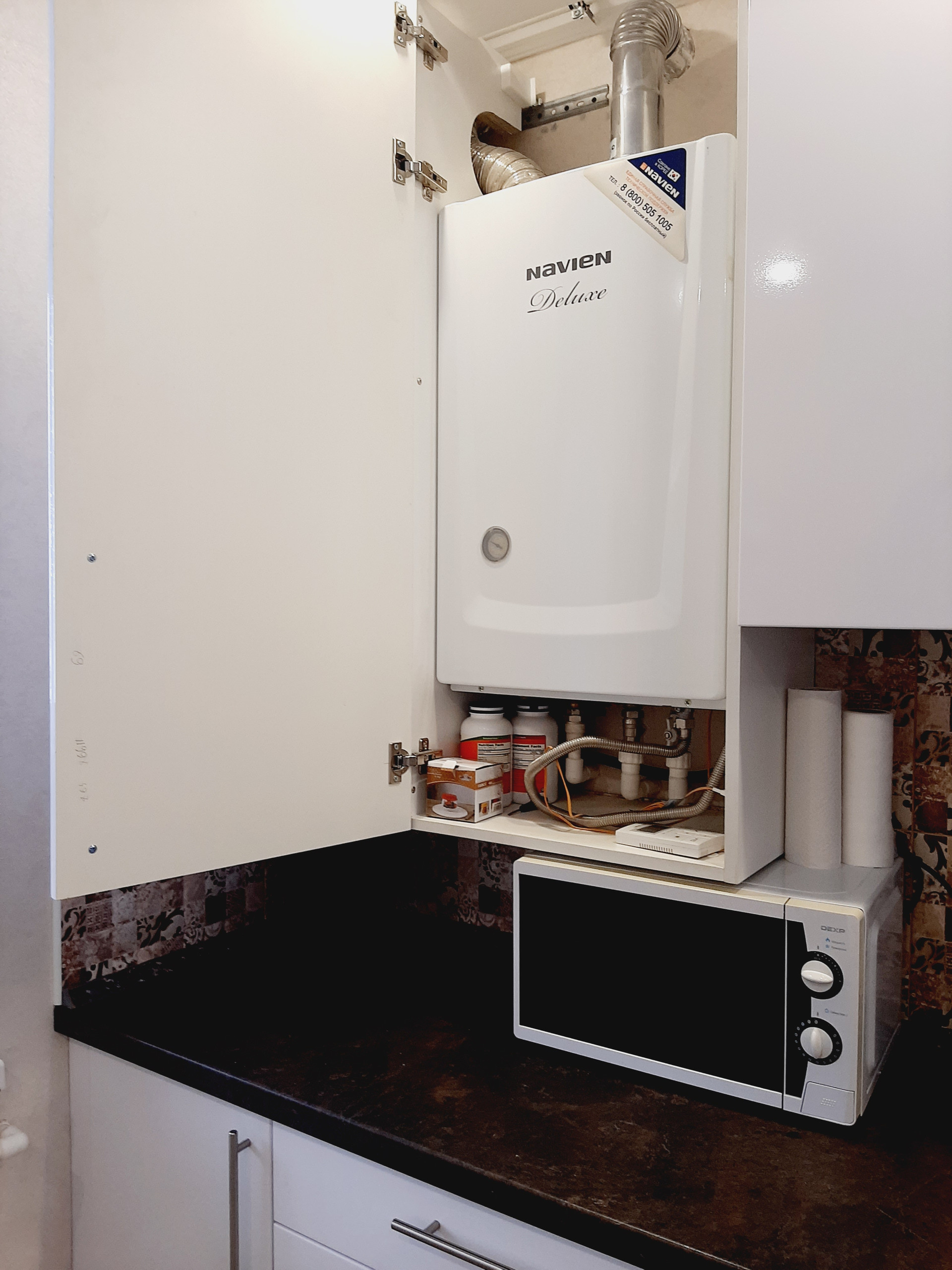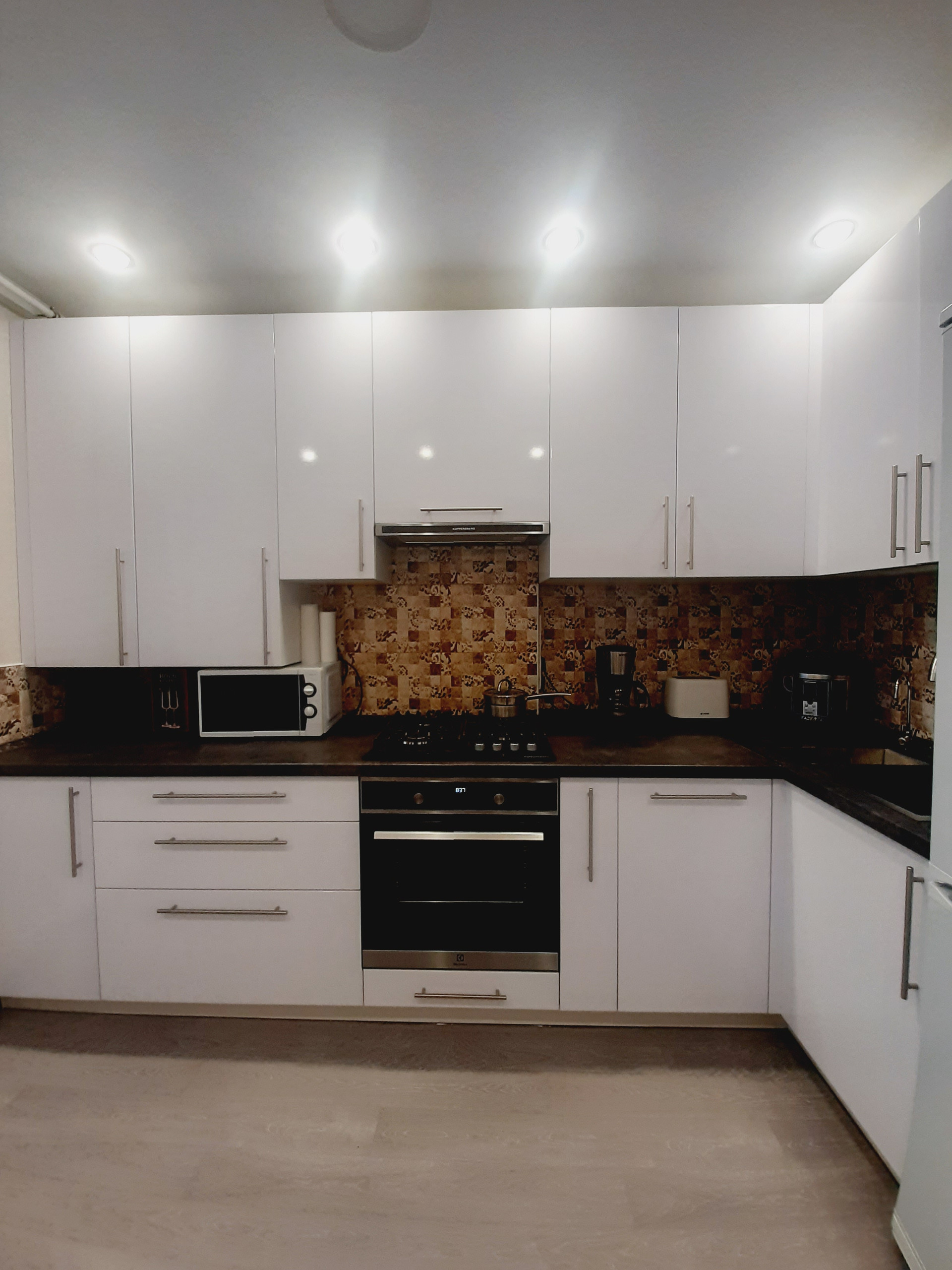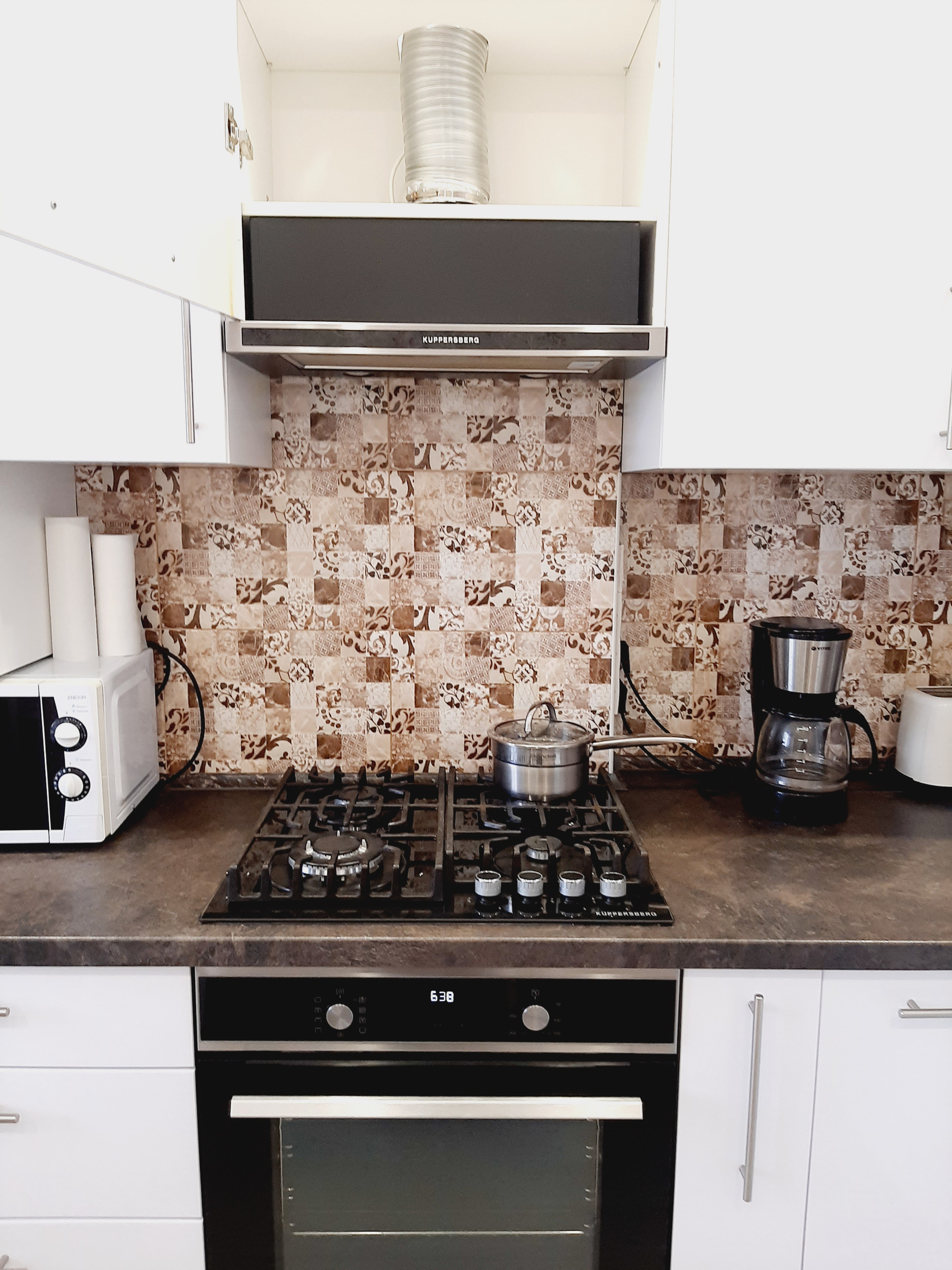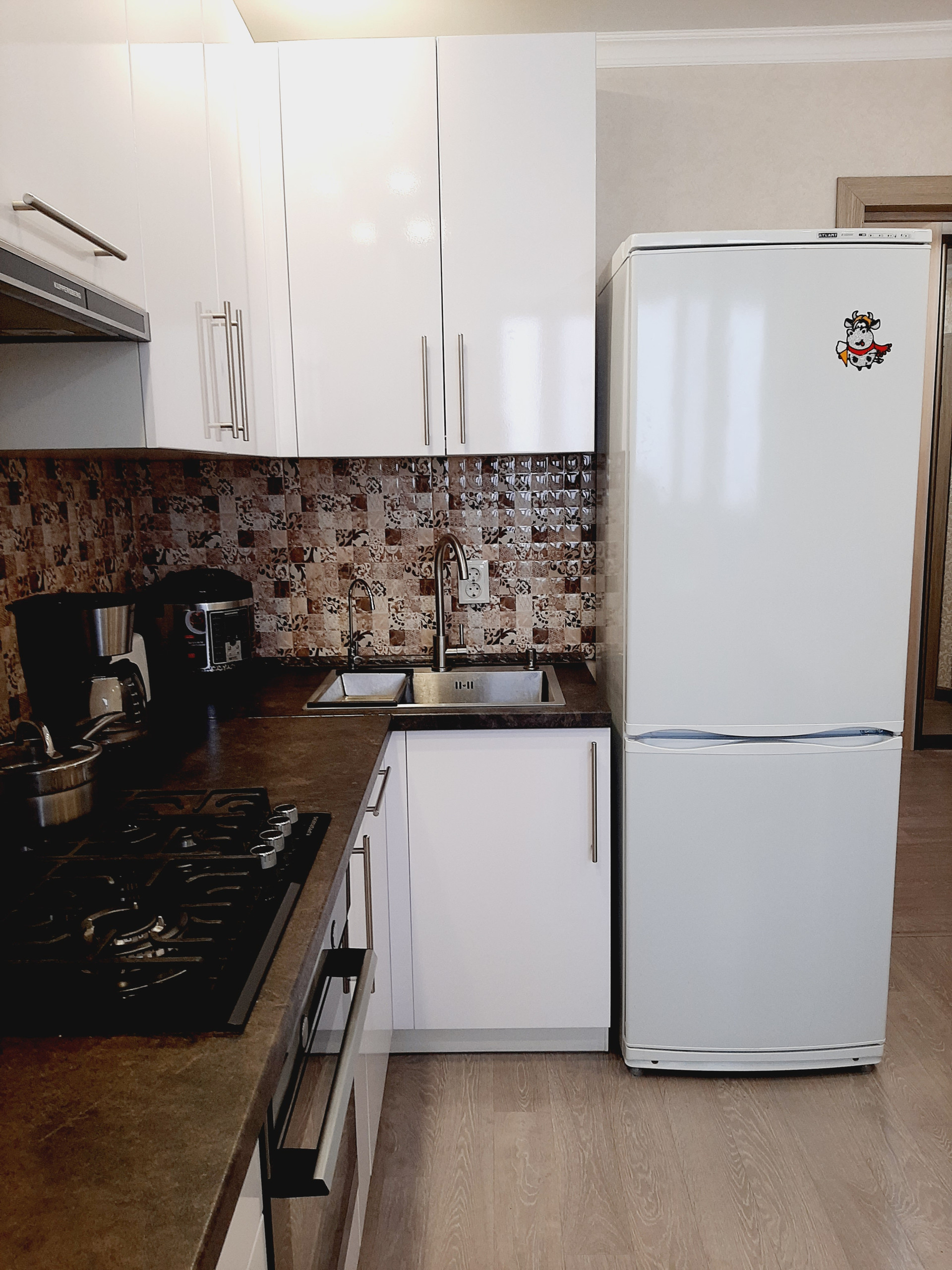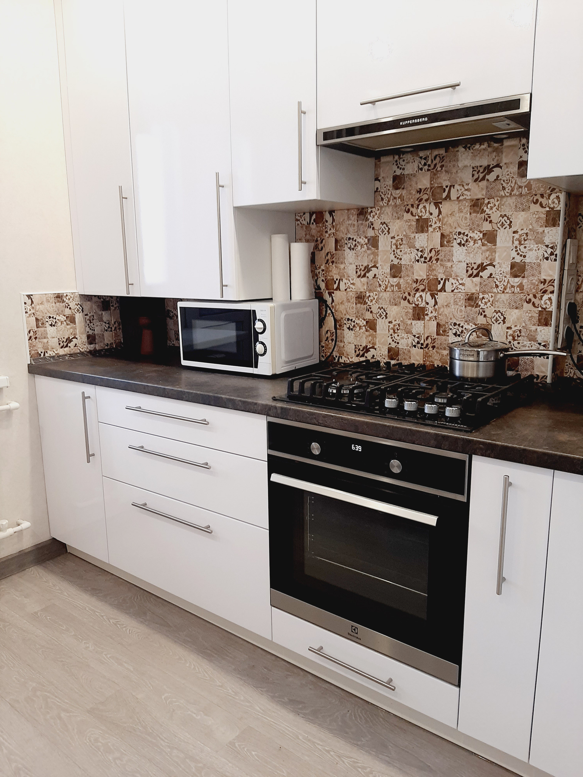 Кухня, полностью оснащена новой бытовой техникой: холодильник, газовая варочная панель и электрический духовой шкаф, компактная посудомойка, микроволновка, имеется вытяжка и 3-х ступенчатый фильтр очистки воды. Прекрасный кухонный гарнитур с достаточным количеством мест хранения надежного производителя. Вся бытовая техника – от известных производителей, комплекты гарантийных документов – в наличии.